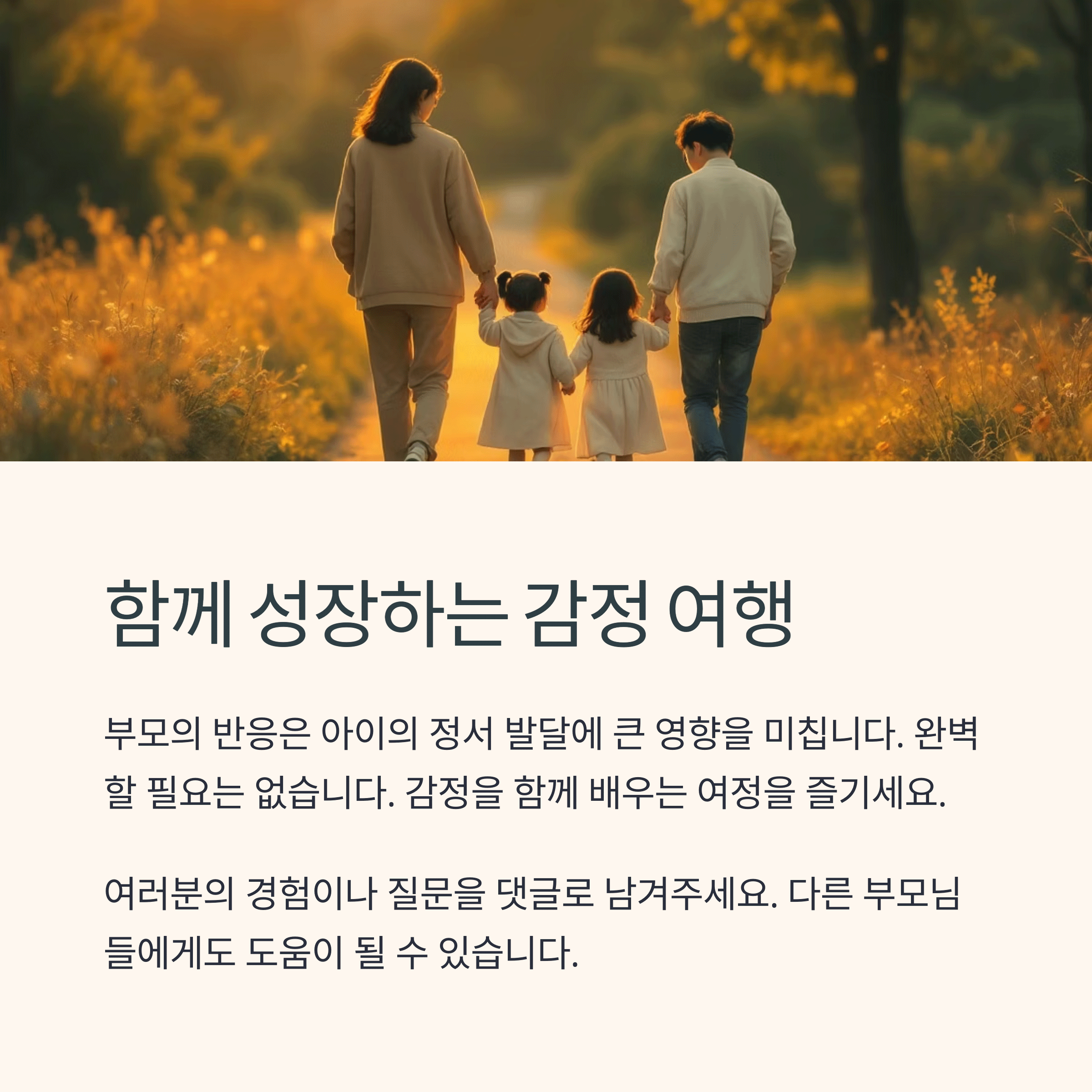 | 슬픔, 분노, 짜증 등 다양한 감정 언어 활용 | 즉각 반응보다 호흡 후 대응하는 습관 | 감정 일기 등 부모의 감정 표현 연습 |