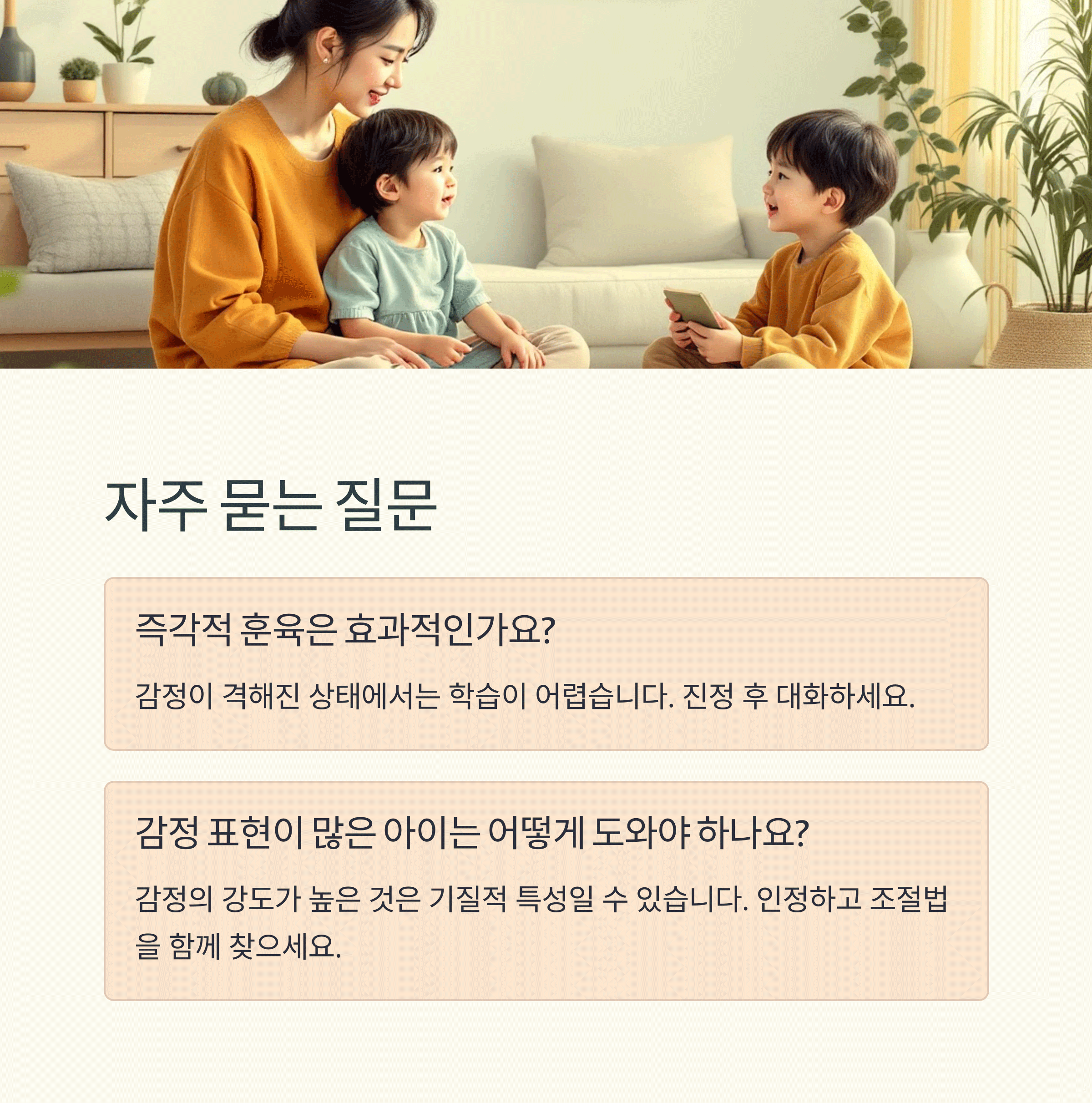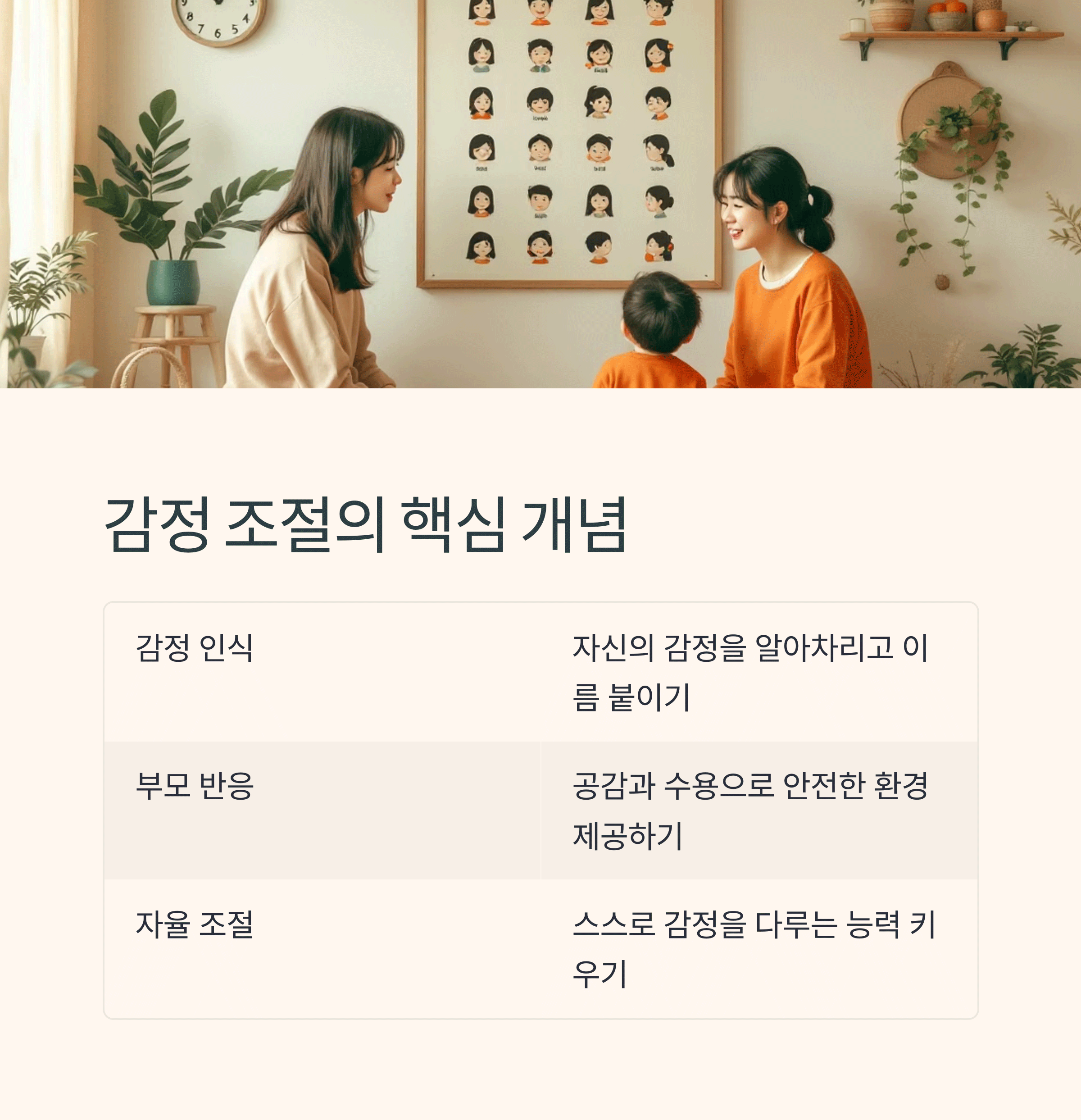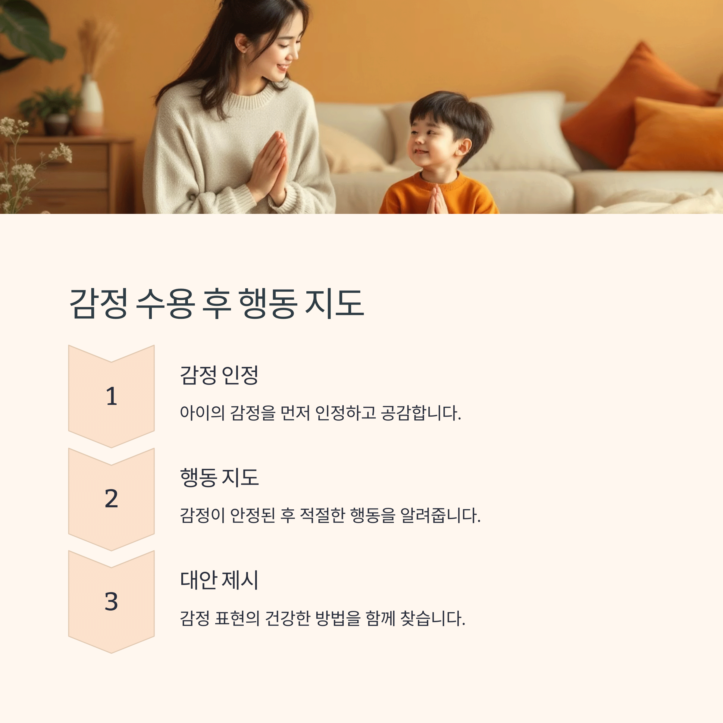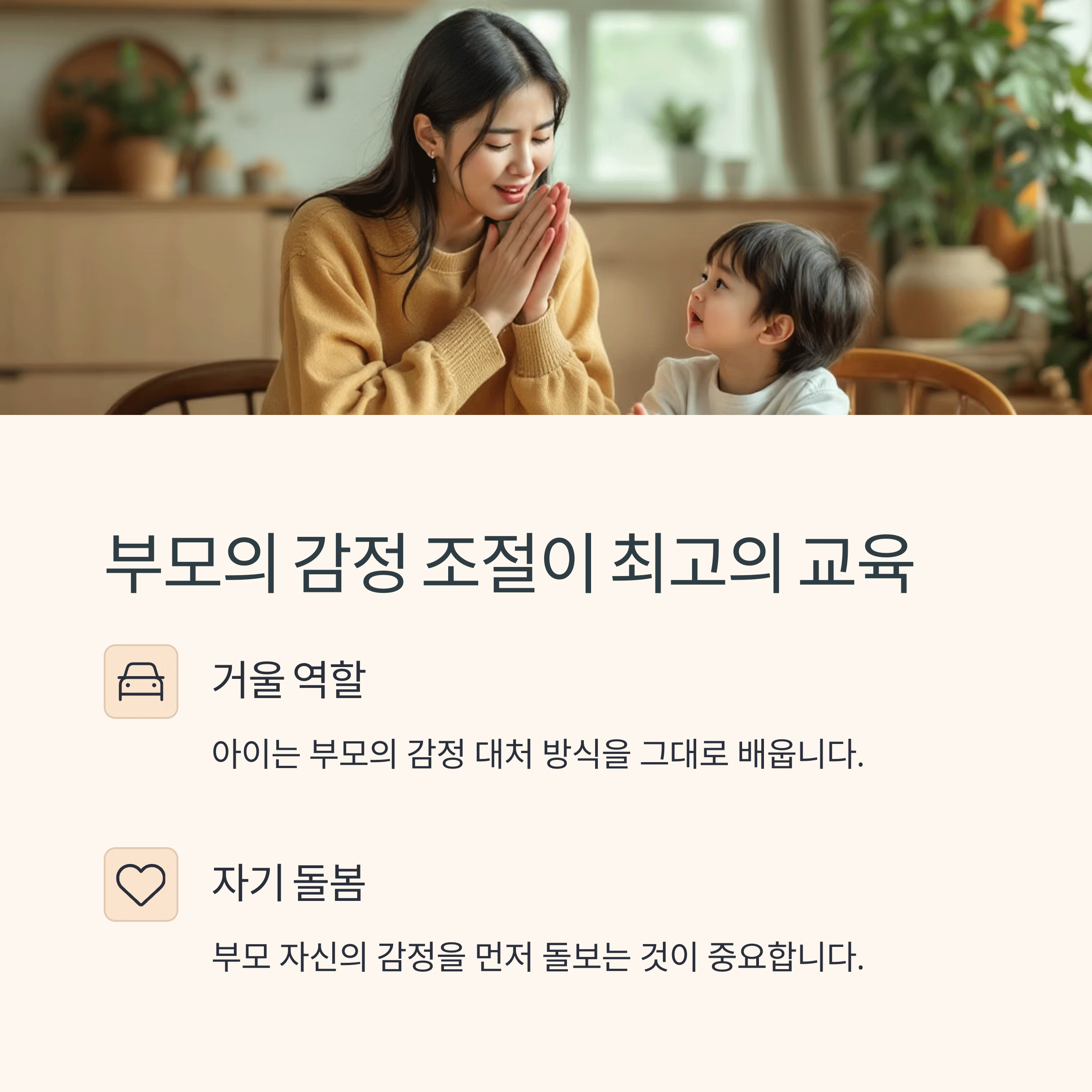 | 아이의 감정을 이름 붙여주고 설명하는 연습 | 감정을 먼저 수용한 후 행동 지도하기 | 부모의 자기조절이 아이에게 모범이 됨 |