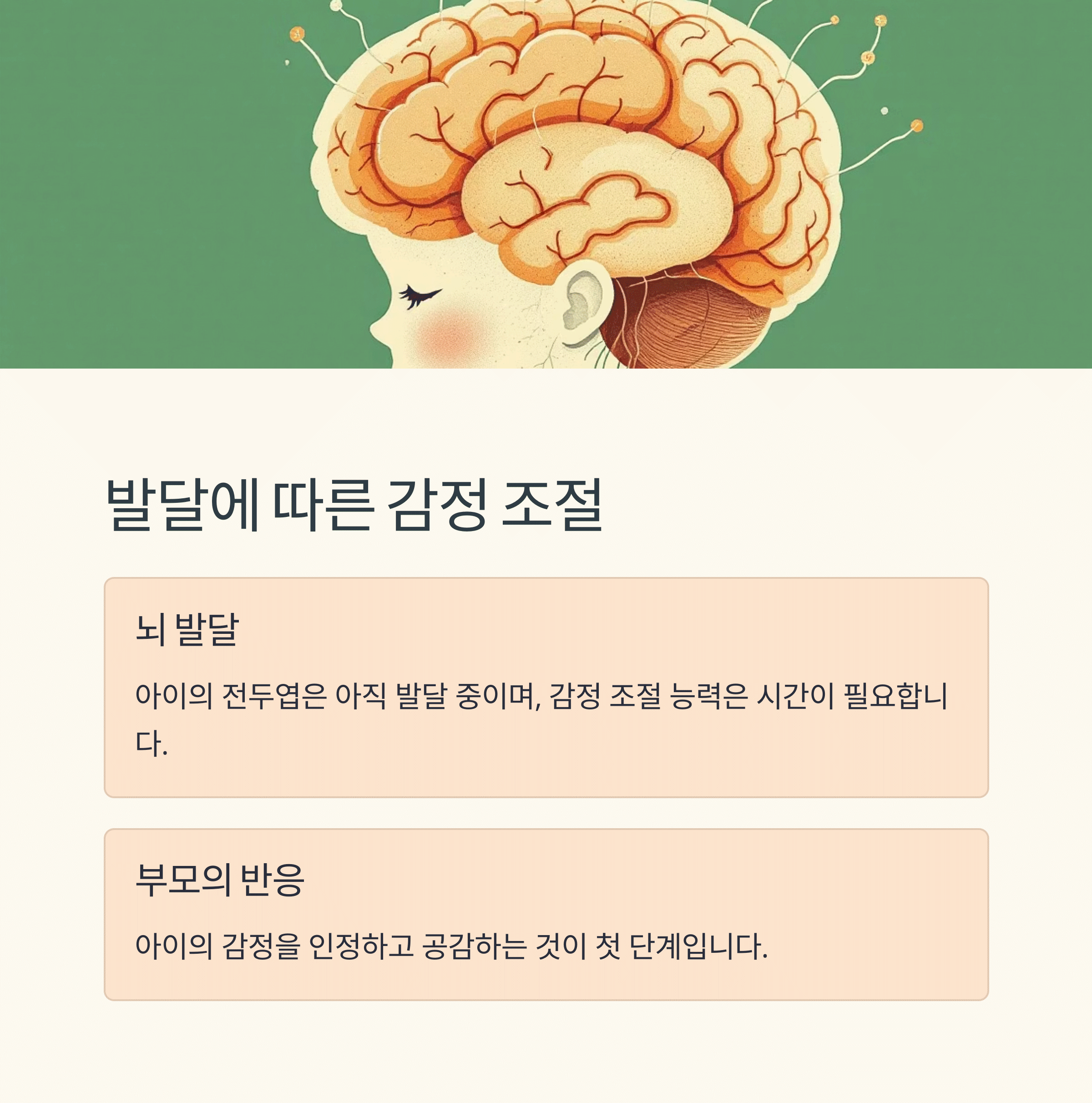 아이가 감정을 조절하지 못하고 울거나 짜증을 낼 때, 대부분의 부모님들은 그 순간을 조용히 넘어가거나 문제 행동으로 인식해 훈육을 시작하게 됩니다. 하지만 이러한 행동은 단순한 반항이나 버릇이 아닙니다. 어린아이는 아직 자신의 감정을 인지하고 표현하는 능력이 충분히 발달하지 않았습니다. 특히 5세 이하의 경우, 전두엽의 기능이 미성숙하여 순간적인 감정 폭발이 자주 일어날 수 있습니다. 중요한 것은 이런 상황에서 부모가 차분하게 감정을 받아들이고, 아이의 신호를 이해하려는 태도입니다.
