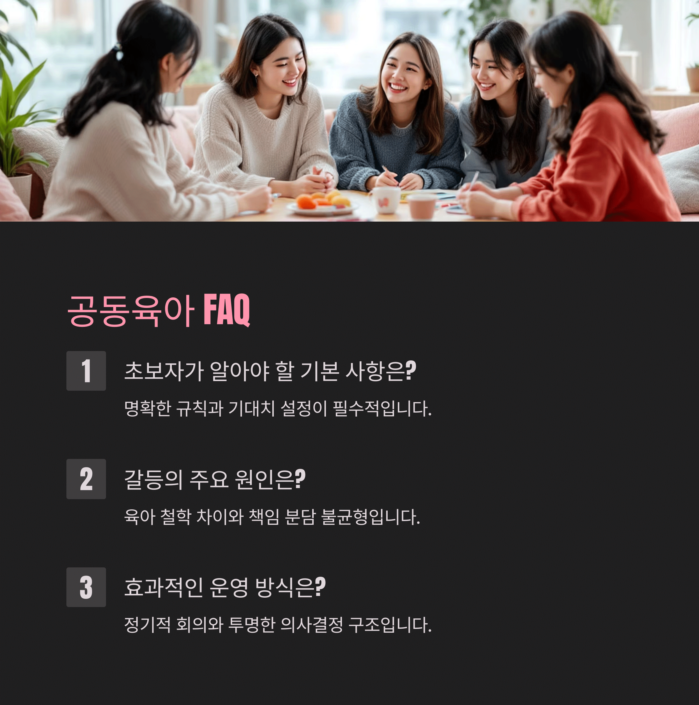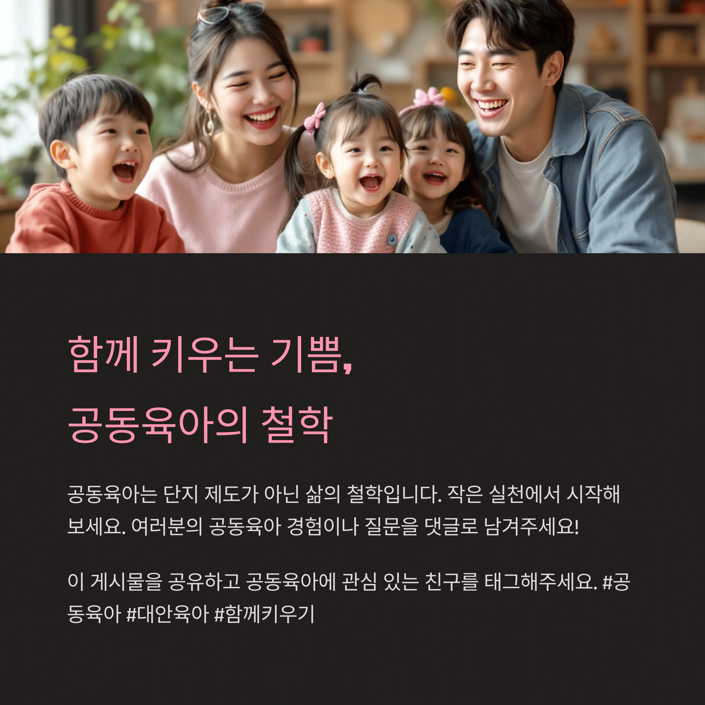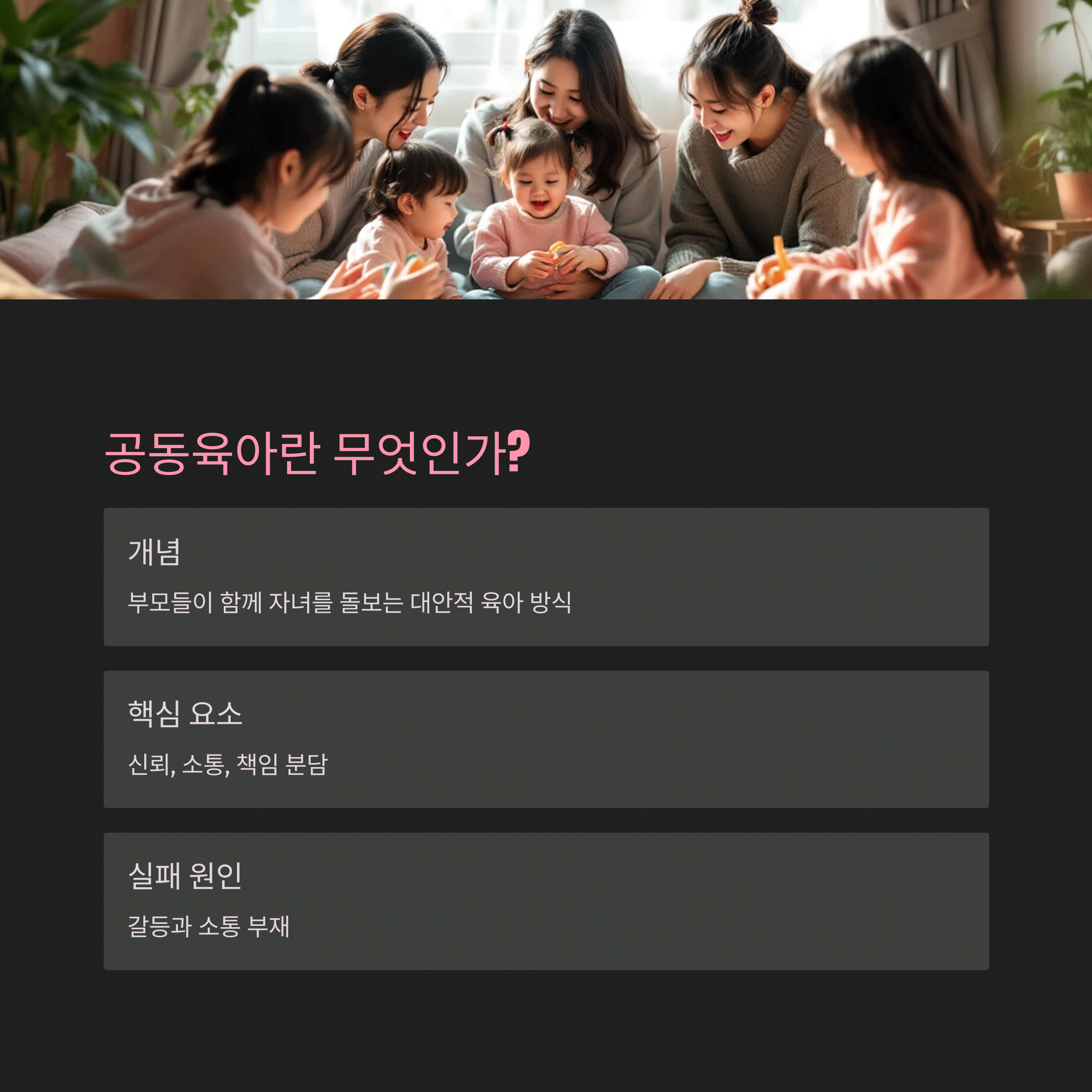 | 공동육아란? | 가족이 함께 모여 자녀를 공동 양육하는 방식입니다. |