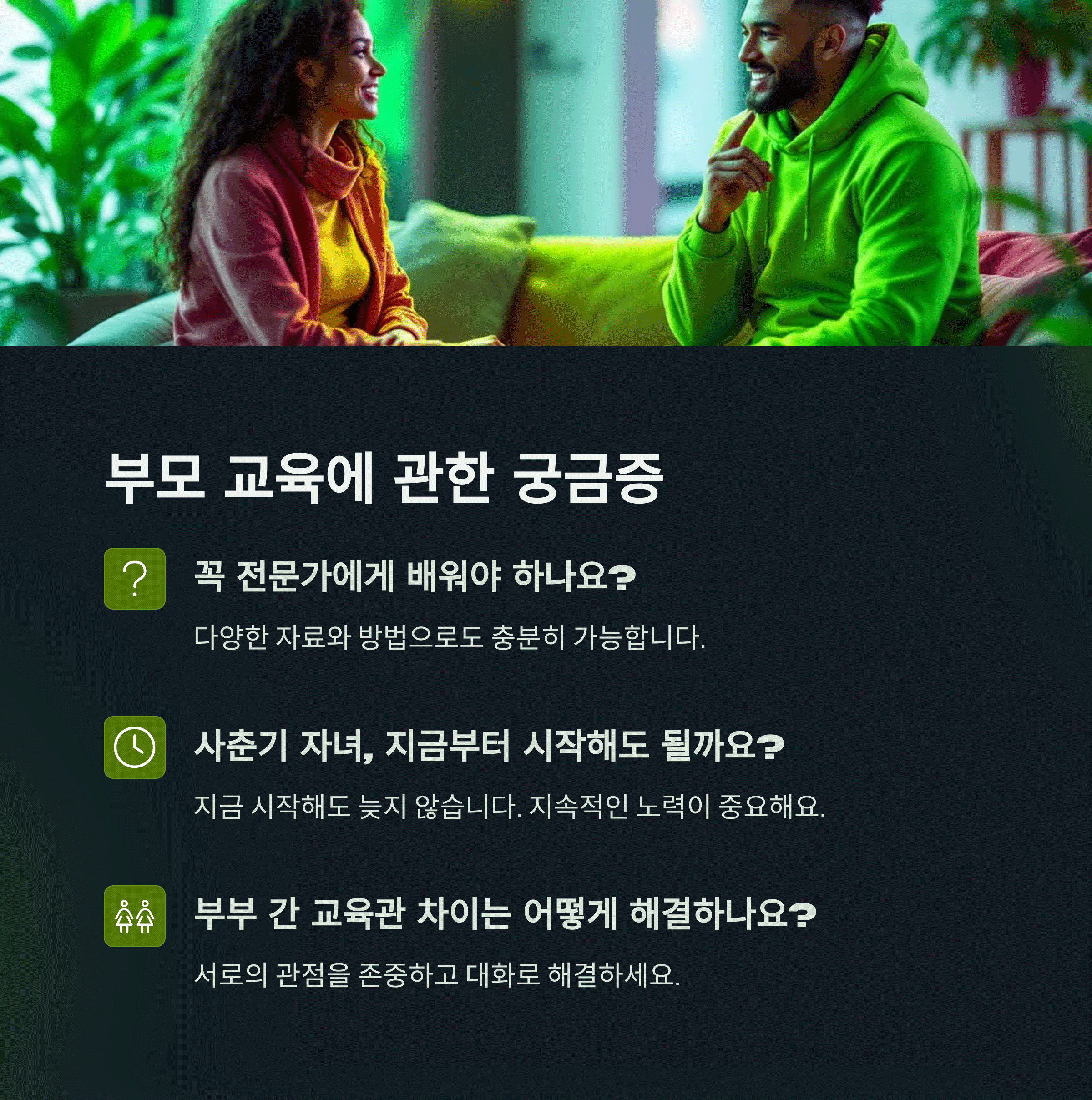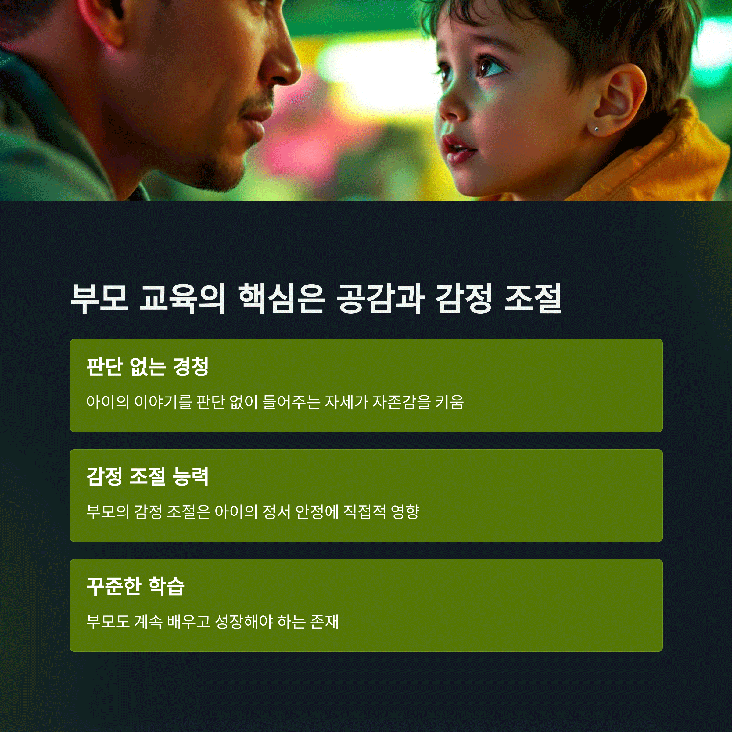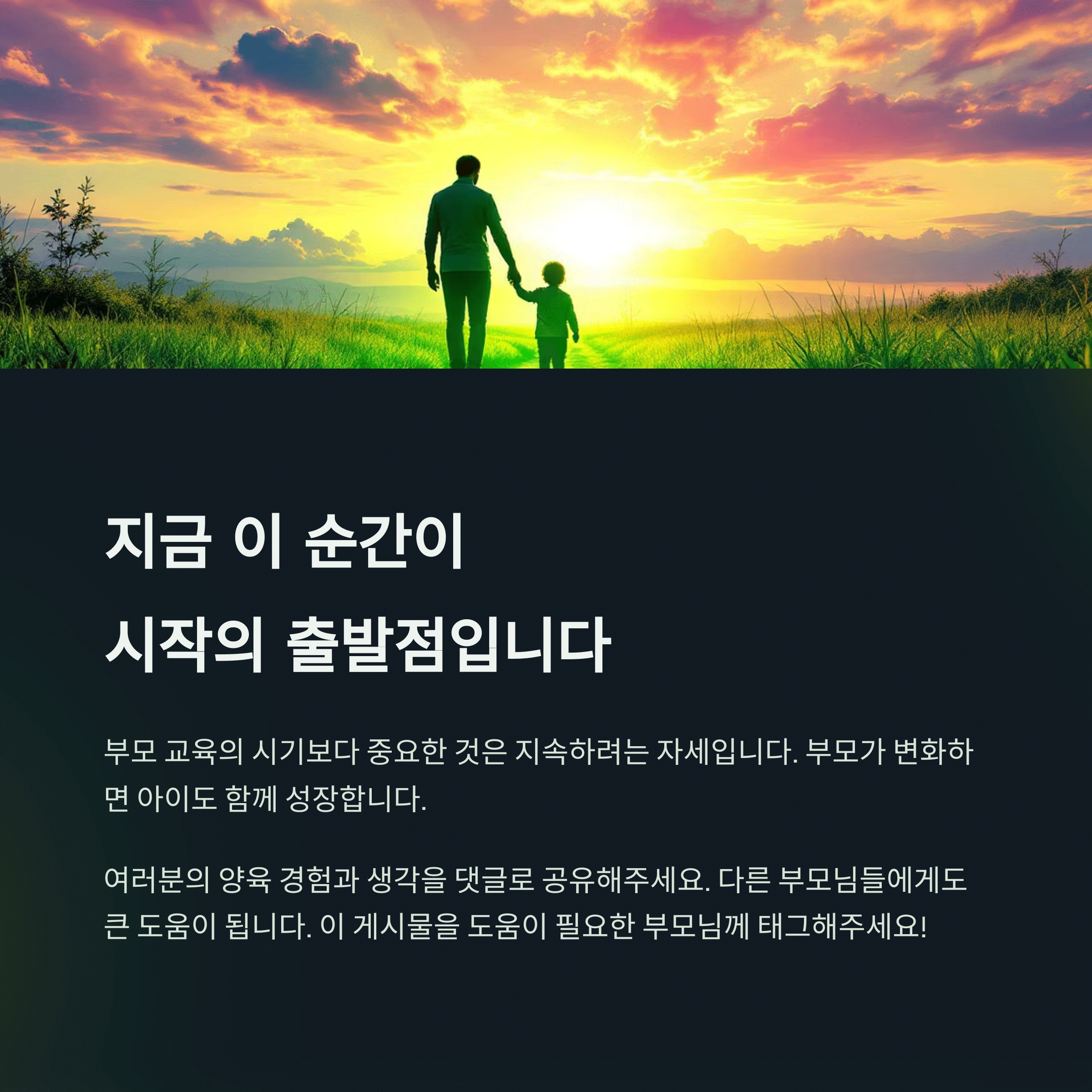 | 교육의 핵심 | 공감, 소통, 꾸준한 실천이 부모 교육의 열쇠입니다. |