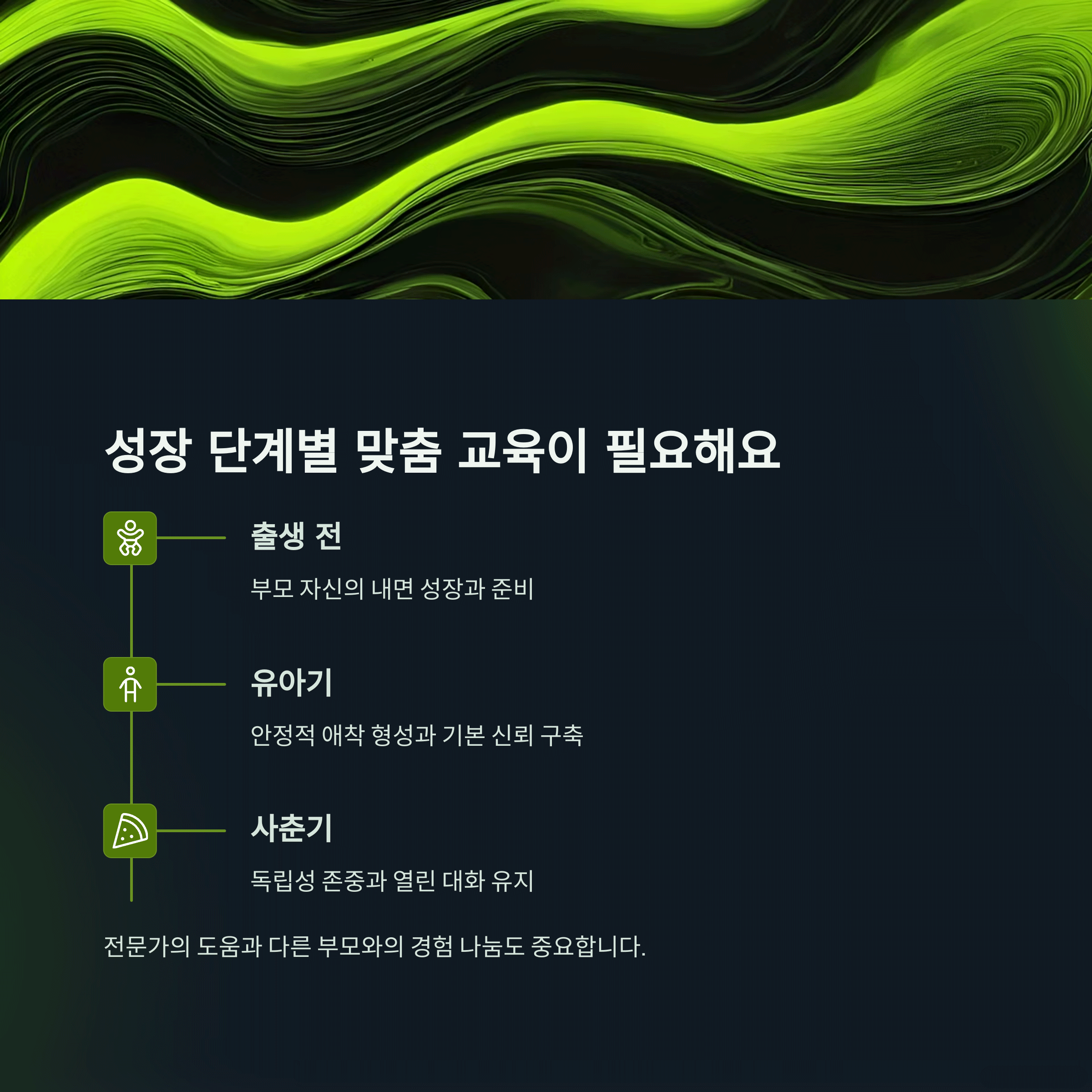| 임신 중 또는 그 이전부터가 가장 이상적 | 공감, 경청, 감정 조절 | 교육 프로그램 참여, 독서, 대화 연습 |