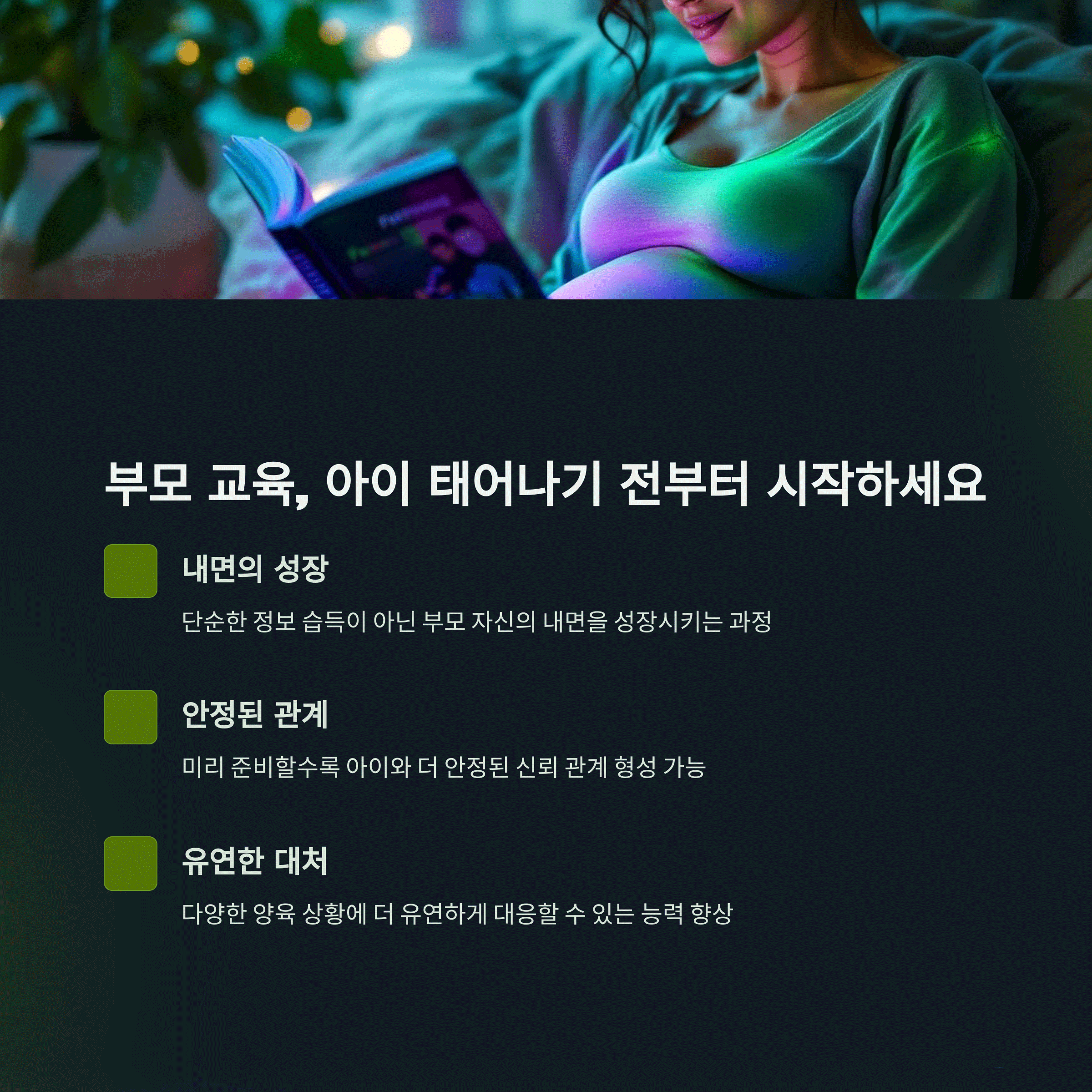 | 출산 후라도 늦지 않음 | 부모의 자기 인식 강화 | 전문가와의 상담, 경험 나눔 |