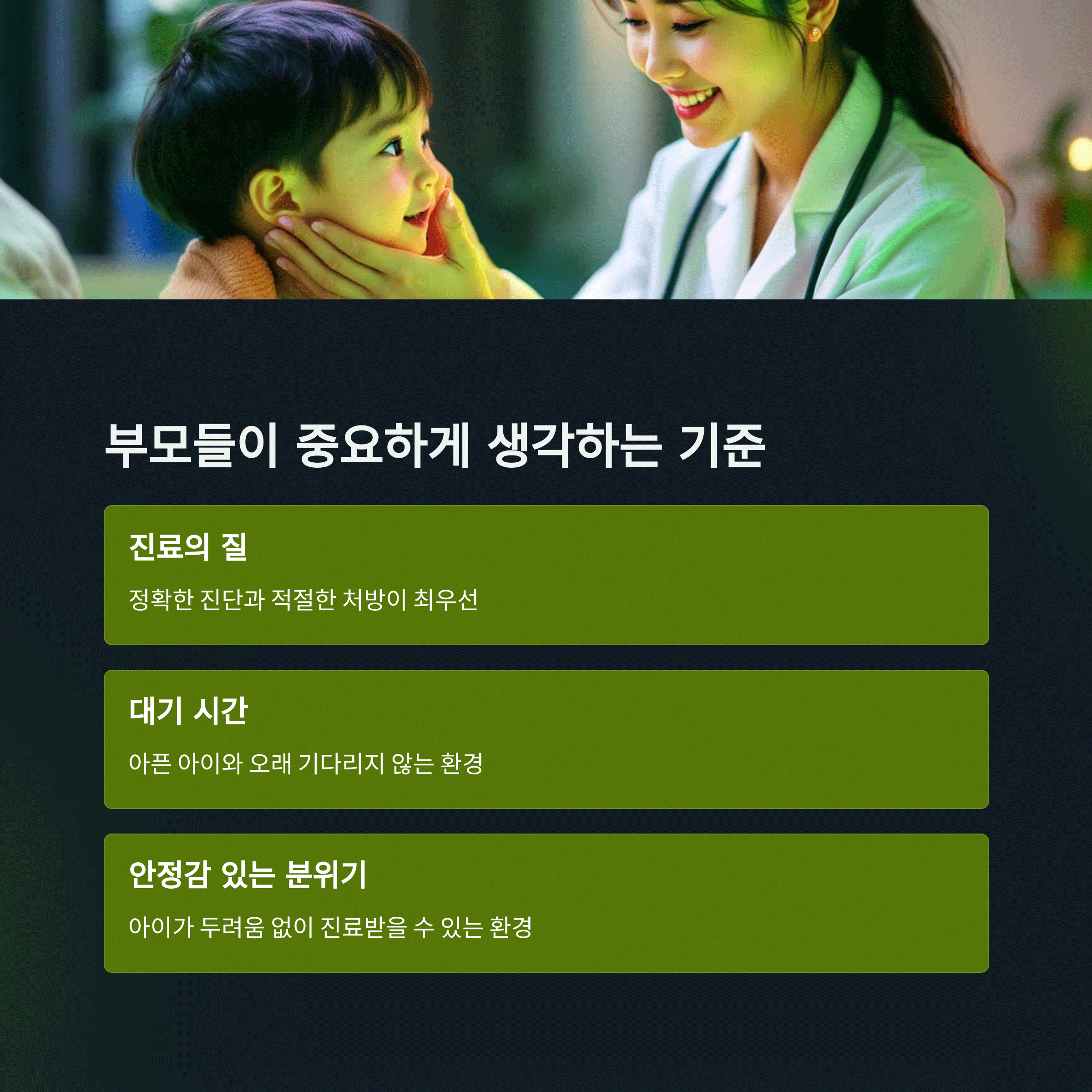 또 하나 주목할 점은 병원의 시스템과 환경입니다. 요즘은 모바일 예약 가능 여부, 대기시간 표시 시스템 등 IT 기반의 편의성이 병원 선택의 큰 기준이 됩니다. 공간의 청결도, 대기실 분위기, 아이가 편안하게 기다릴 수 있는 장난감이나 그림책이 있는지 여부 등 세세한 부분들이 아이의 컨디션에 직접적인 영향을 미치기 때문입니다. 이런 요소들이 만족스러운 병원은 자연스럽게 입소문을 타게 되고 지역 엄마들 사이에서 ‘꼭 가야 할 병원’으로 자리잡습니다.