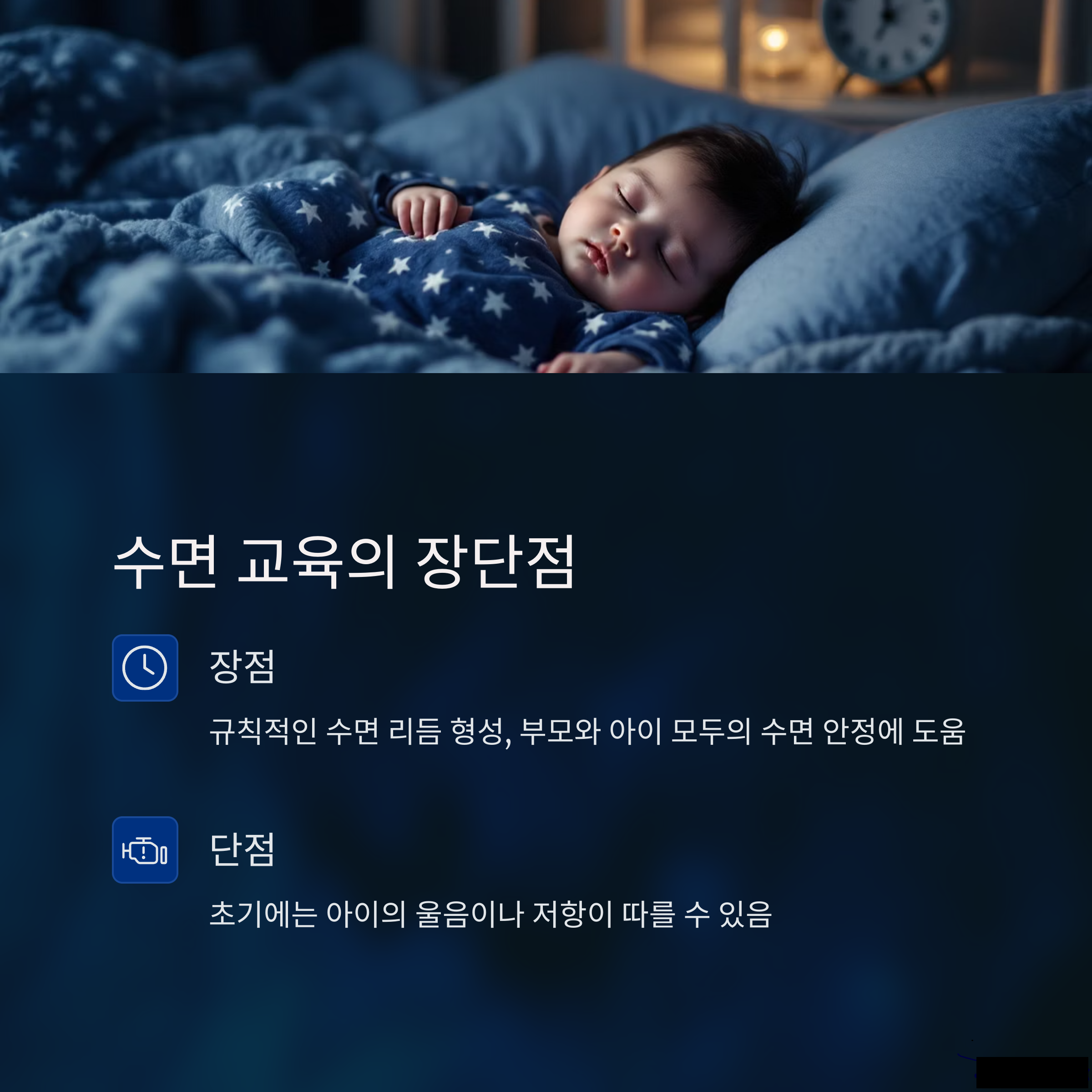 | 수면 교육 | 규칙과 루틴으로 아이의 수면을 학습시키는 방법입니다. |