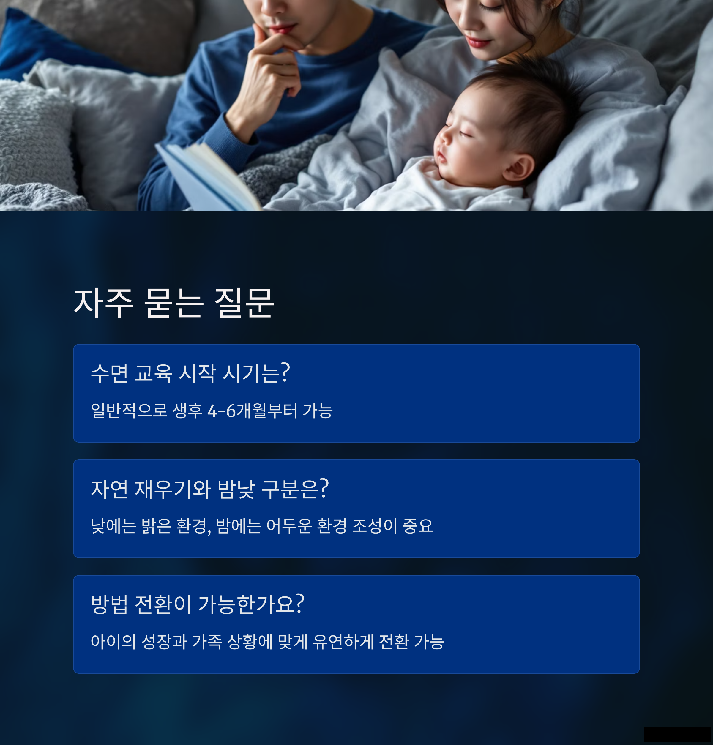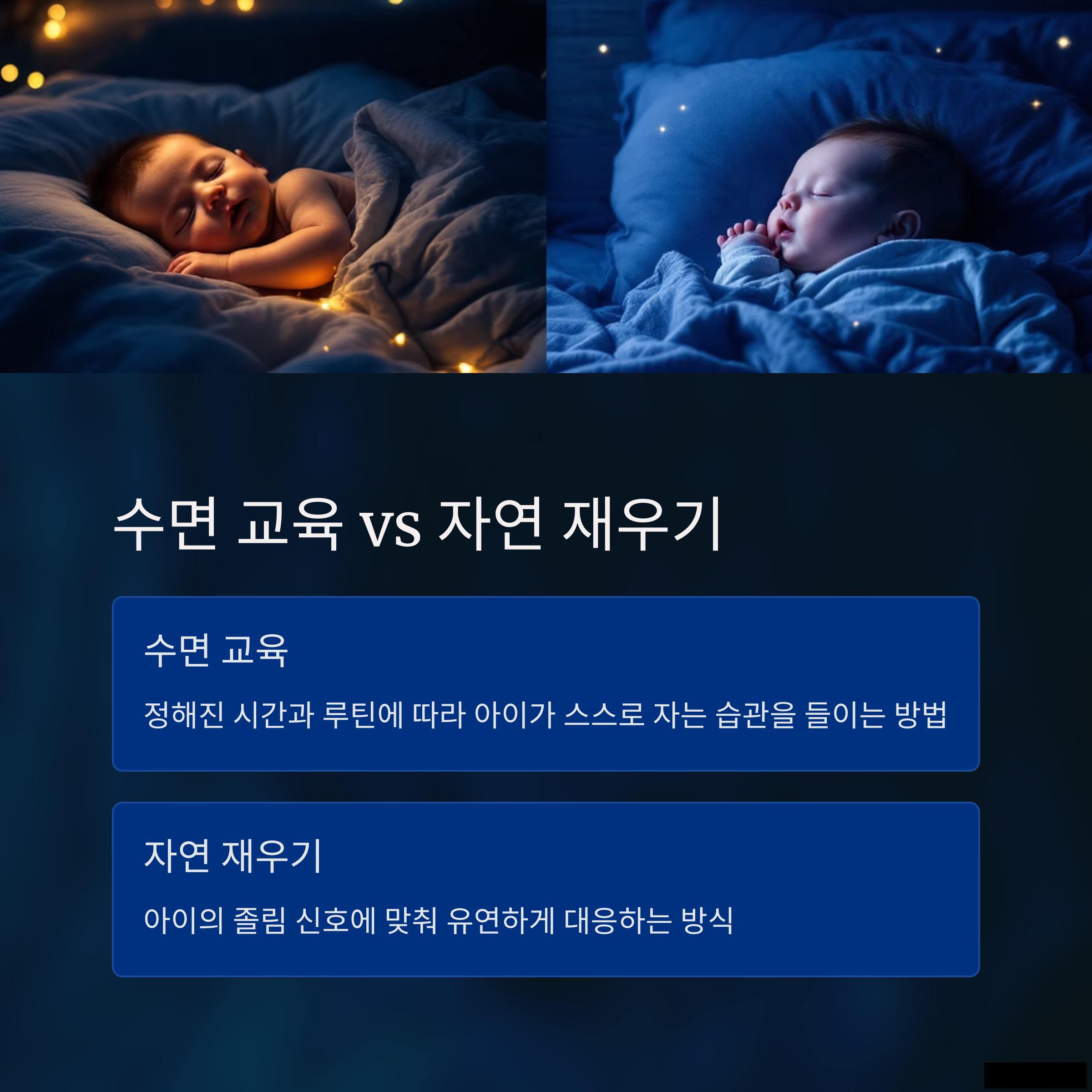 | 일정한 시간에 재우는 습관을 형성합니다. | 아이의 졸림 신호에 맞춰 유연하게 대응합니다. | 수면 전 루틴을 통해 안정감을 제공합니다. |