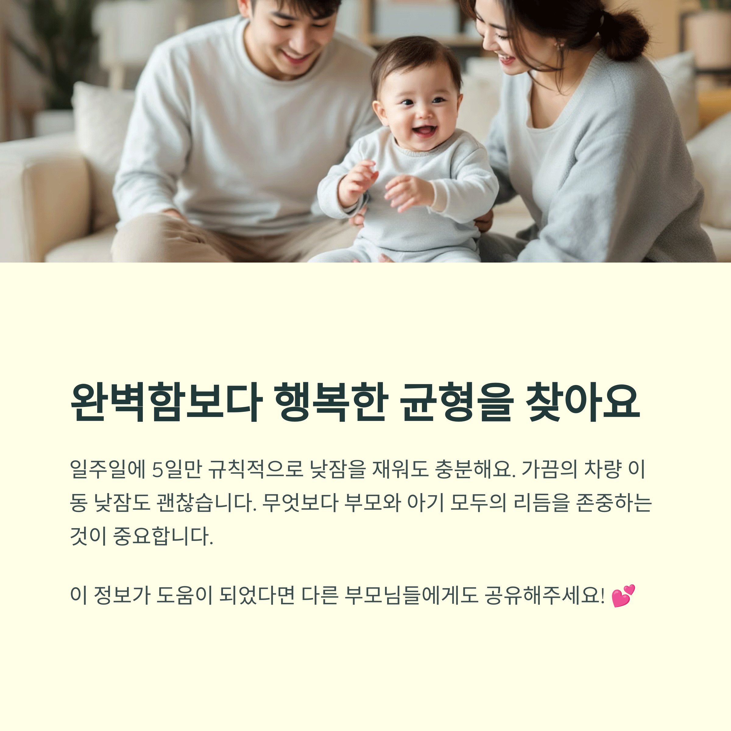 수면 신호를 잘 파악하고, 아기의 졸음 큐를 인식하는 것이 가장 중요합니다. 낮잠 시간은 '정확한 시각'보다 '일관된 패턴'을 중심으로 조정되어야 하며, 아기와 부모의 삶의 리듬에 맞춘 유연한 접근이 오히려 긍정적인 영향을 줄 수 있습니다. 따라서 스스로에게 너무 엄격한 기준을 적용하기보다, 현실적인 수면 루틴을 찾는 것이 육아 스트레스를 줄이는 지름길입니다.