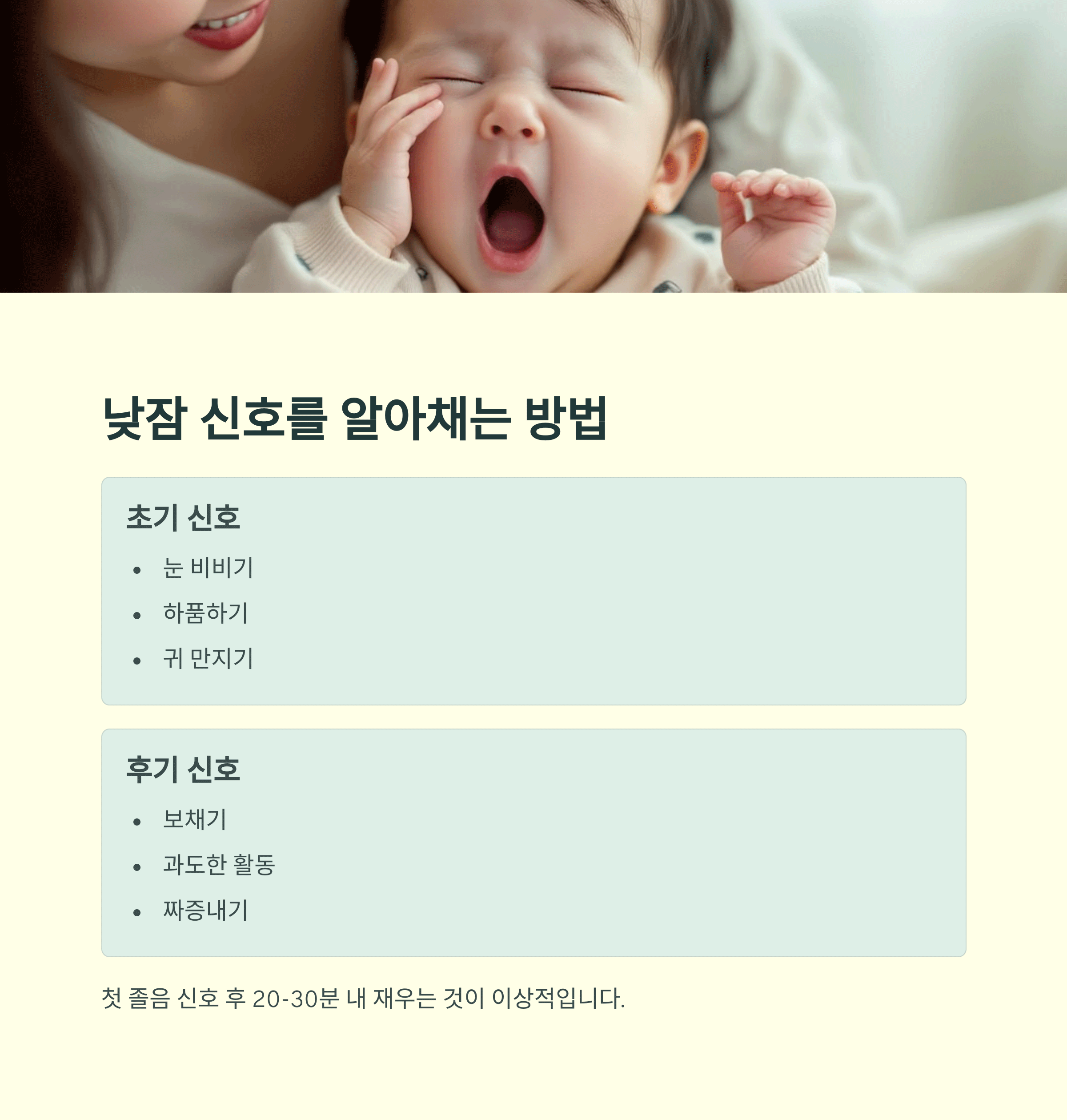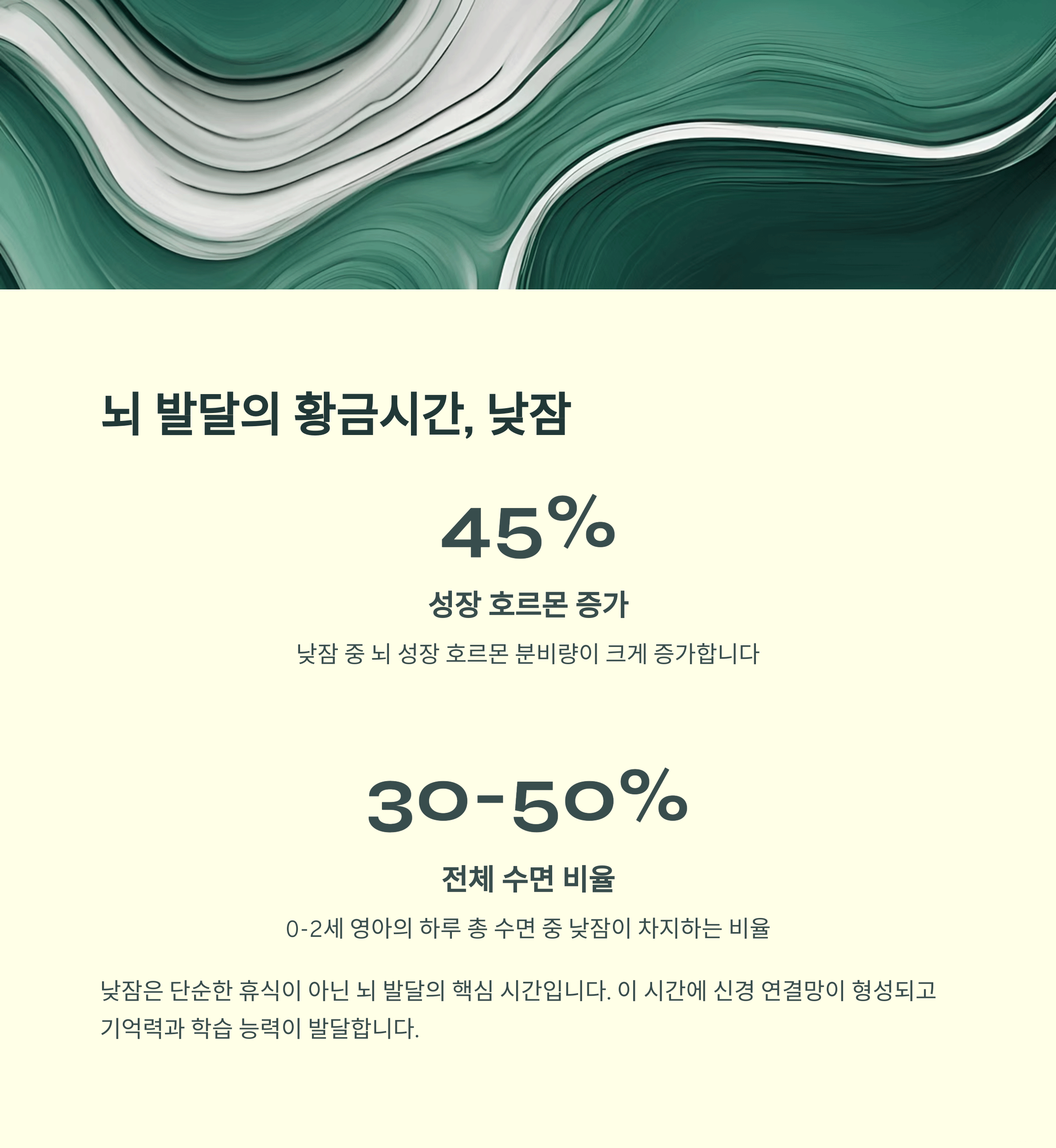 | 낮잠 중요성 | 낮잠은 아기 뇌 발달과 감정 조절에 매우 중요해요. |