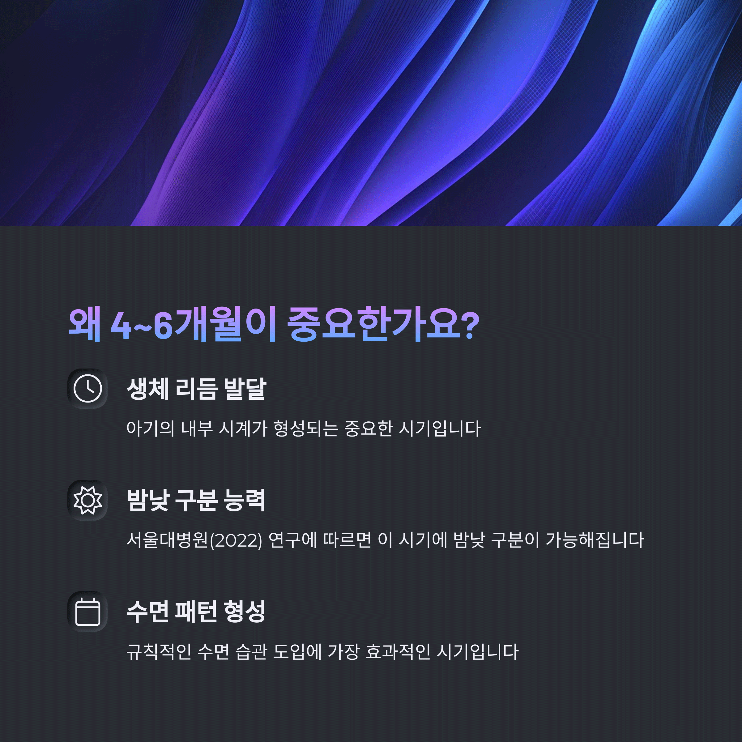 | 이 시기 아기 생체리듬이 자리 잡기 시작함 | 상황에 맞는 유연한 적용도 중요합니다. | 스트레스 없이 아이를 존중하는 태도가 필요 |