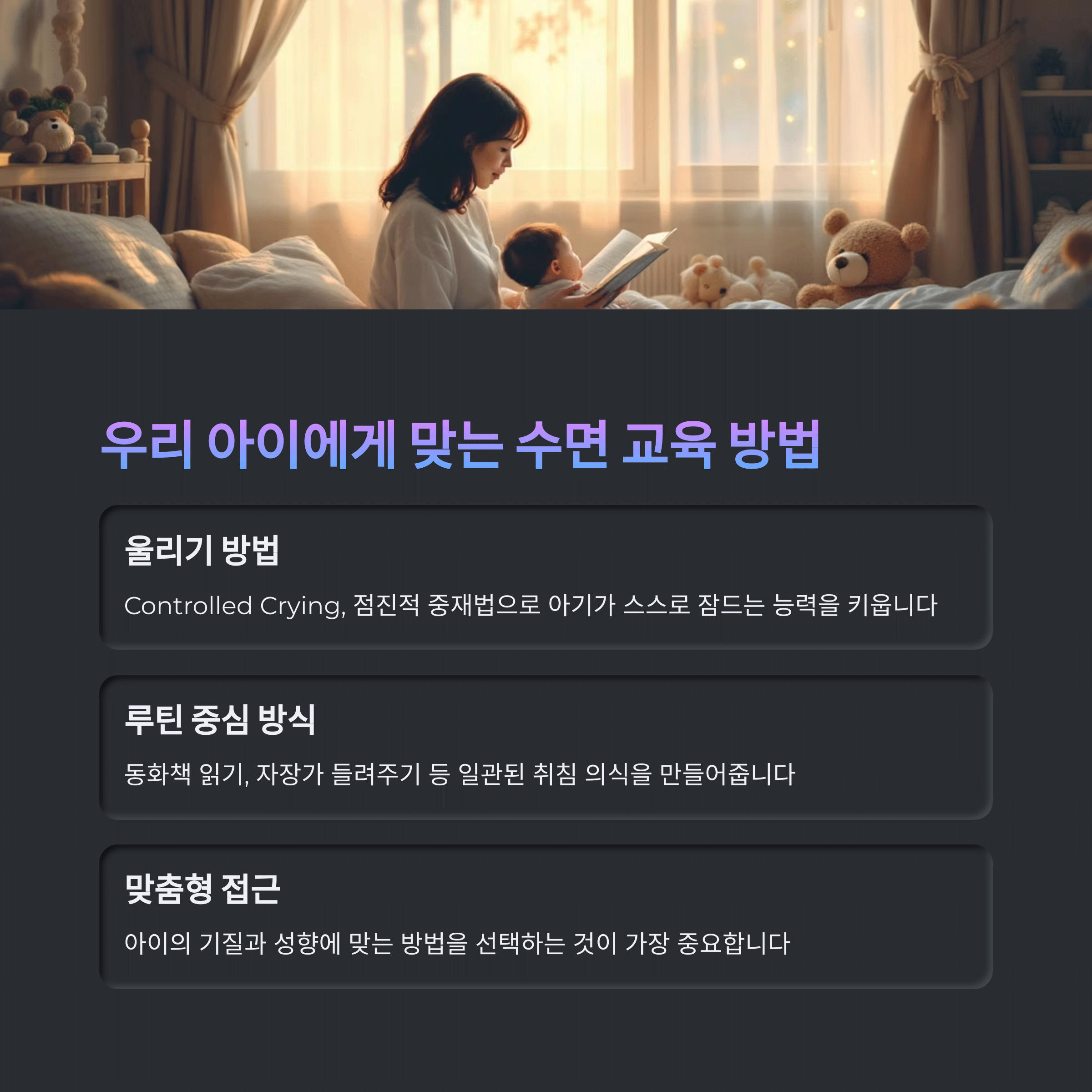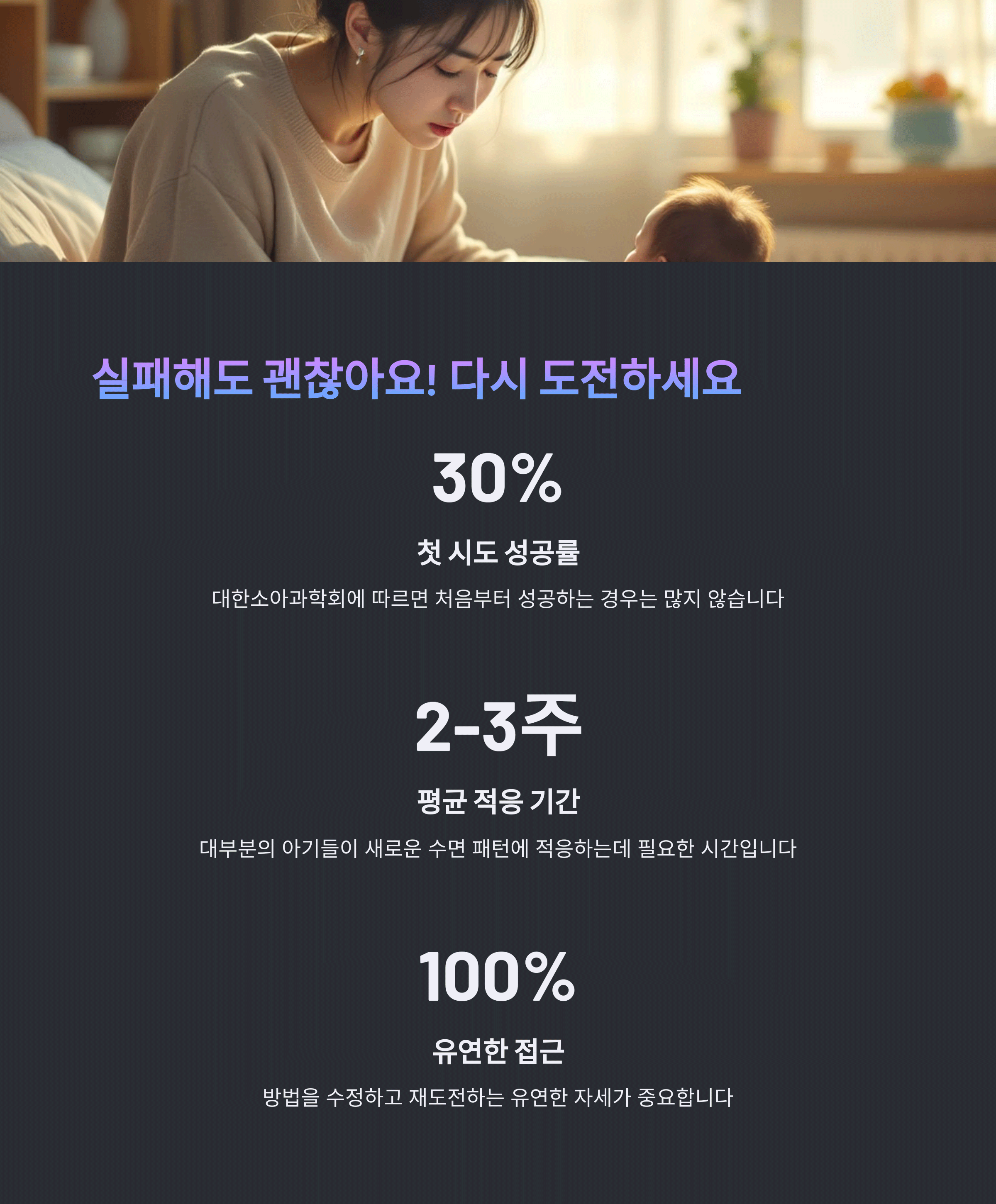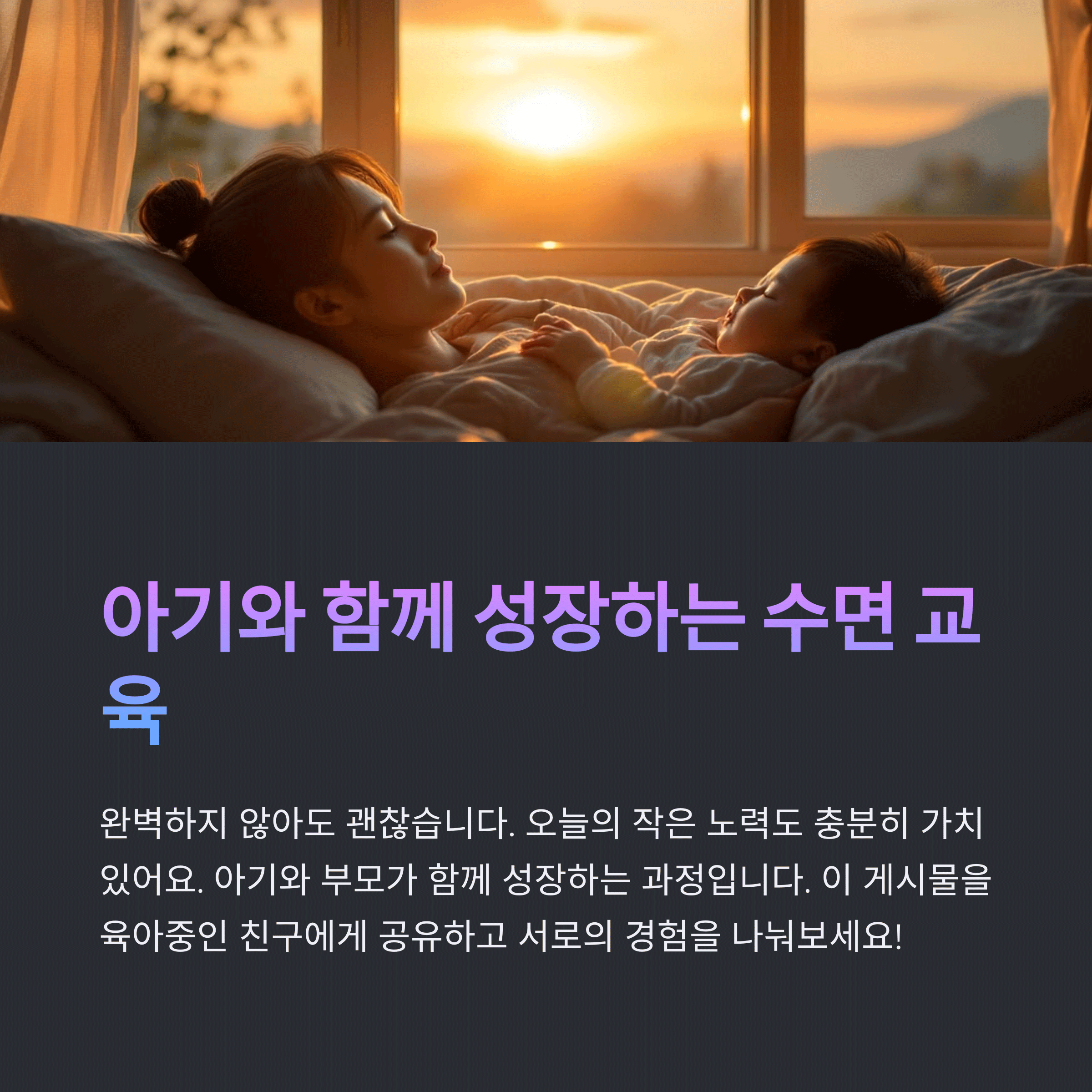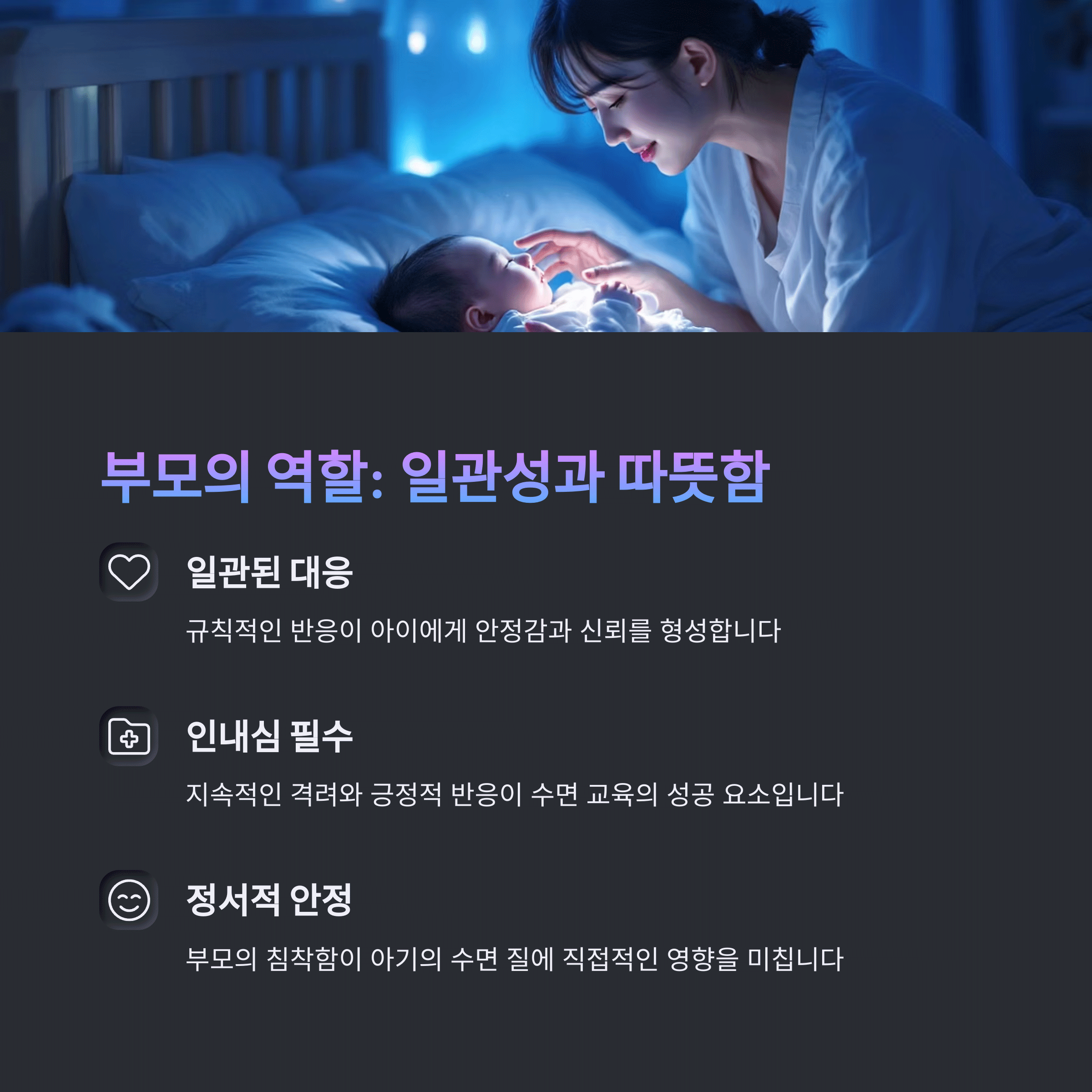 | 부모의 역할 | 일관된 패턴과 인내심이 수면 교육의 핵심입니다. |