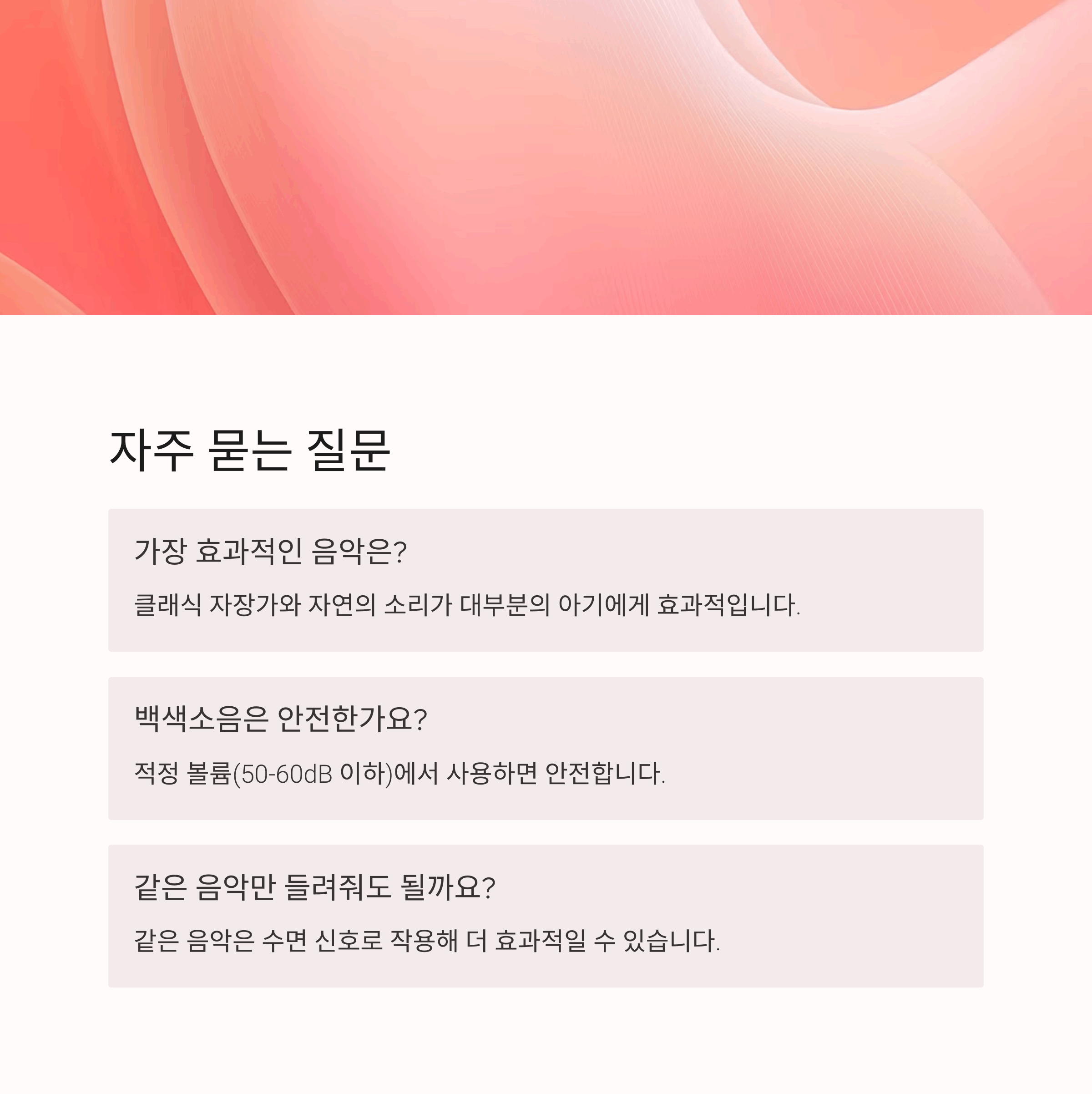 | 추천 음악 장르 | 클래식, 자연의 소리, 백색소음 등 추천됩니다. |