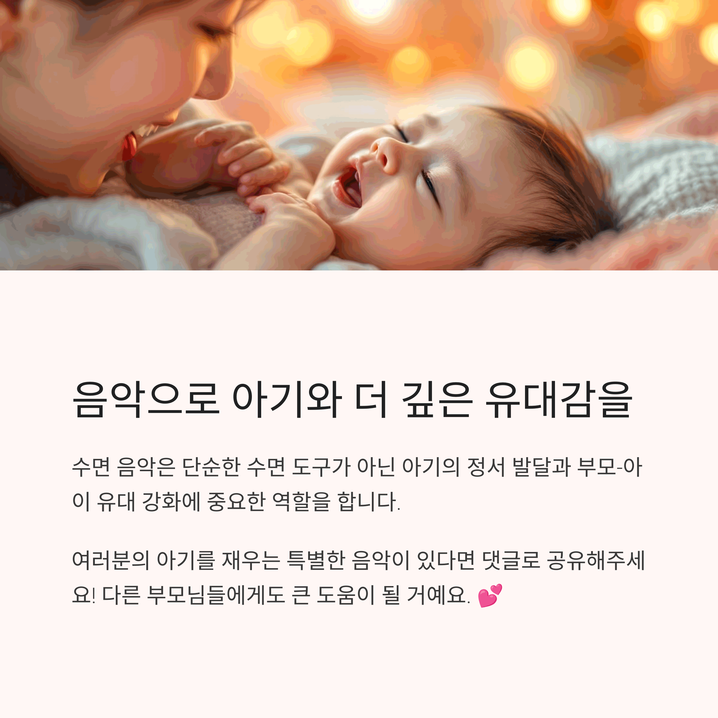 아기의 수면 환경은 단지 조용한 밤을 위한 수단이 아닌, 아이의 건강과 정서적 성장에 직접적인 영향을 미칩니다. 음악은 그 중심에서 중요한 역할을 하며, 부모와 아이 간의 유대 형성을 도와줍니다. 오늘 소개한 다양한 수면 음악 리스트를 참고하여 우리 아이에게 가장 편안한 음향 환경을 만들어주세요. 일정한 리듬, 부드러운 소리, 자연적인 감성은 깊은 수면을 부르며, 부모에게도 한숨 돌릴 수 있는 소중한 시간을 제공합니다. 지속적인 관심과 사랑 속에서, 음악은 우리 아이를 더 편안하게 안아주는 또 하나의 품이 됩니다.
