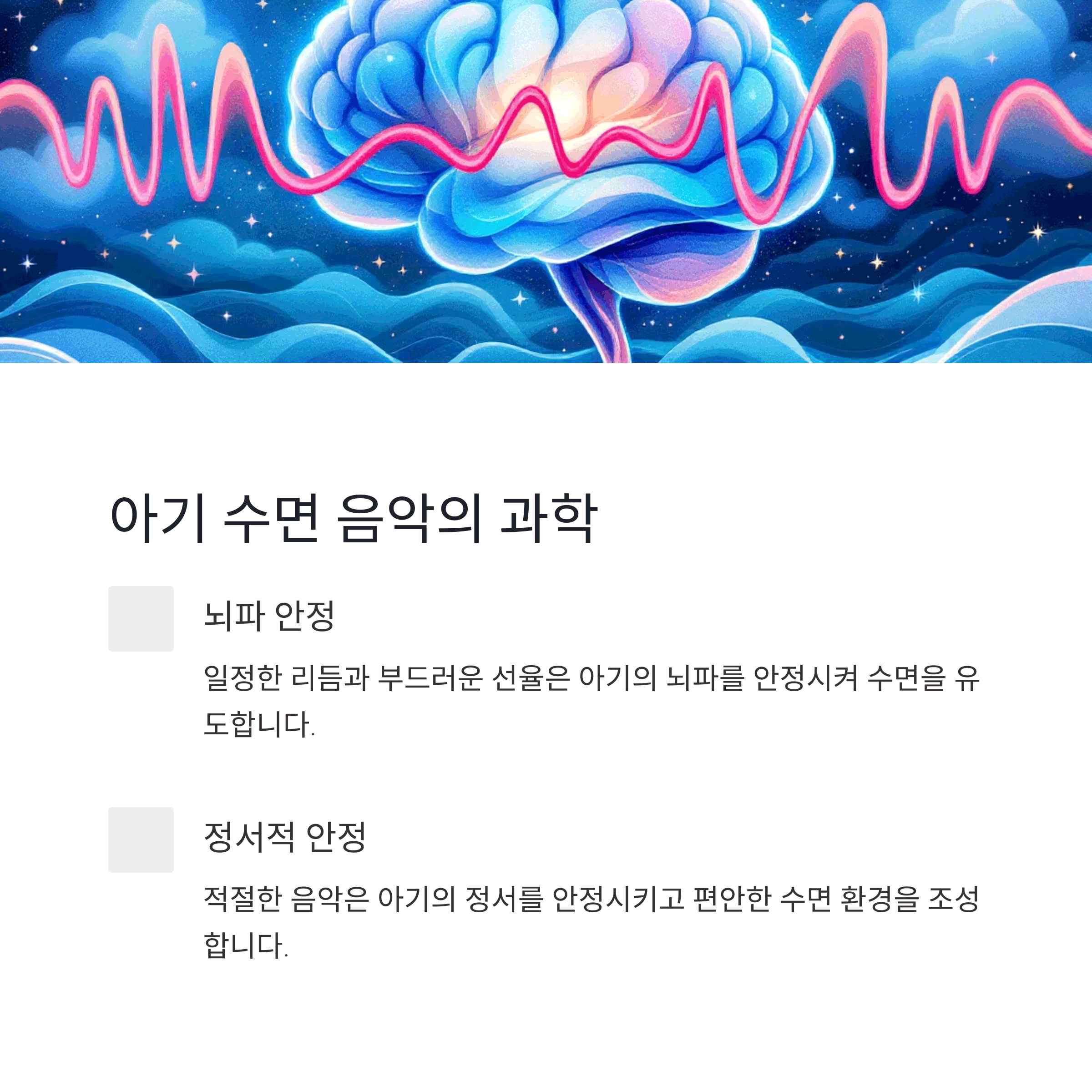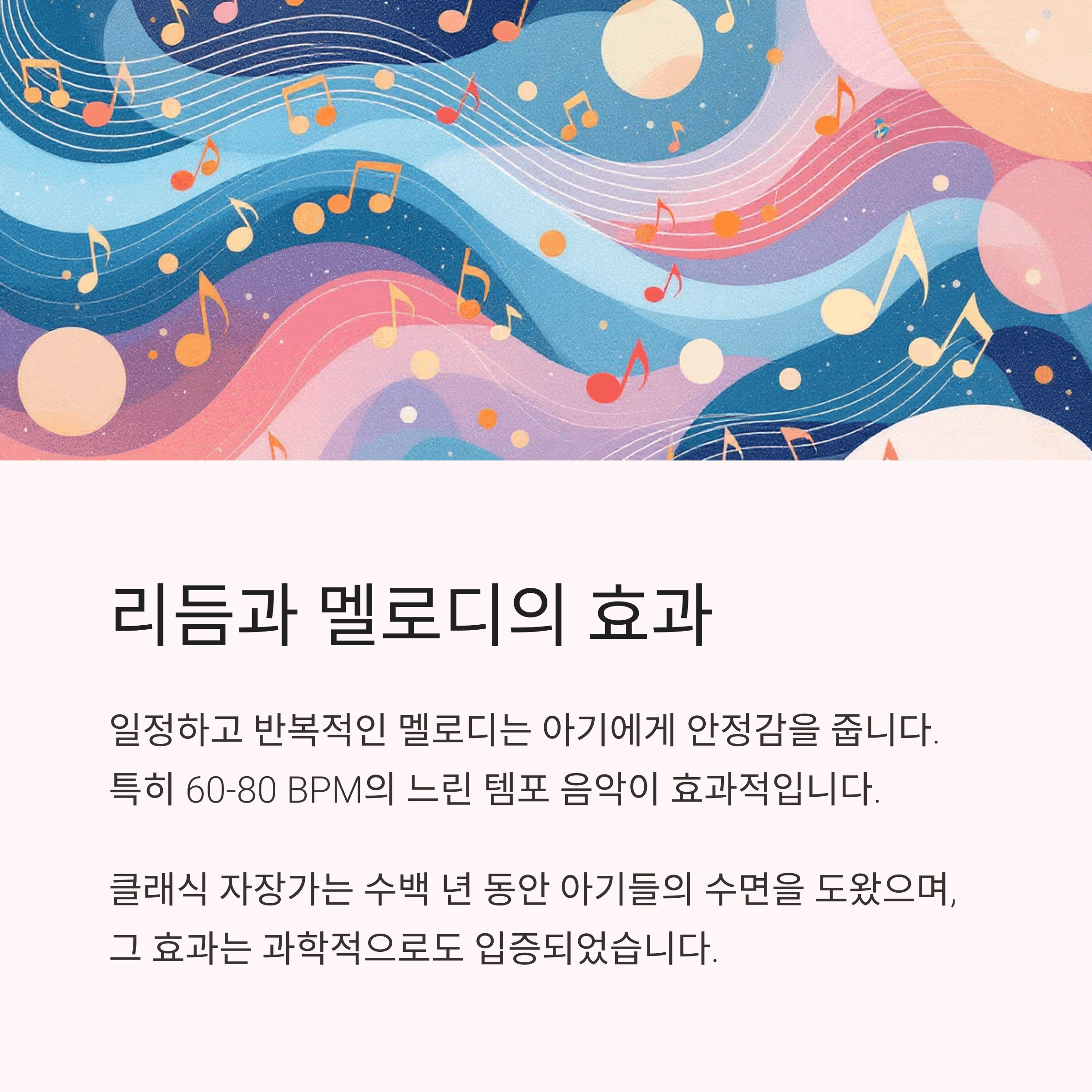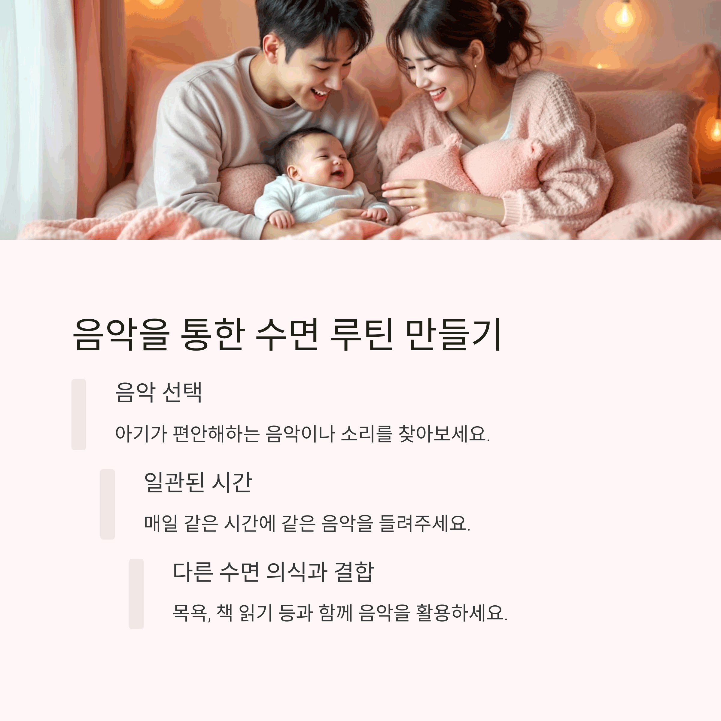 | 아기 수면에 좋은 음악 | 부드러운 멜로디와 일정한 리듬이 효과적입니다. |