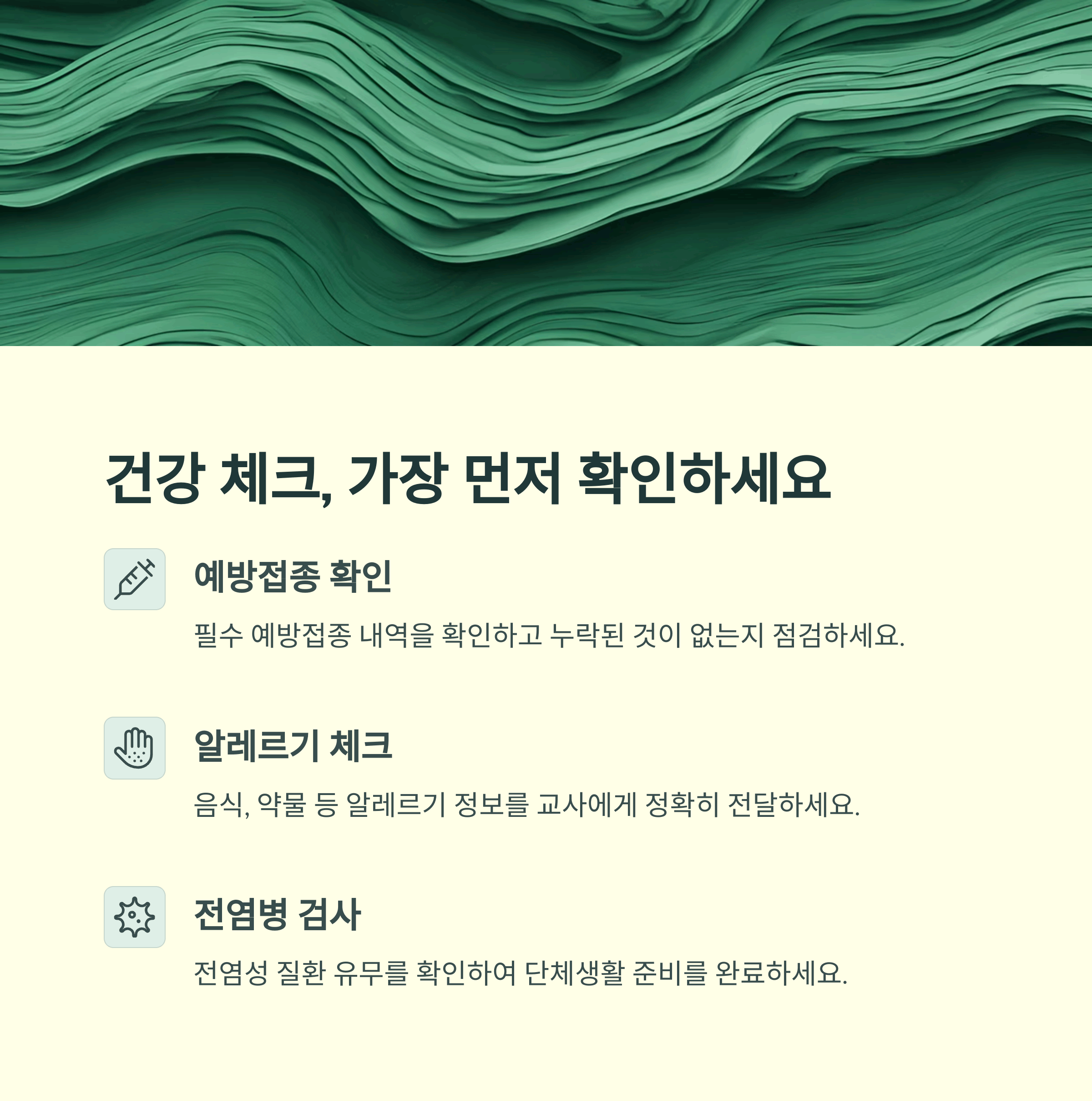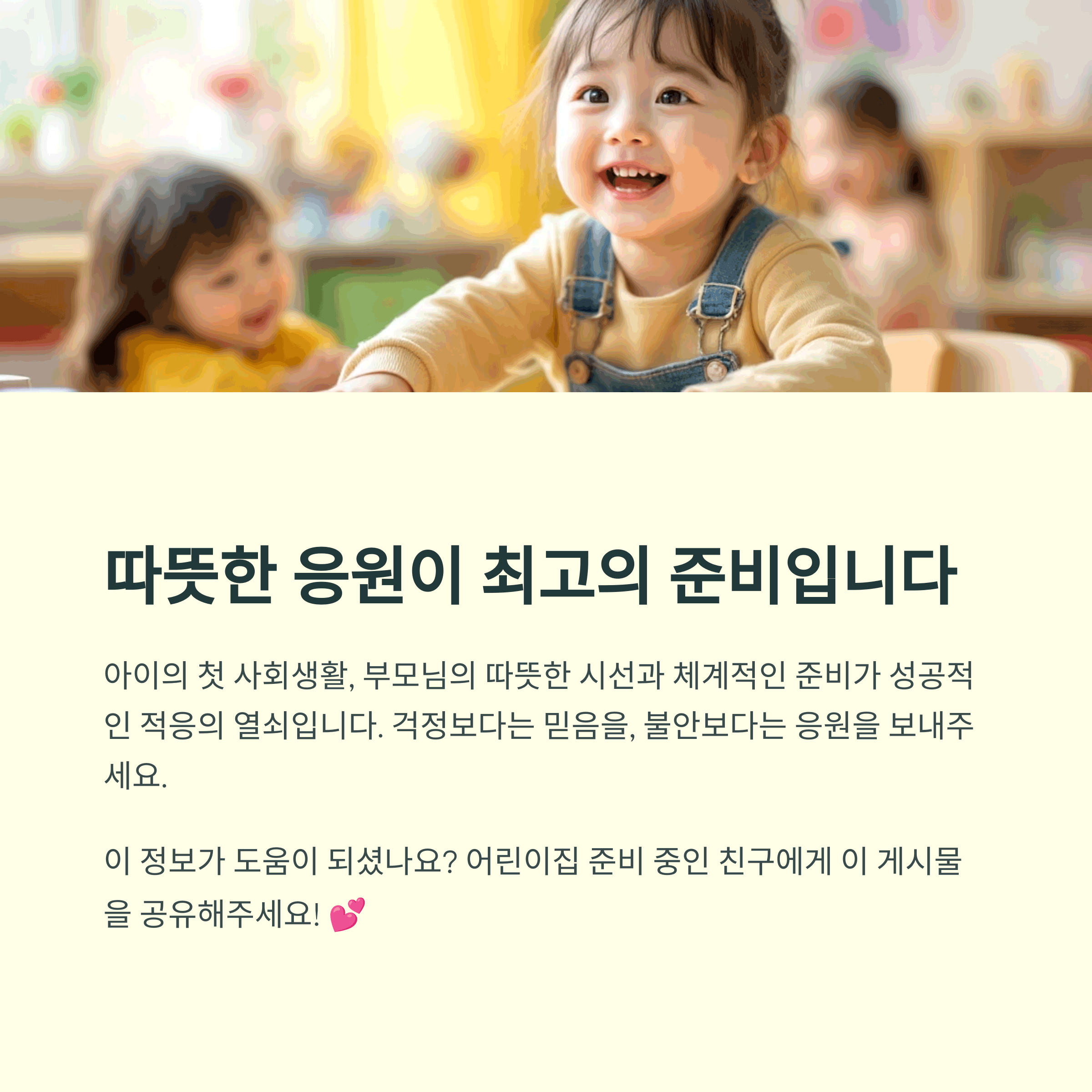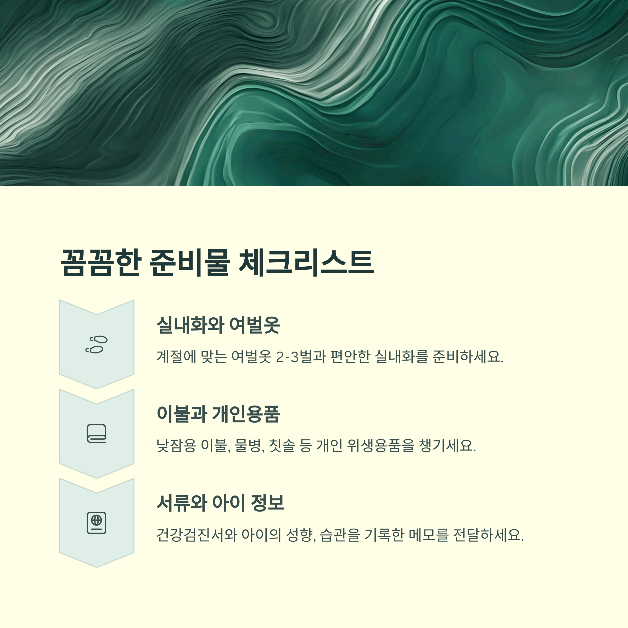 | 정기 예방접종 여부는 기본 확인 사항입니다. | 적응 전 대화, 체험 등원을 통한 불안 해소가 중요합니다. | 이불, 실내화, 여벌옷 등 물품 준비와 이름표 부착 필수입니다. |