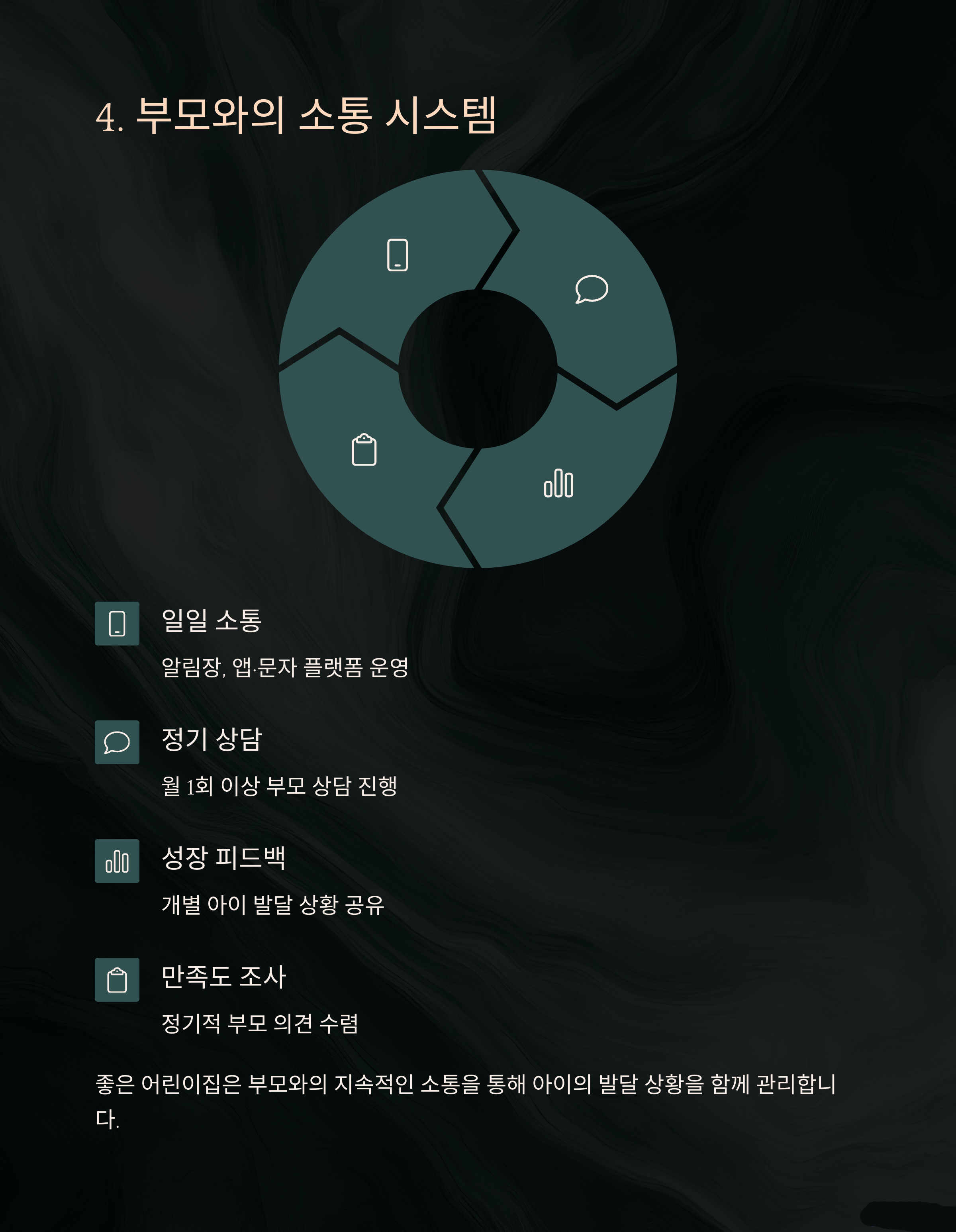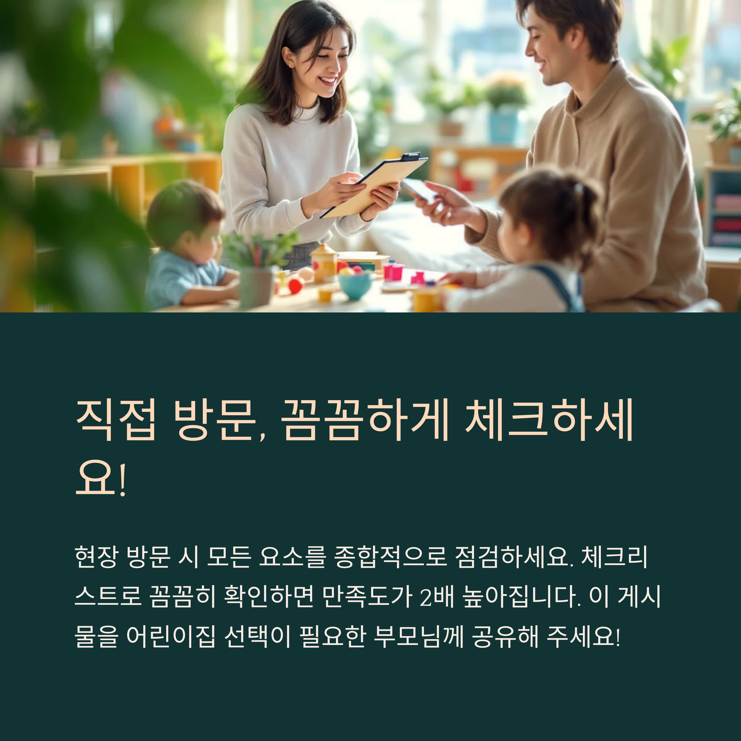 | 경력, 인성, 소통력 등 다각적 검토 필요 | 위생 관리 주기 및 응급 대응 체계 점검 | 알림장, 공유 시스템, 의견 수렴 여부 확인 |