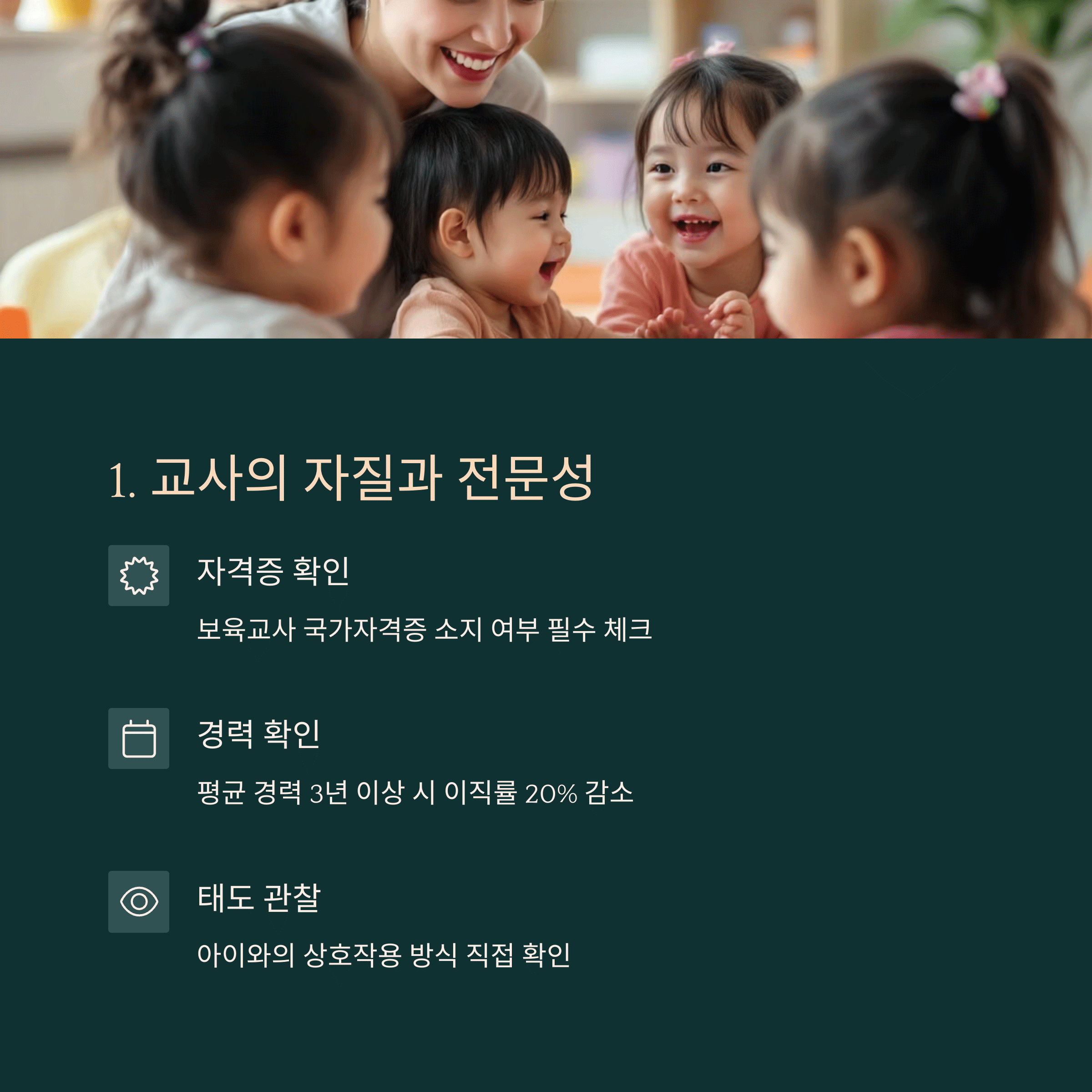 | 보육 교사의 자질 | 아이의 성장을 책임지는 교사의 경력과 태도 |