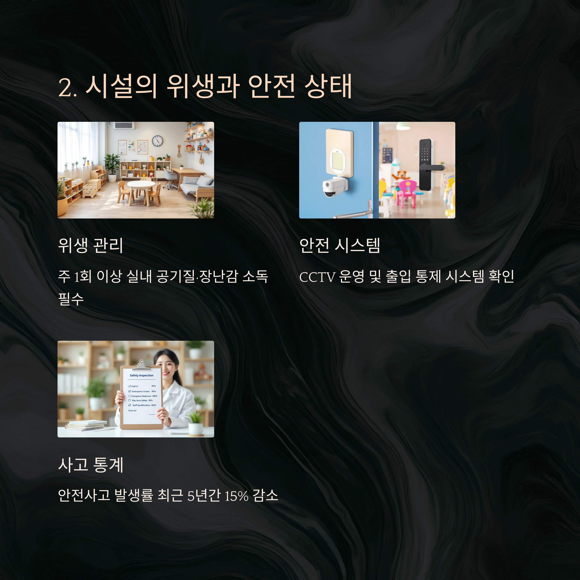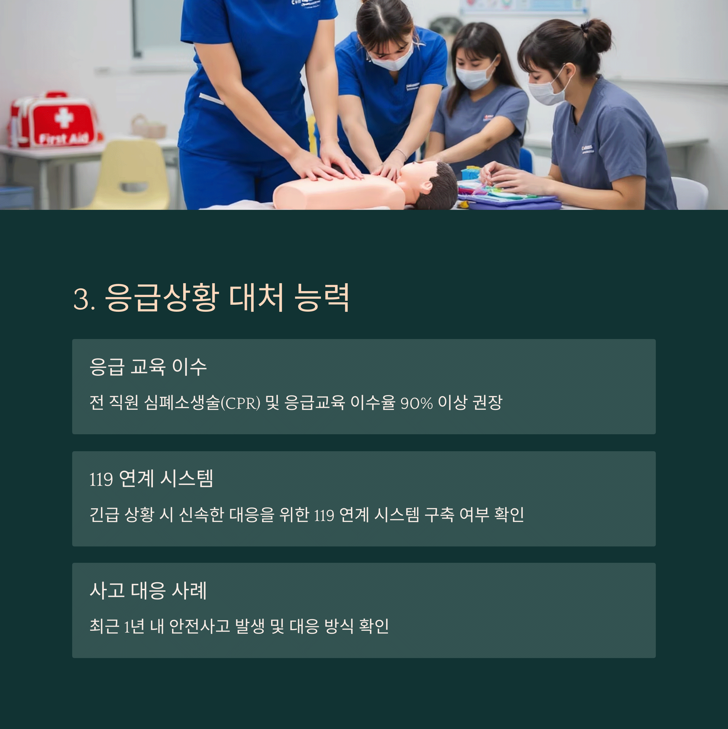 | 위생과 안전 관리 | 청결한 환경과 응급 상황 대응 체계 점검 |