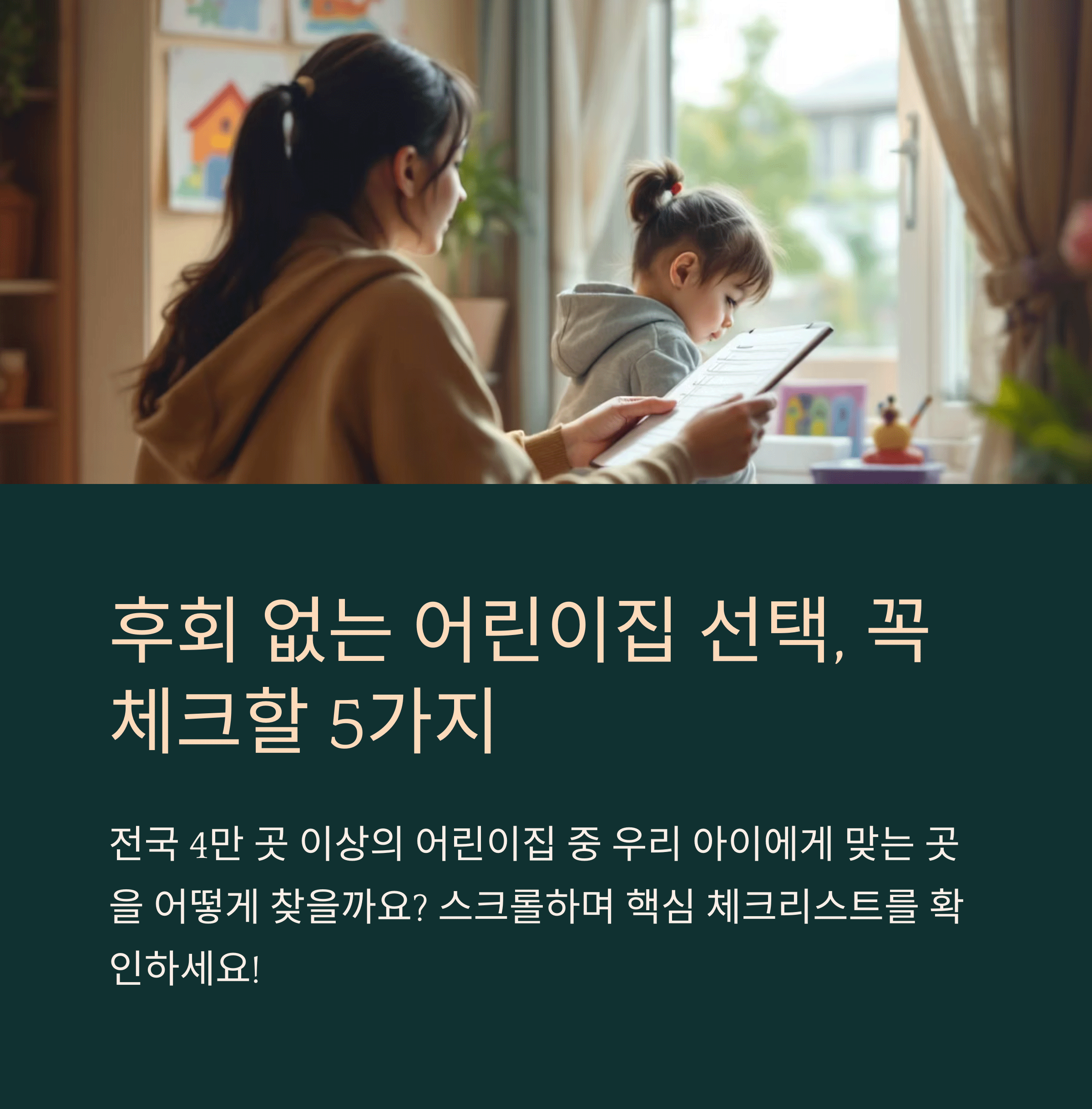우리 아이가 처음 사회생활을 시작하는 공간인 어린이집은 단순한 보육 장소가 아니라 아이의 전인적 성장을 위한 중요한 출발점입니다. 오늘 알려드린 다섯 가지 체크포인트를 기준 삼아 다양한 시설들을 꼼꼼히 비교해보세요. 사소한 부분이라도 부모로서의 직관을 믿고 세심히 관찰한다면 아이에게 최적의 환경을 제공할 수 있을 것입니다. 결국 선택의 기준은 ‘아이의 행복’입니다. 늘 부모의 따뜻한 관심이 함께 하길 바랍니다.