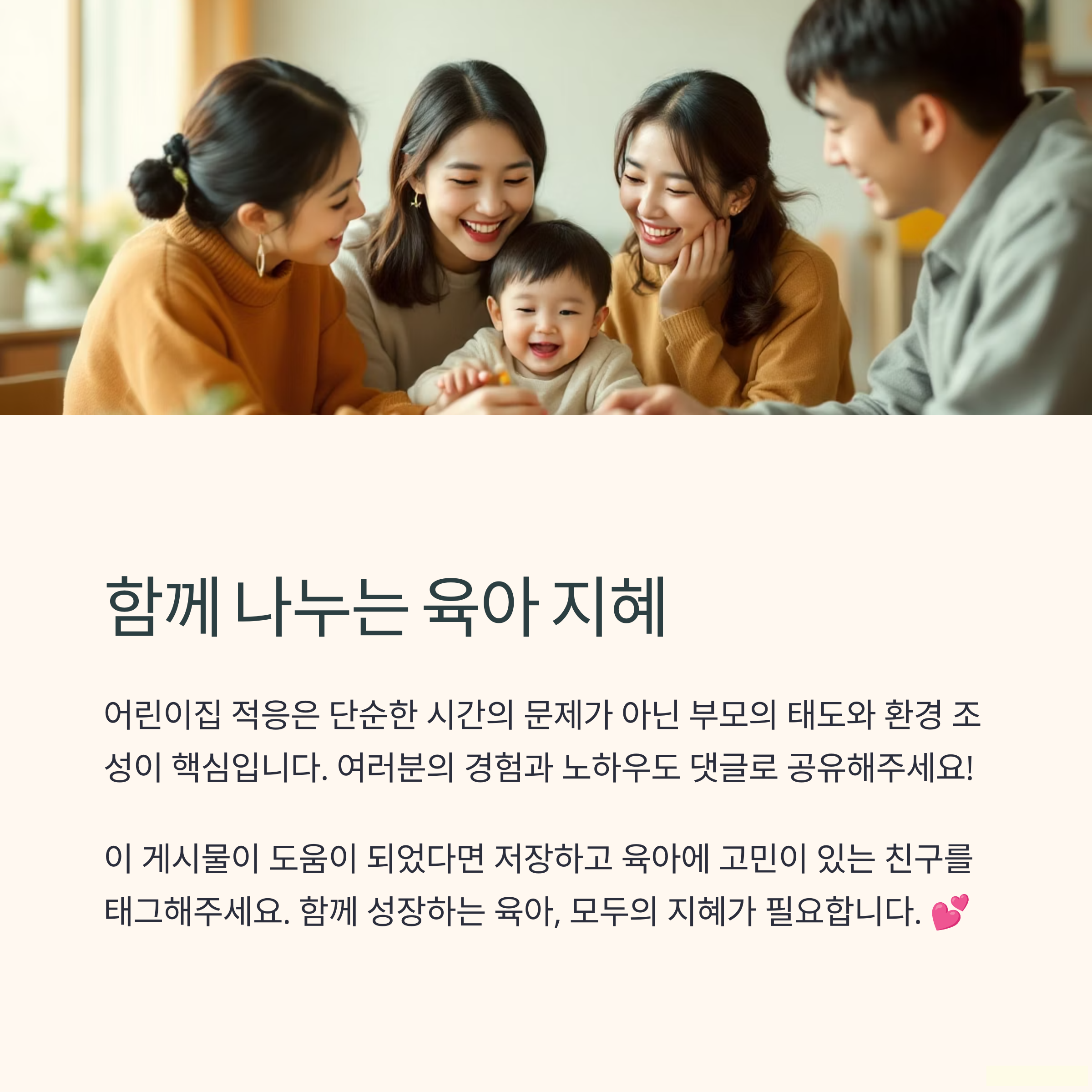 여러분 자녀는 어린이집에 어떻게 적응하고 있나요? 겪은 어려움이나 도움이 된 방법이 있다면 댓글로 함께 나눠주세요. 서로의 경험이 큰 힘이 됩니다.