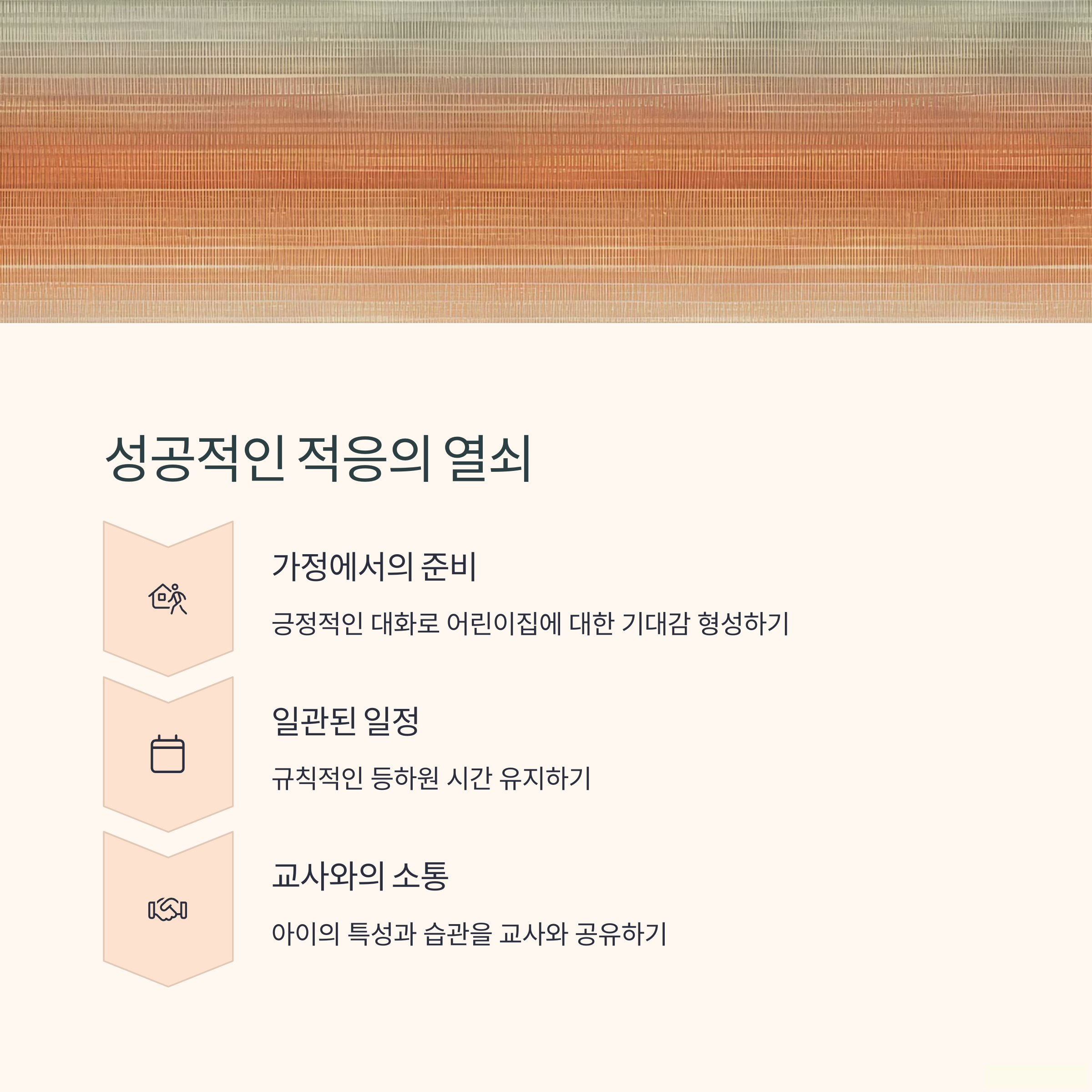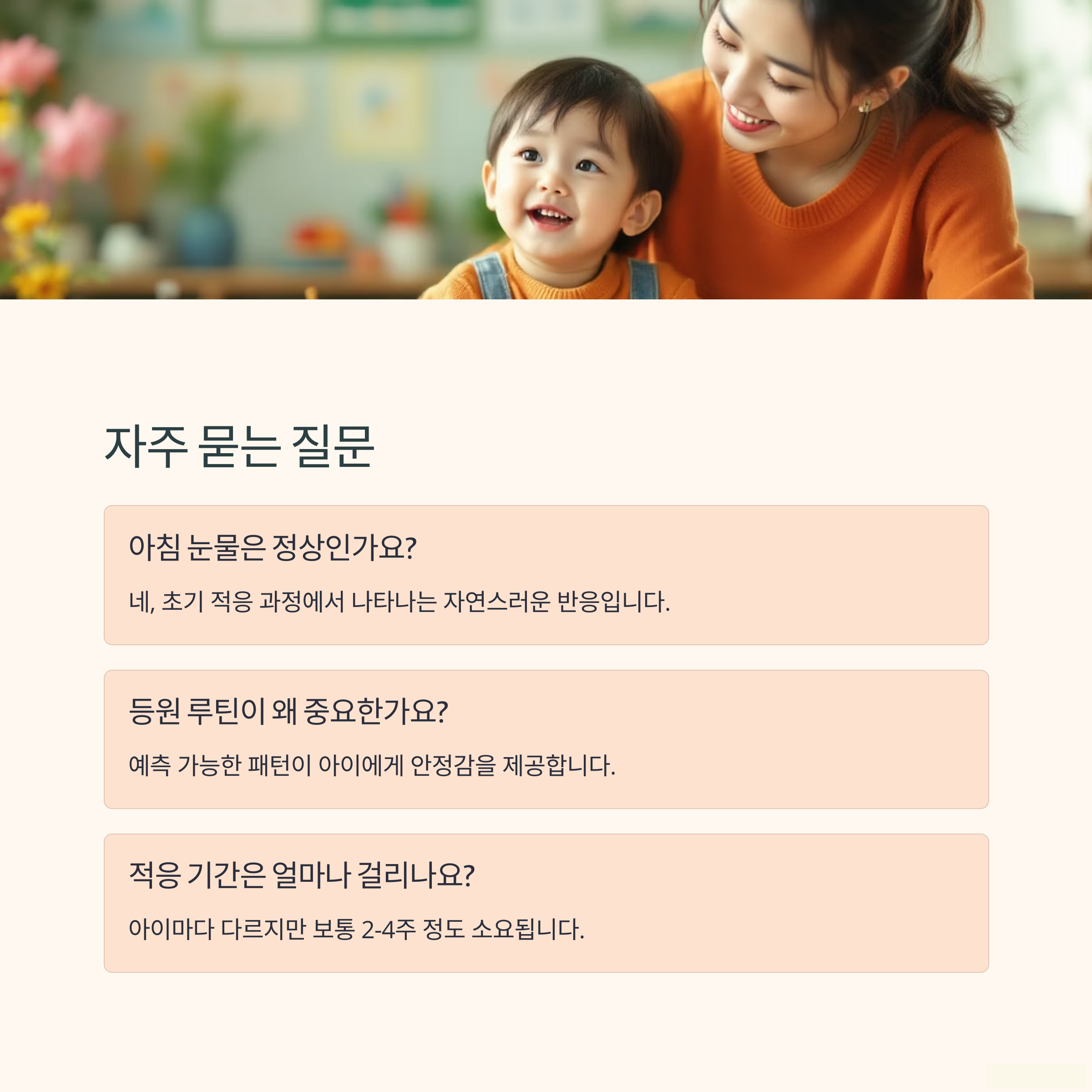 | 부모와의 신뢰는 새로운 환경 적응을 도와줍니다. | 긍정적이면서 단호한 태도가 중요합니다. | 아침 준비와 귀가 후 루틴을 반복하세요. |
