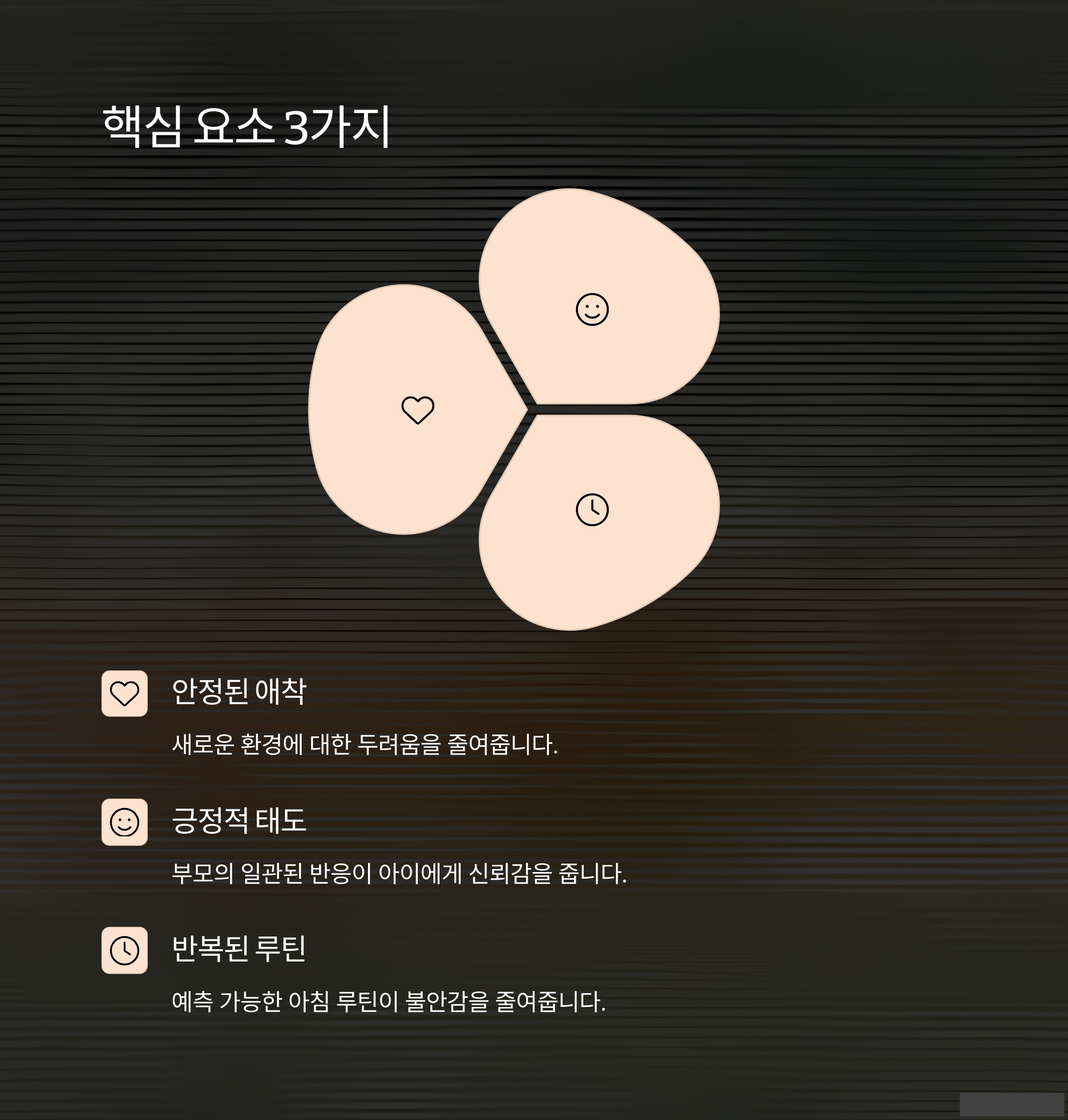 | 안심할 수 있는 애착이 심리적 안정의 기초입니다. | 흔들리지 않는 부모 태도는 큰 신뢰가 됩니다. | 반복된 행동이 아이에게 예측 가능성을 줍니다. |