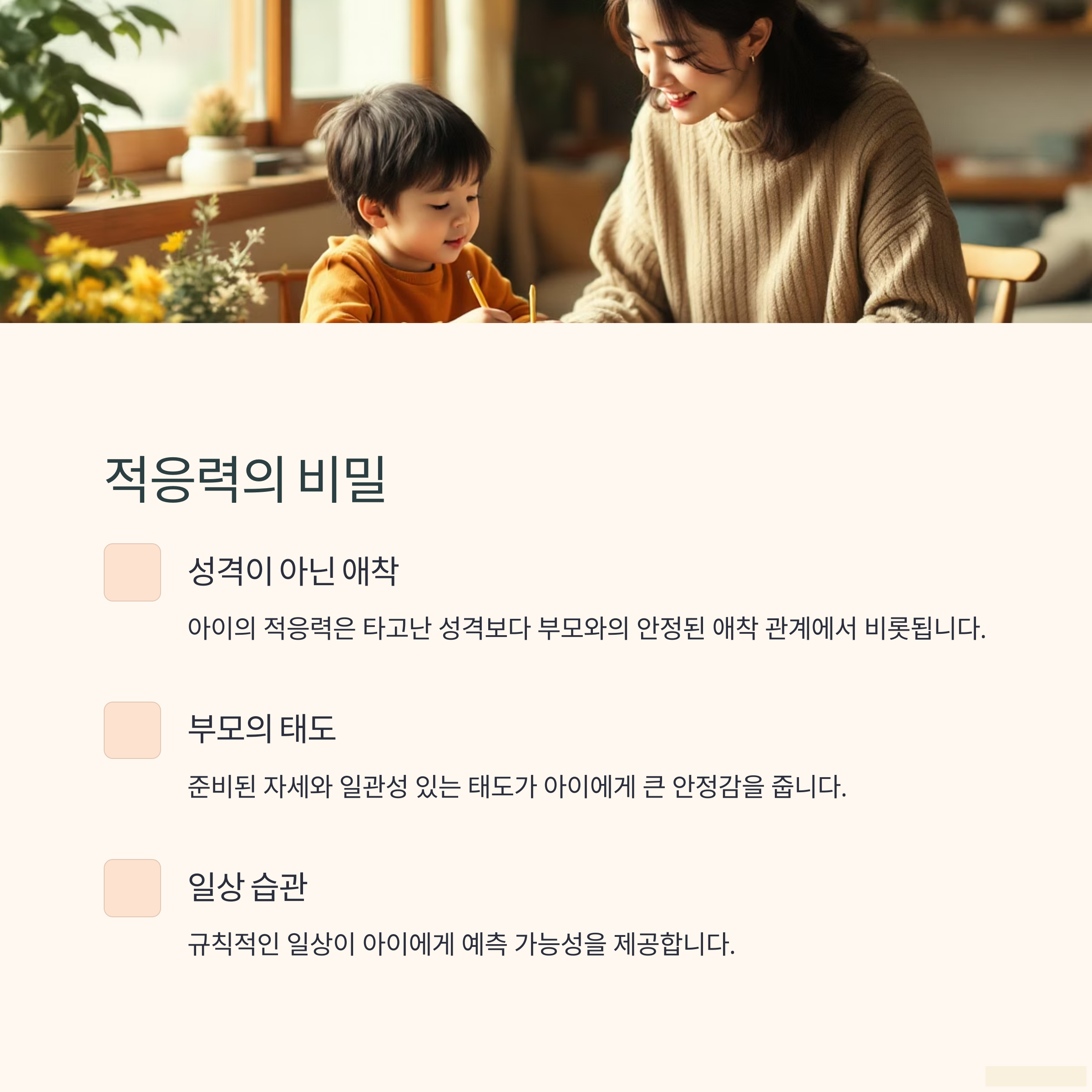 | 적응력 좋은 아이 특징 | 안정적인 애착과 반복된 일상에서 비롯됩니다. |
