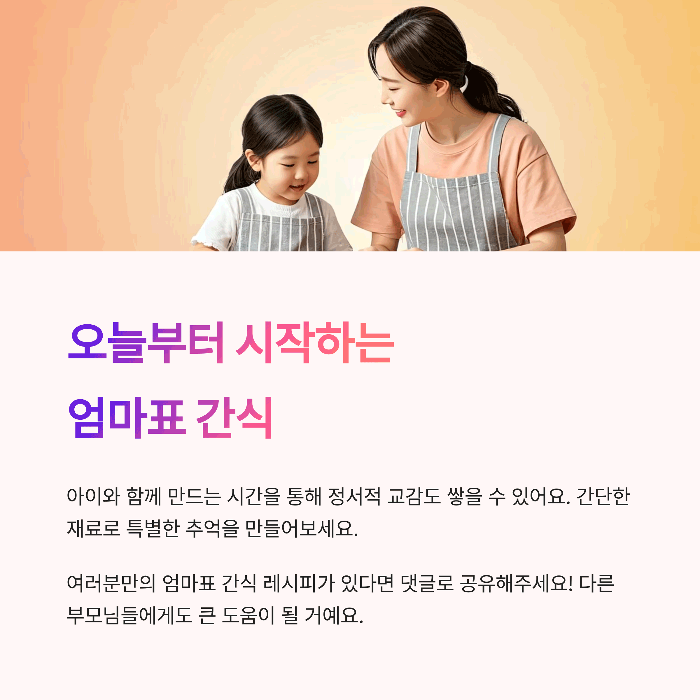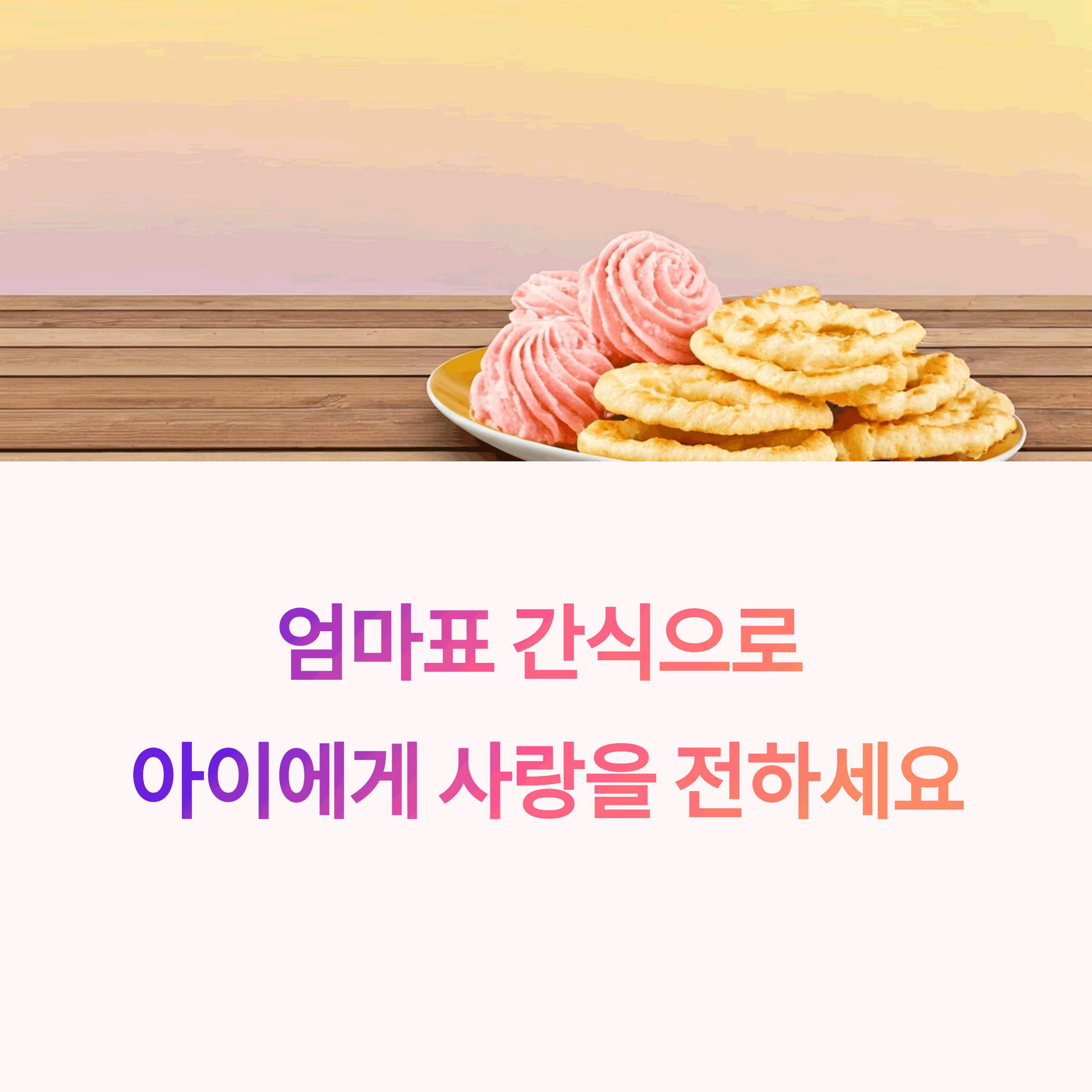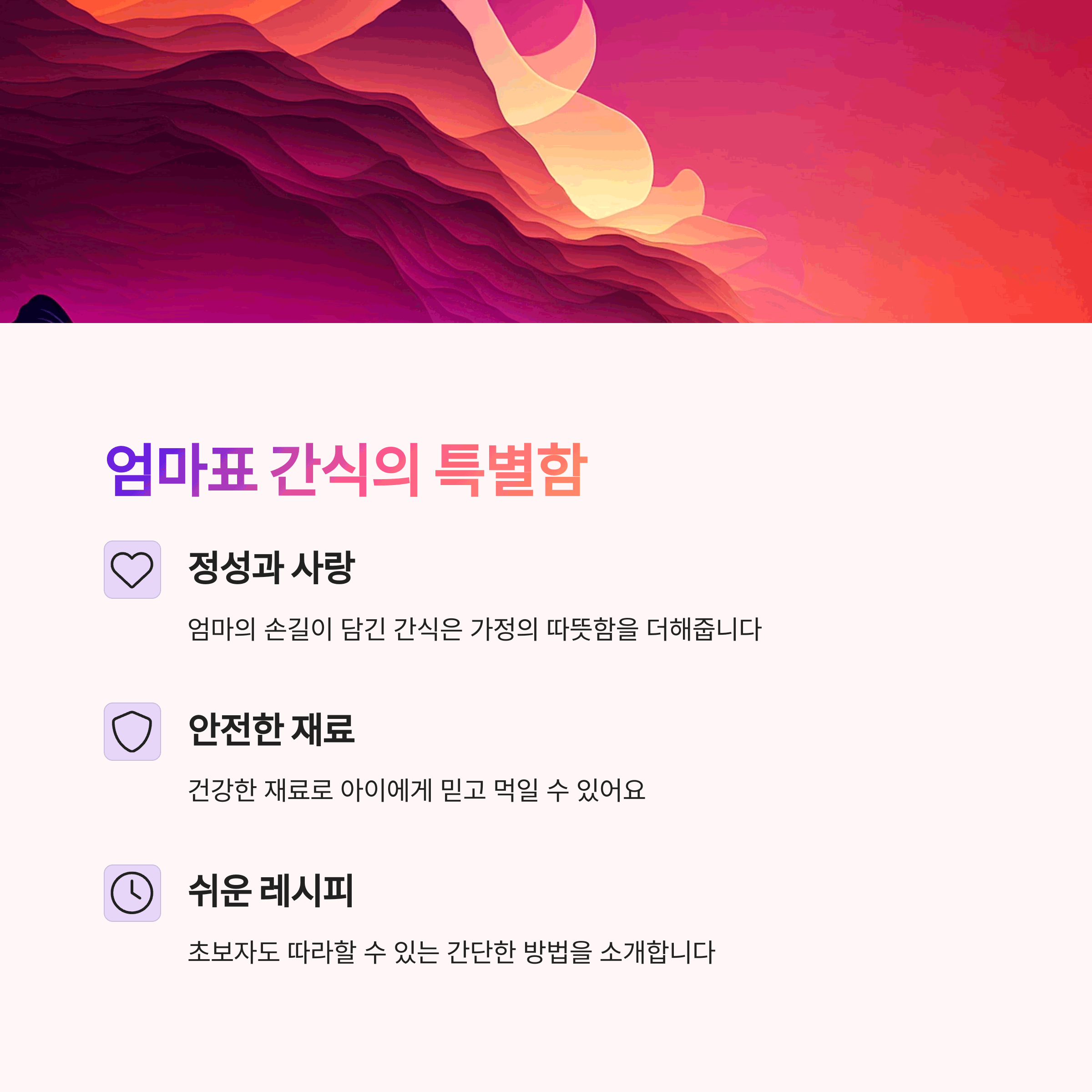 | 엄마표 간식의 장점 | 정성과 건강을 담아 안심하고 먹일 수 있어요. |