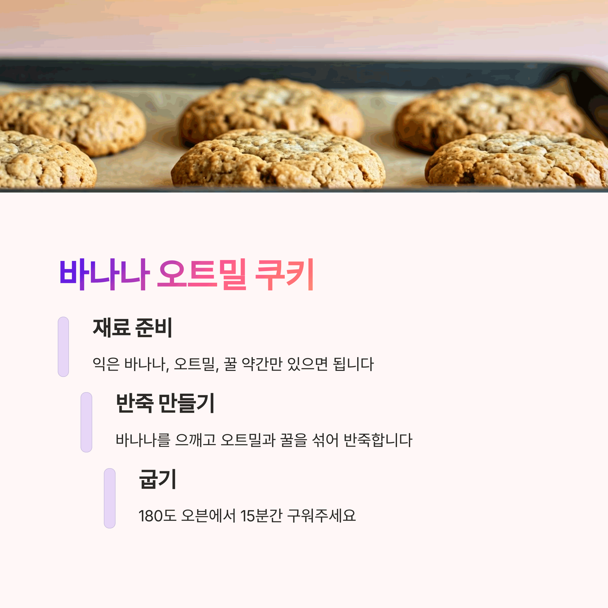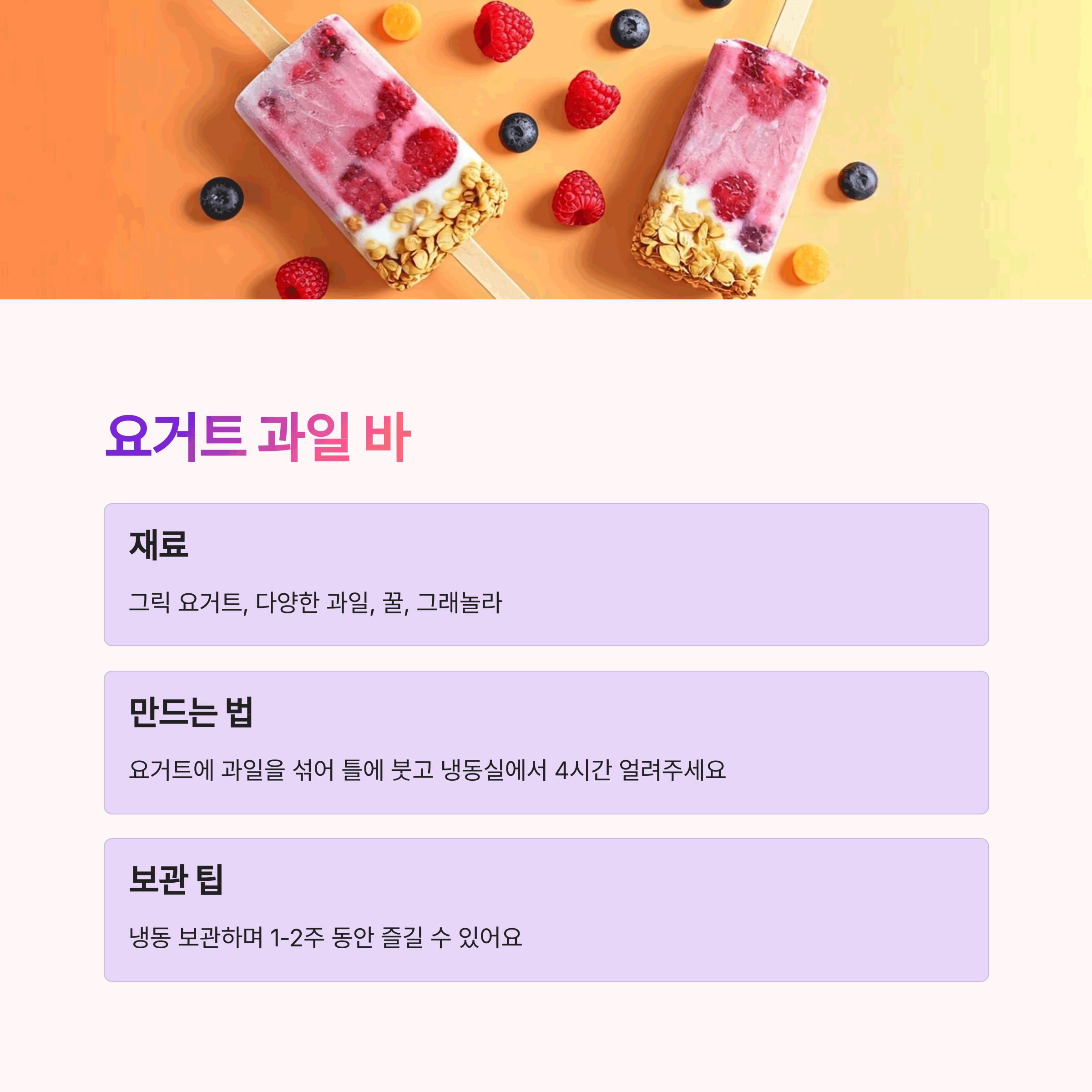 | 바나나와 오트밀로 건강한 단맛을 즐겨요. | 고구마의 달콤함과 치즈의 고소함이 조화를 이뤄요. | 과일과 요거트의 상큼함으로 인기 만점이에요. |