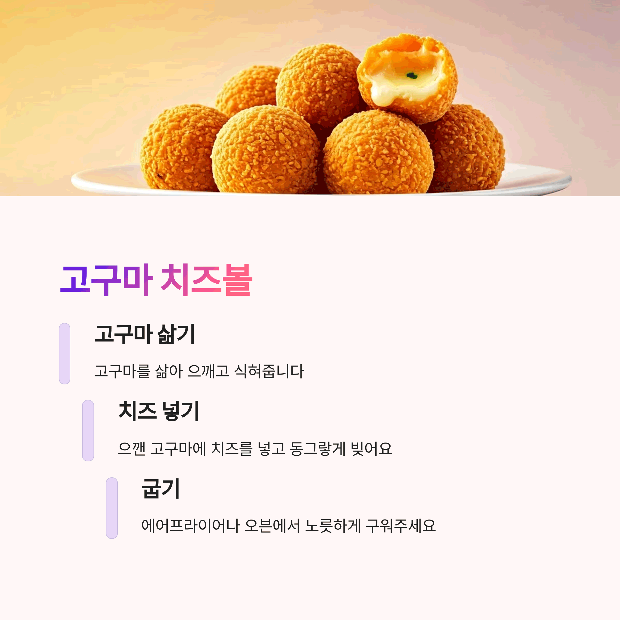 | 아이 간식, 다이어트 간식으로도 훌륭해요. | 에어프라이어로 조리해 간편하게 완성할 수 있어요. | 무더운 여름철 시원한 간식으로 제격이에요. |