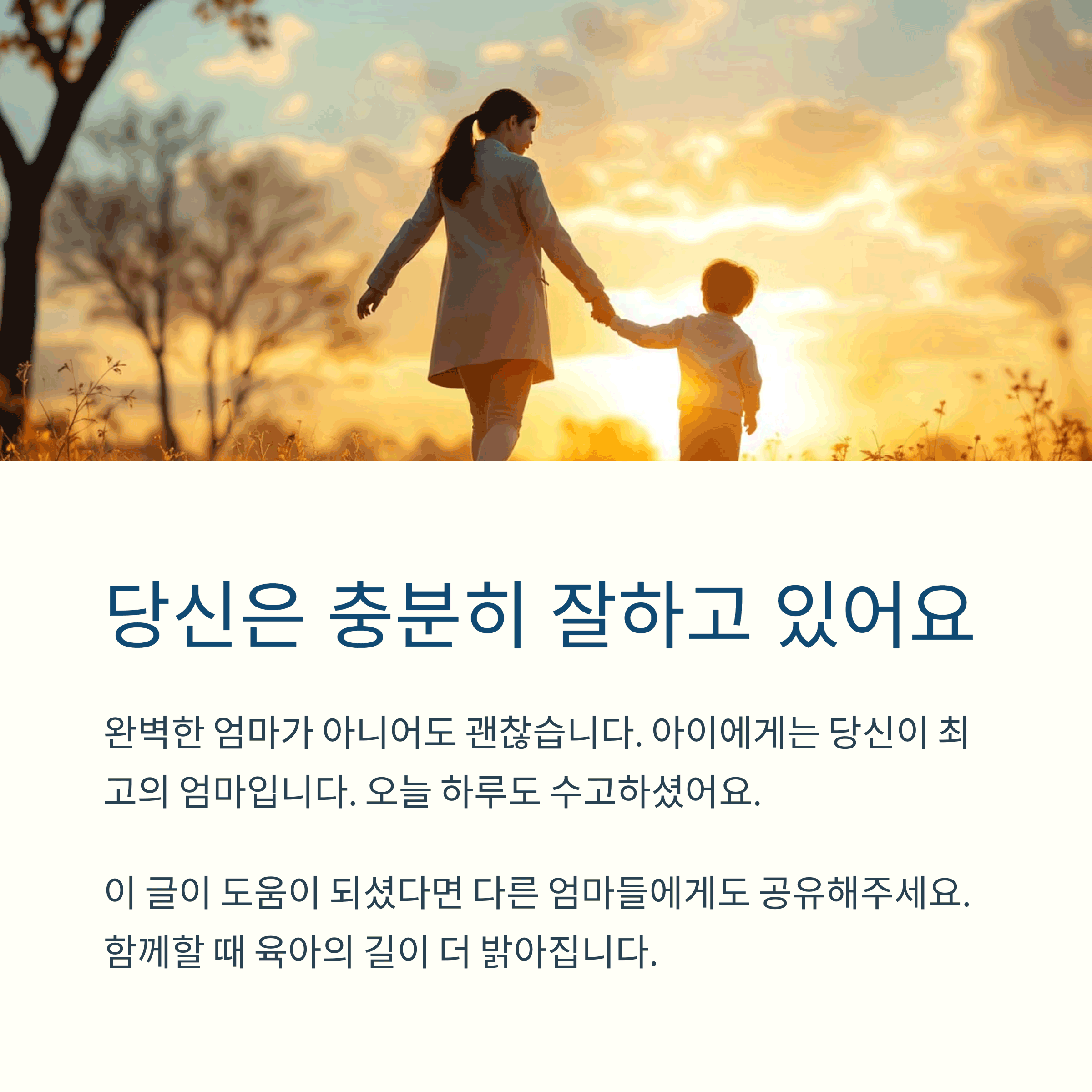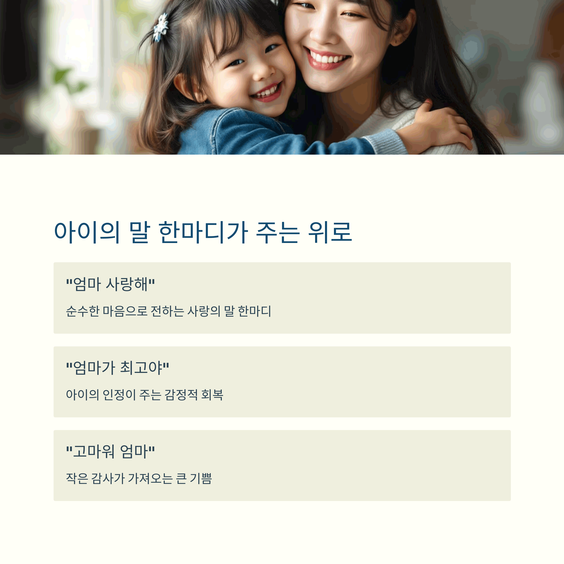 오늘도 육아에 지친 수많은 엄마들에게 따뜻한 위로의 말 한마디가 큰 힘이 됩니다. 반복되는 일상 속에서도 아이의 한마디가 하루를 밝게 만들어 주는 순간이 분명 있습니다. 그 짧은 말이 마음을 어루만지고, 스트레스를 잠재우며, 다시 내일을 살아갈 힘을 줍니다. 우리는 서로 위로받으며 함께 이 길을 걸어가고 있습니다. 자신에게도 따뜻한 말 한마디를 잊지 말고 건네주세요. 여러분은 이미 충분히 잘하고 있습니다.