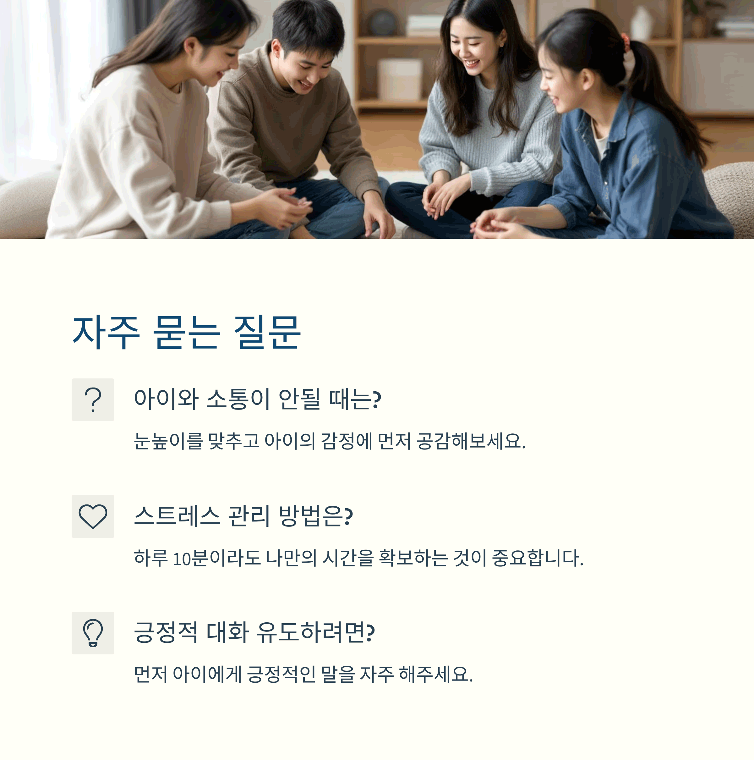 | 짧은 휴식보다 감정적 지지가 효과적입니다. | 말의 힘은 스트레스를 줄이는 강력한 수단입니다. | 마음을 나누는 순간이 아이와 엄마를 모두 성장시킵니다. |