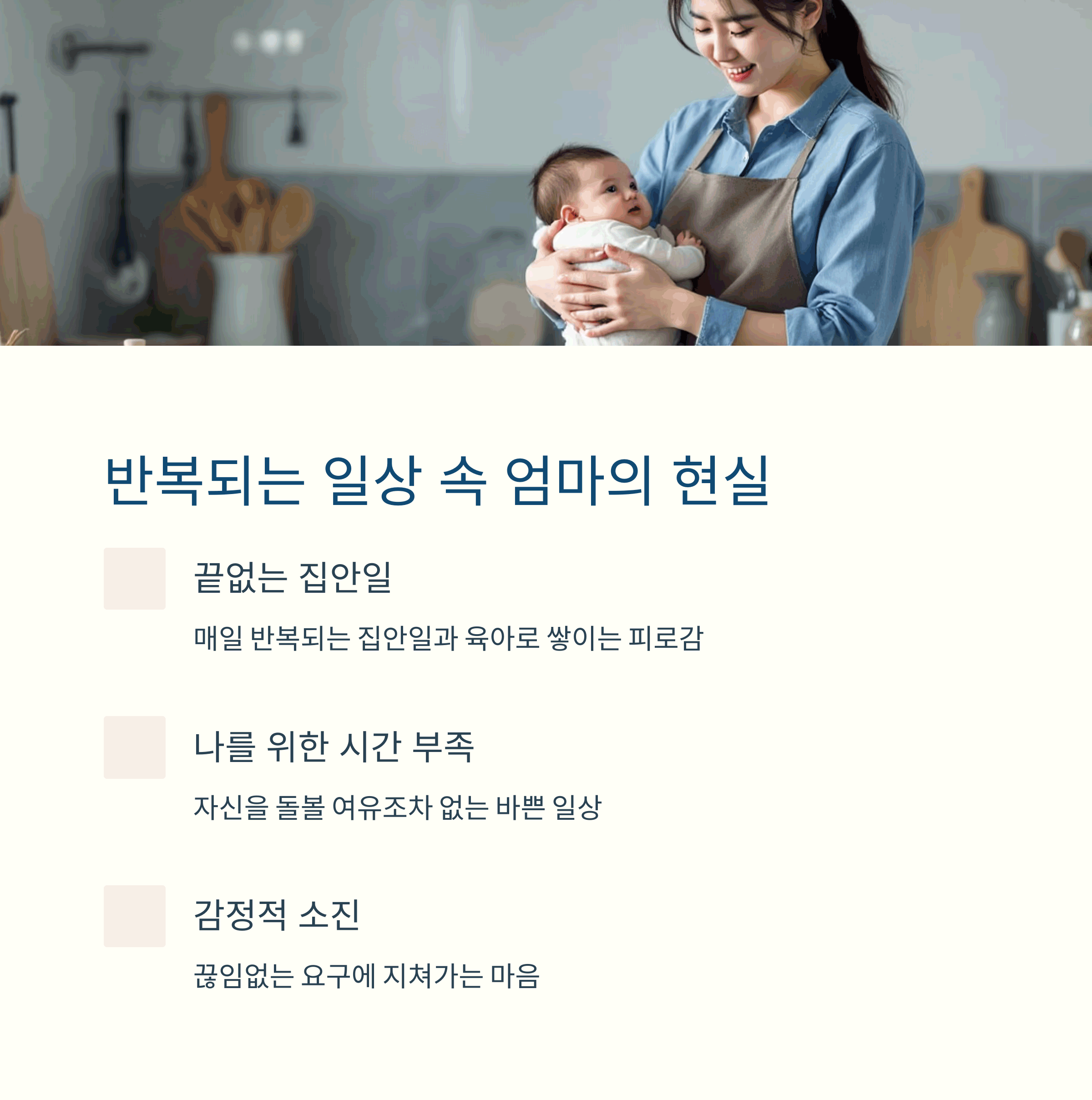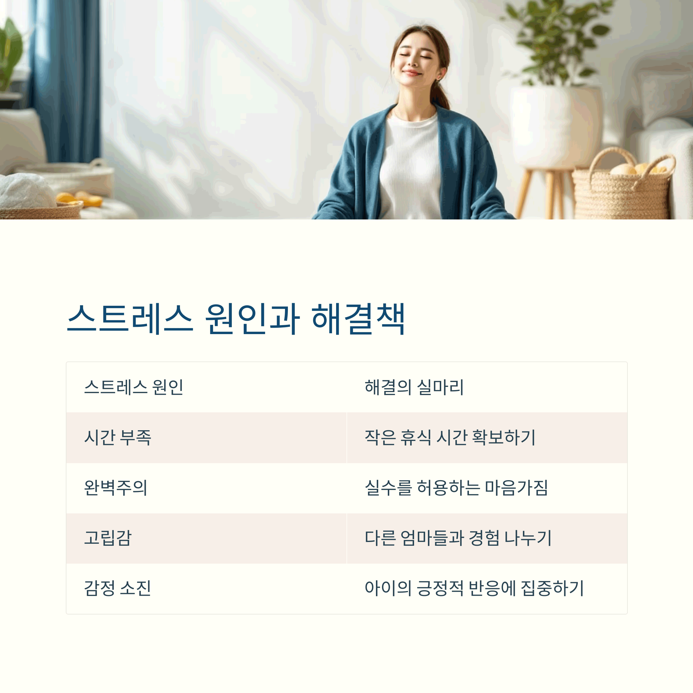 | 엄마 스트레스 원인 | 반복되는 일상과 육아 부담에서 비롯됩니다. |