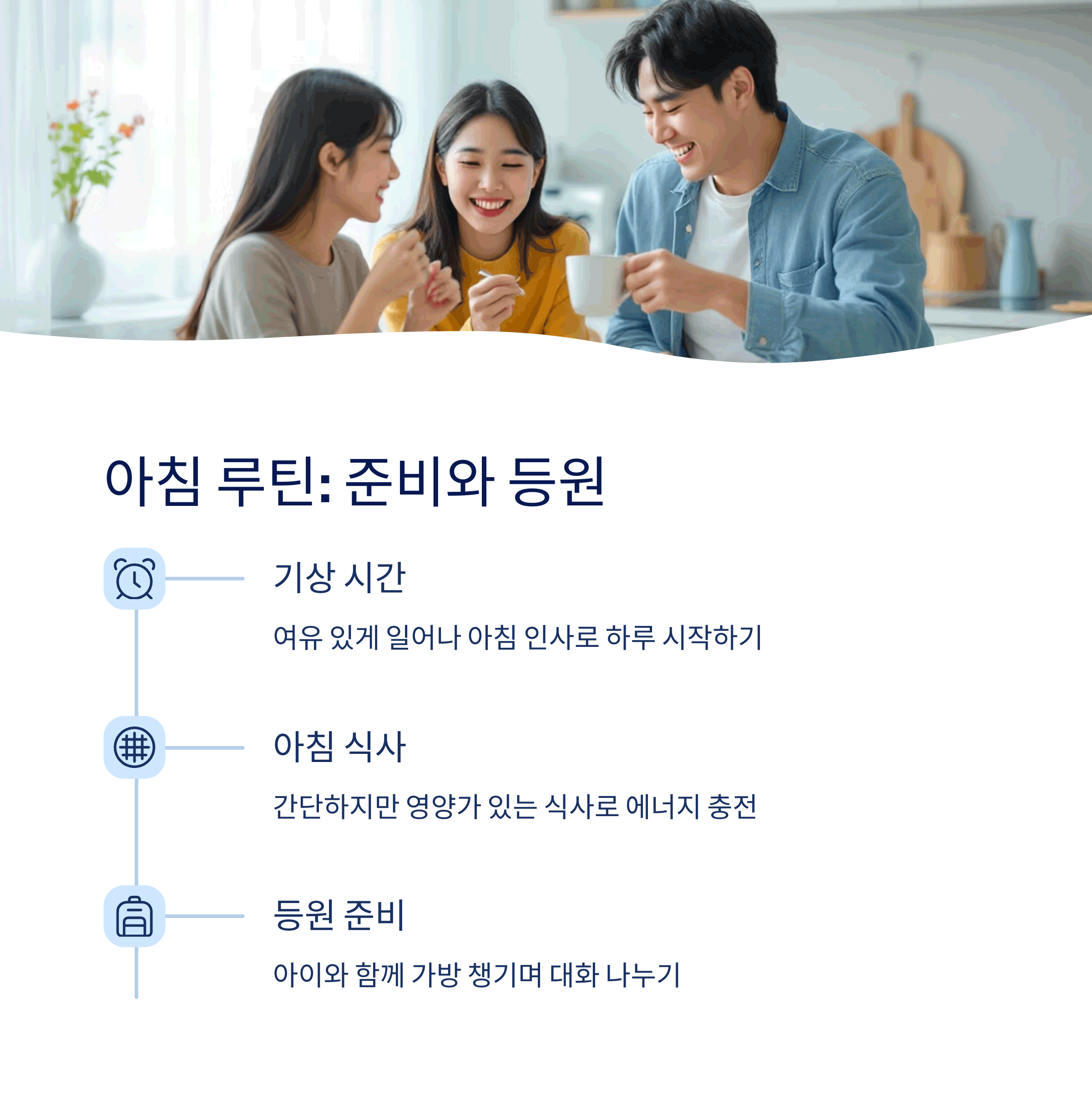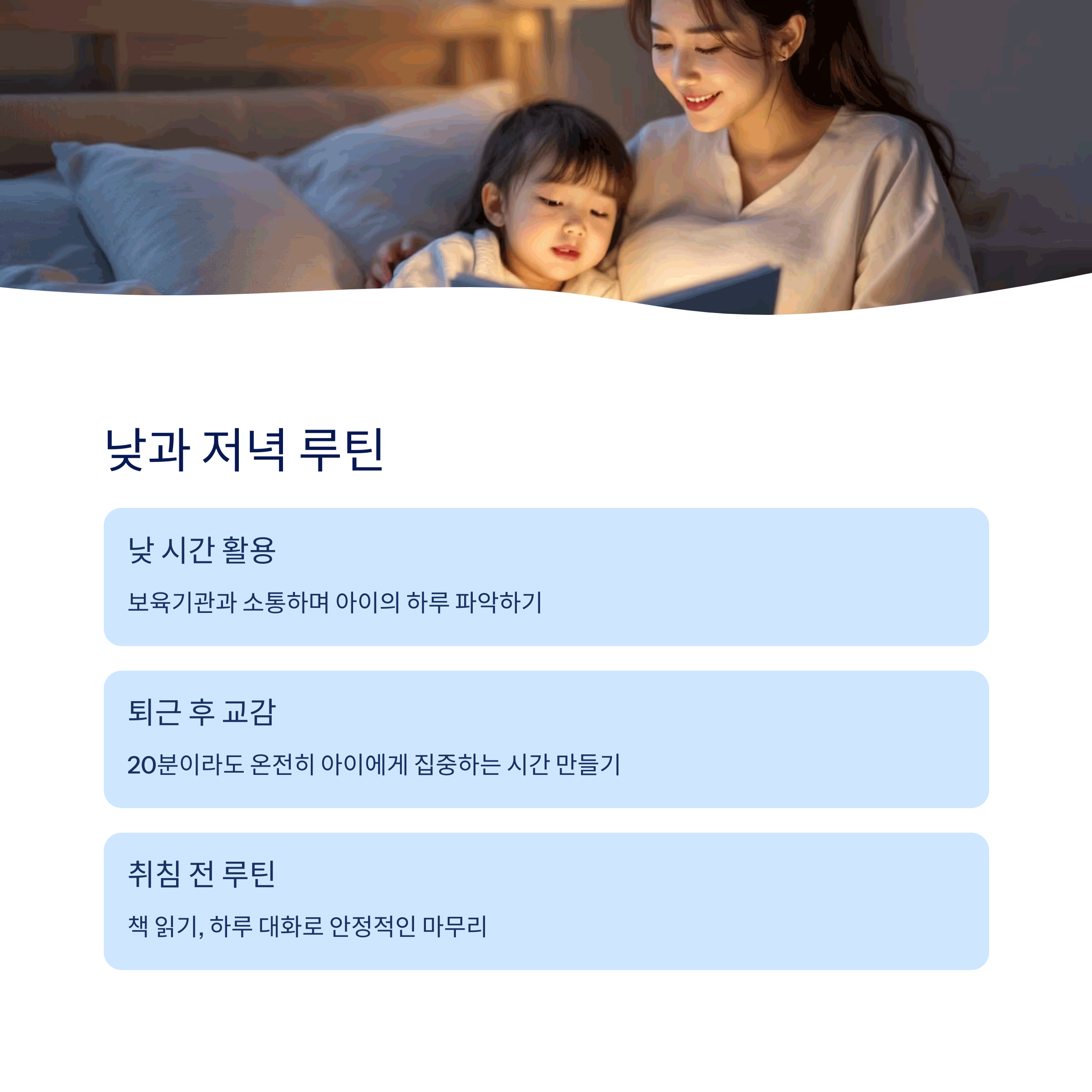 | 기상, 식사, 옷 입기, 등원 준비 | 보육기관 체크, 커뮤니케이션 | 식사, 목욕, 독서, 취침 루틴 |