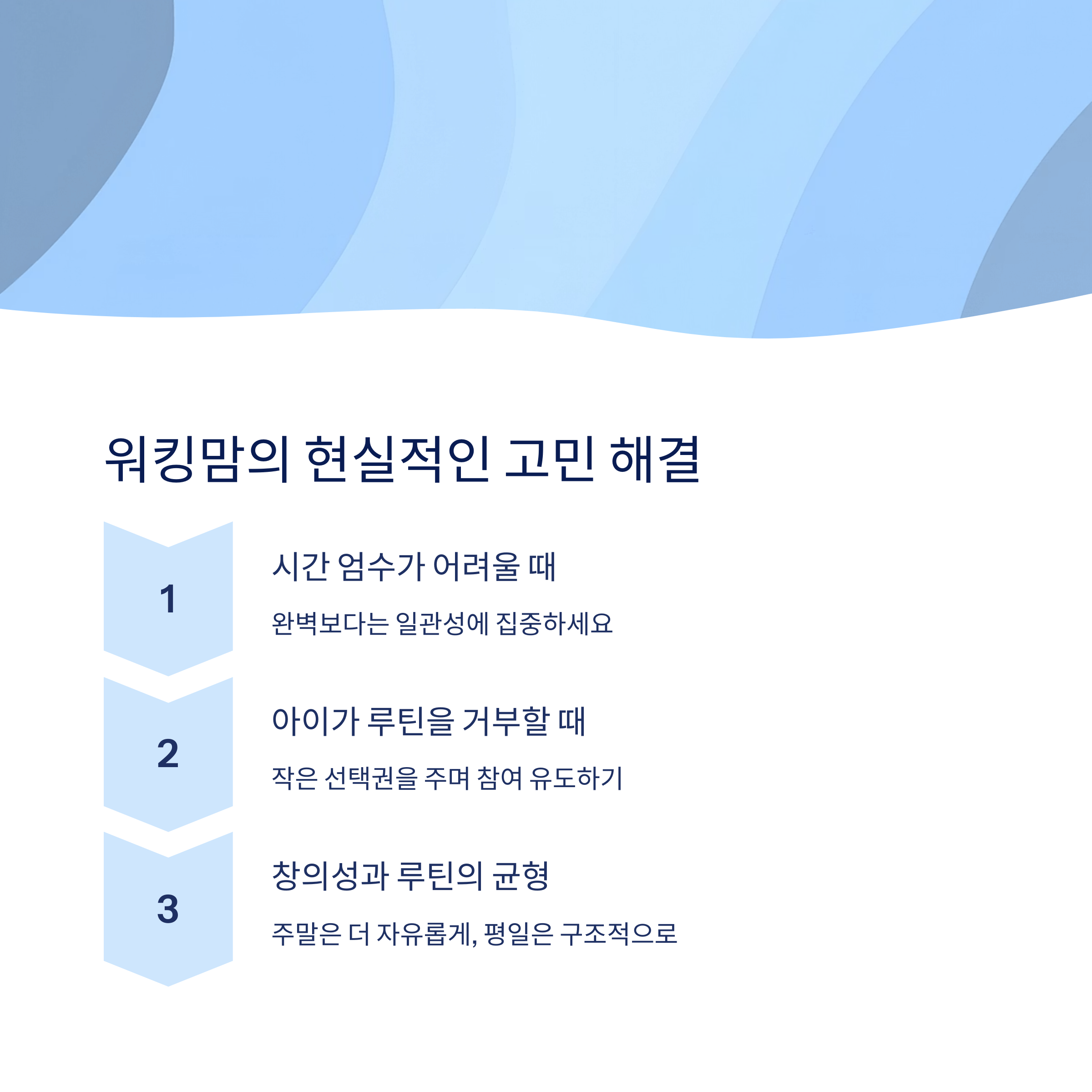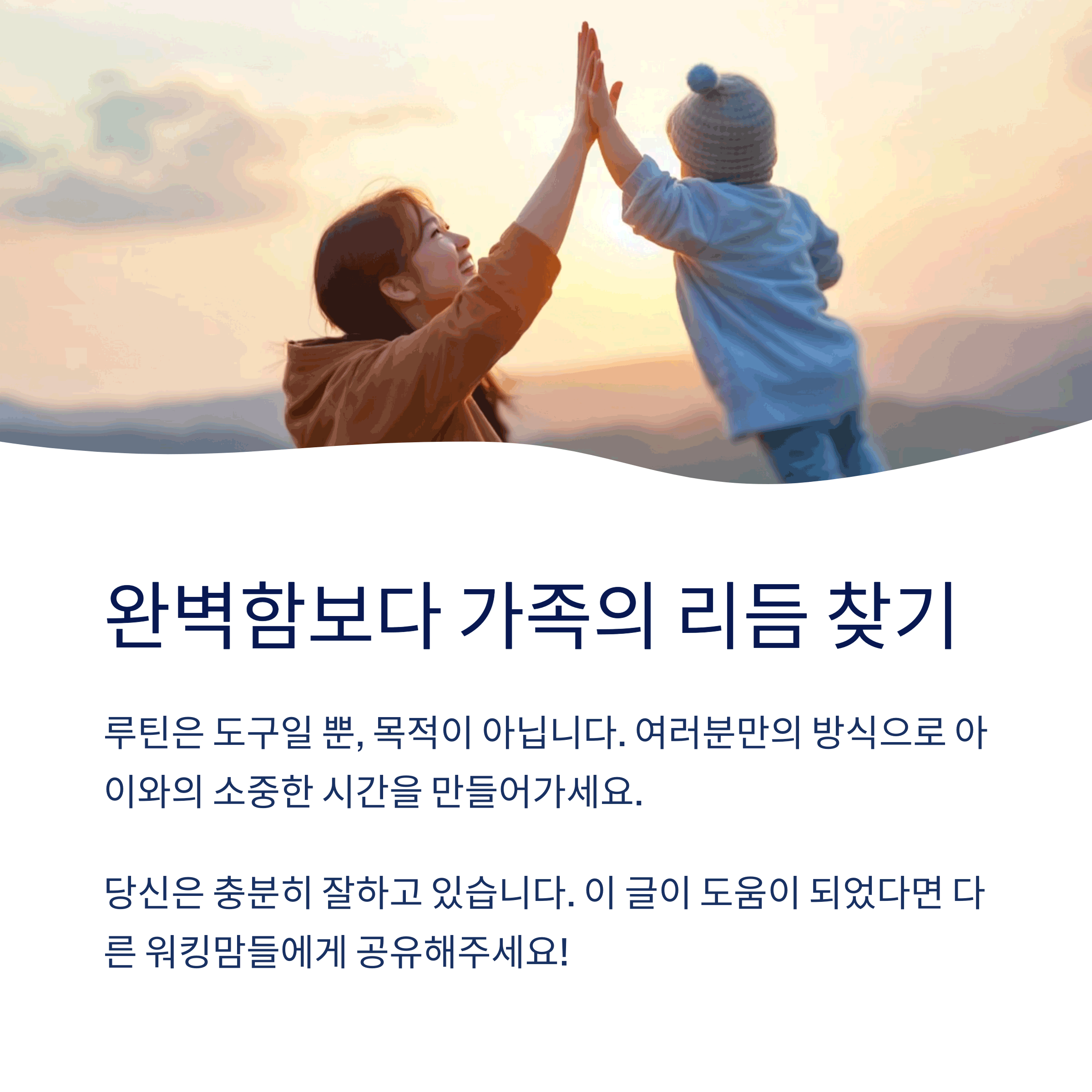 워킹맘으로 살아간다는 것은 매 순간 선택의 연속입니다. 그러나 정해진 루틴은 복잡한 하루를 단순화하고 아이에게는 안정감을, 엄마에게는 자존감을 선사합니다. 루틴을 완벽하게 지키는 것이 목적이 아니라 우리 가족만의 리듬을 찾는 과정임을 잊지 마세요. 매일 조금씩 맞춰가다 보면 분명 만족스러운 흐름을 만들 수 있습니다. 오늘도 육아와 일을 병행하며 고군분투하는 모든 워킹맘을 응원합니다.