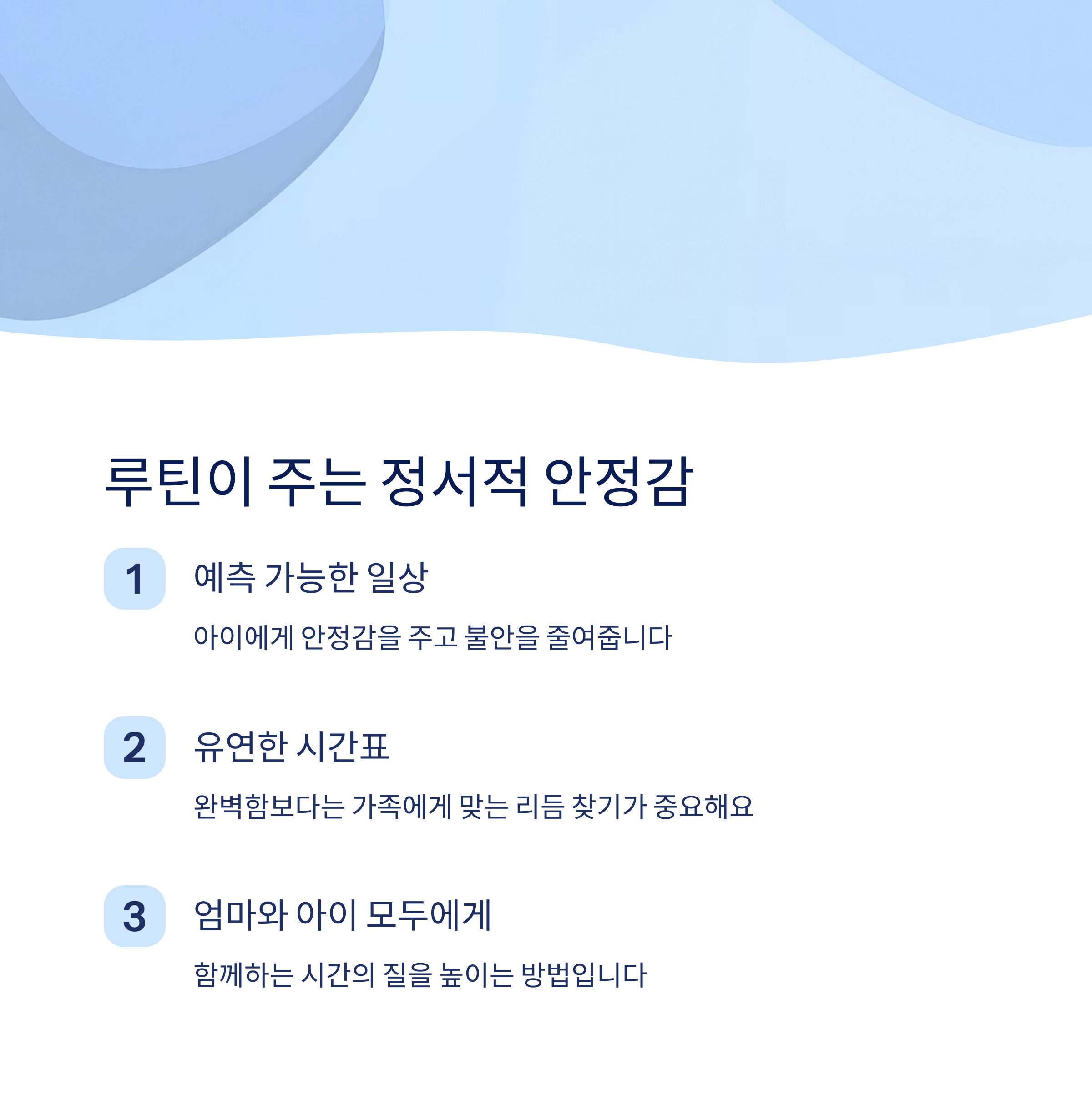 | 루틴의 중요성 | 일정한 루틴은 아이의 정서 안정에 도움을 줍니다. |