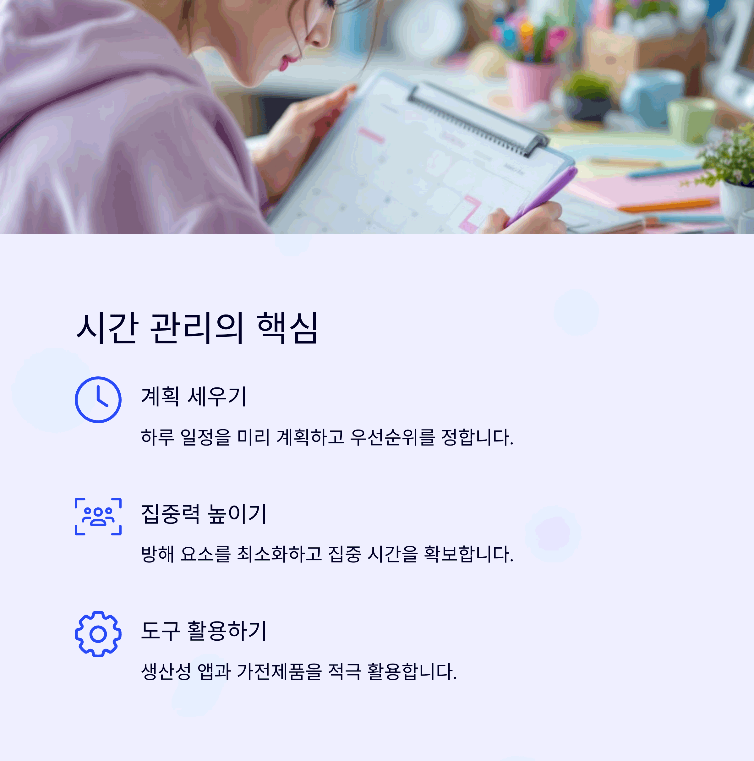 | 시간관리 | 하루를 계획하면 모든 게 달라져요 |