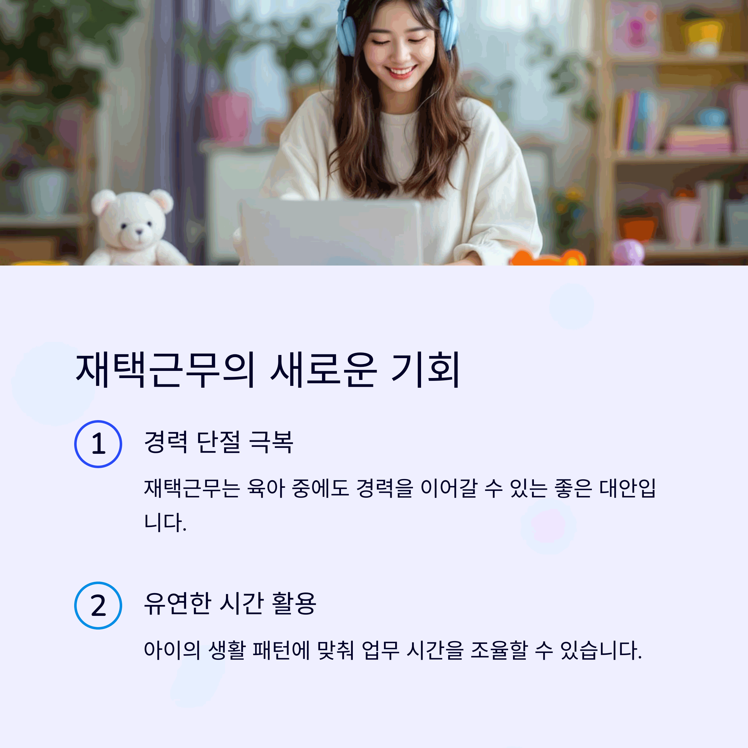 육아와 커리어를 동시에 이어간다는 건 마치 두 마리 토끼를 쫓는 것처럼 느껴질 수 있습니다. 하지만 요즘 시대는 변화하고 있습니다. 특히 코로나19 이후 원격근무의 증가로 인해 더 많은 엄마들이 집에서도 업무를 수행할 수 있는 환경이 조성되었죠. 육아시간과 업무시간을 스스로 조율할 수 있는 점이 가장 큰 장점입니다. 물론 체계적인 시간 관리와 집중력이 필요하지만, 이를 통해 경력을 단절 없이 유지할 수 있다는 점은 분명 매력적입니다.