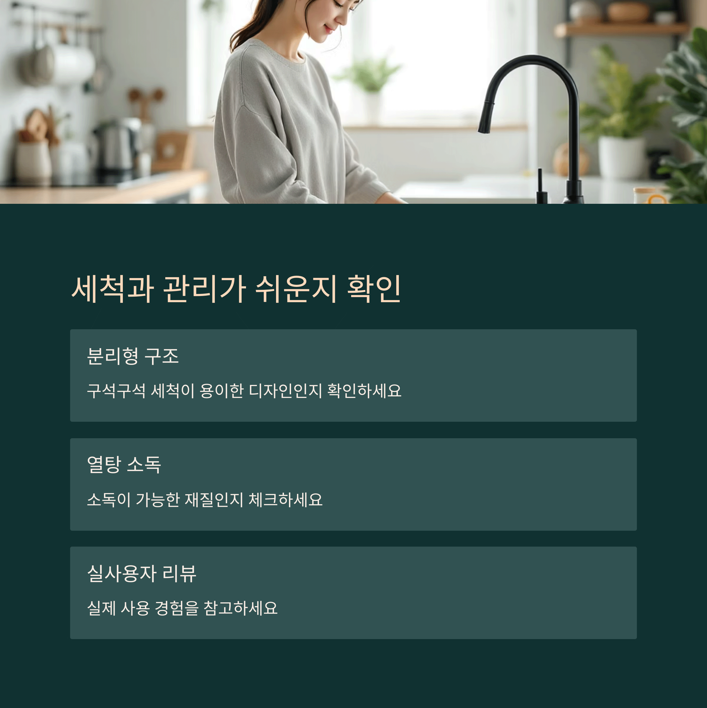 | 인증 마크 확인 필수, 피부 접촉 제품 주의 | 분리 세척 및 열탕 소독 가능 여부 확인 | 다용도 활용 가능 여부와 내구성 평가 |