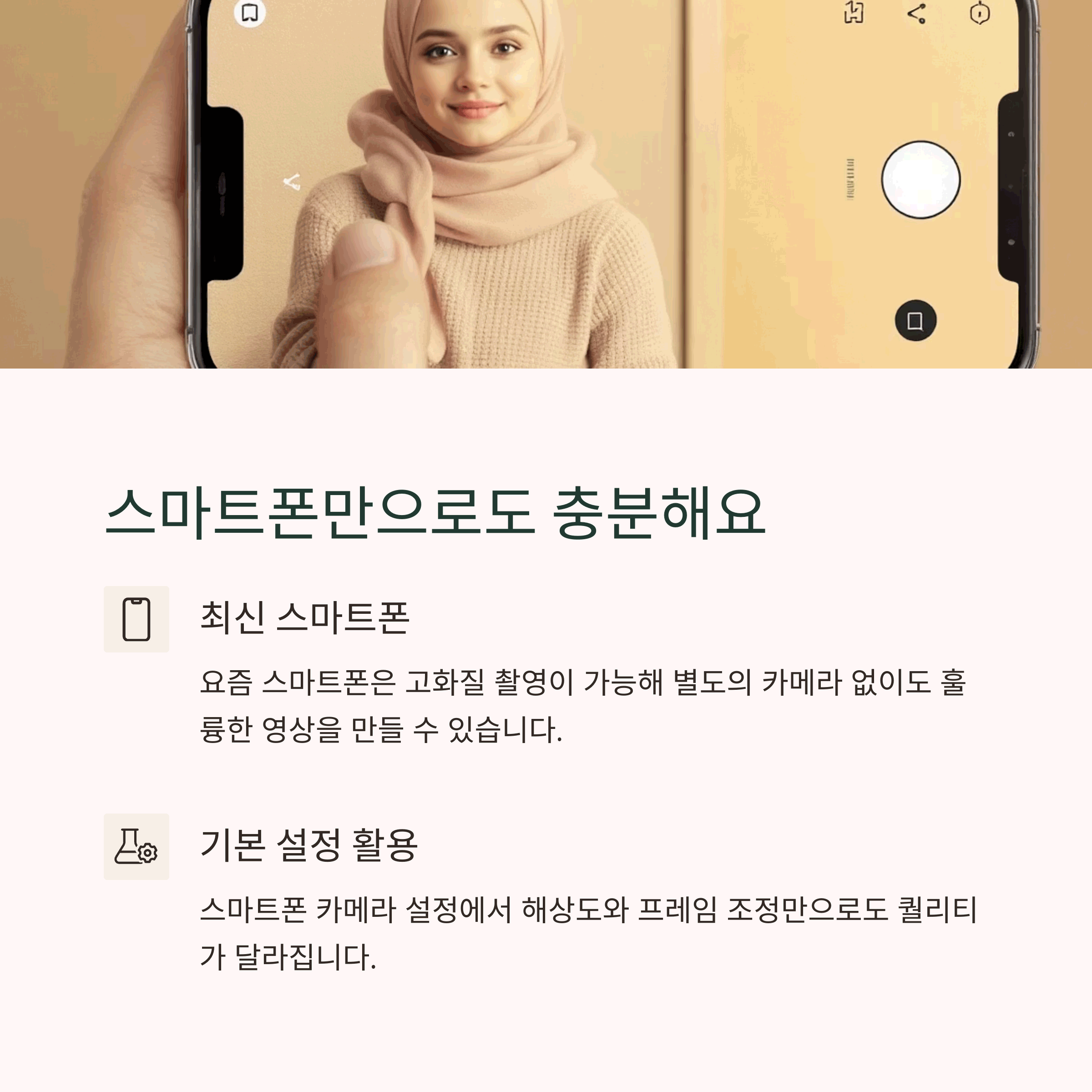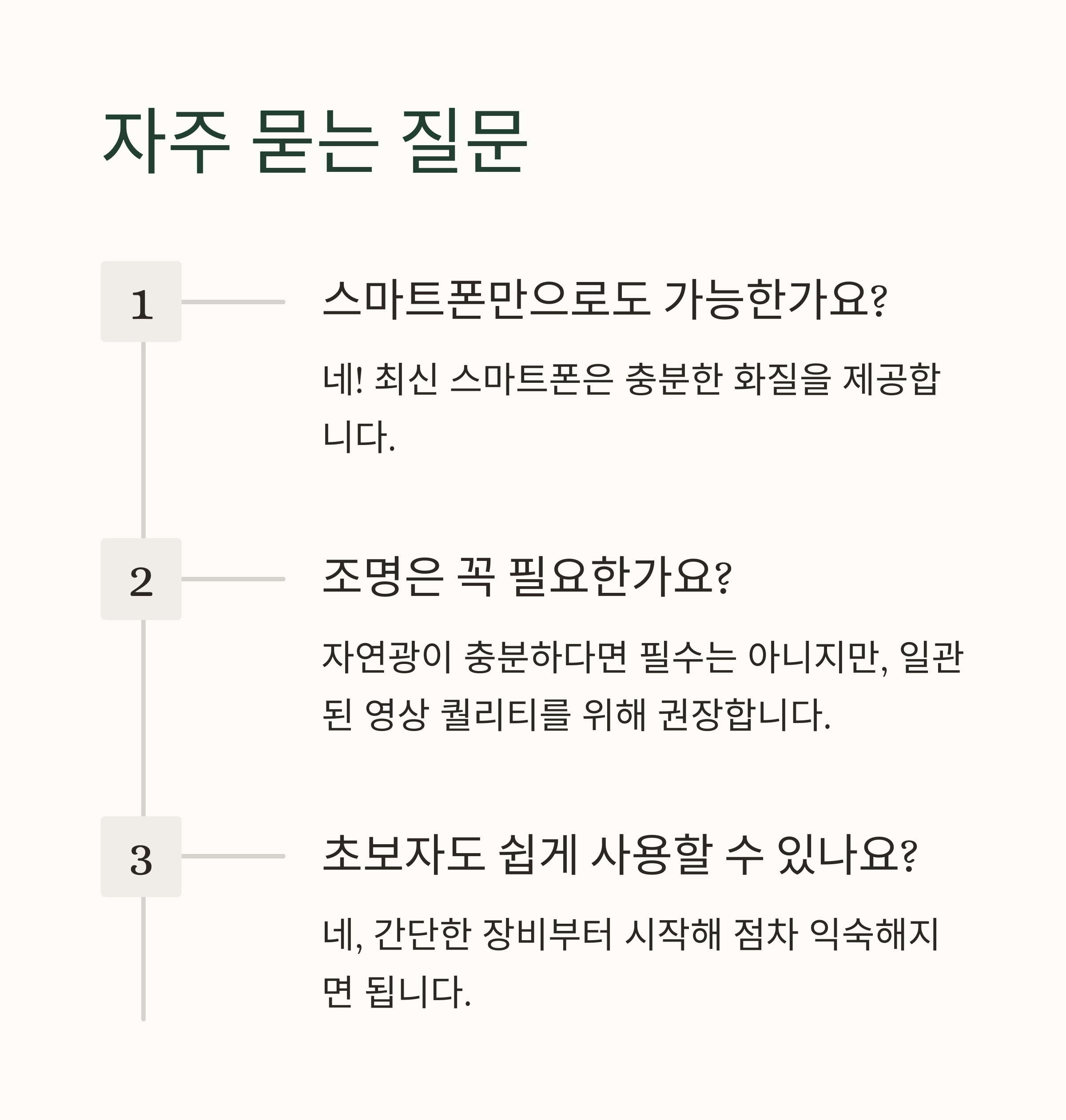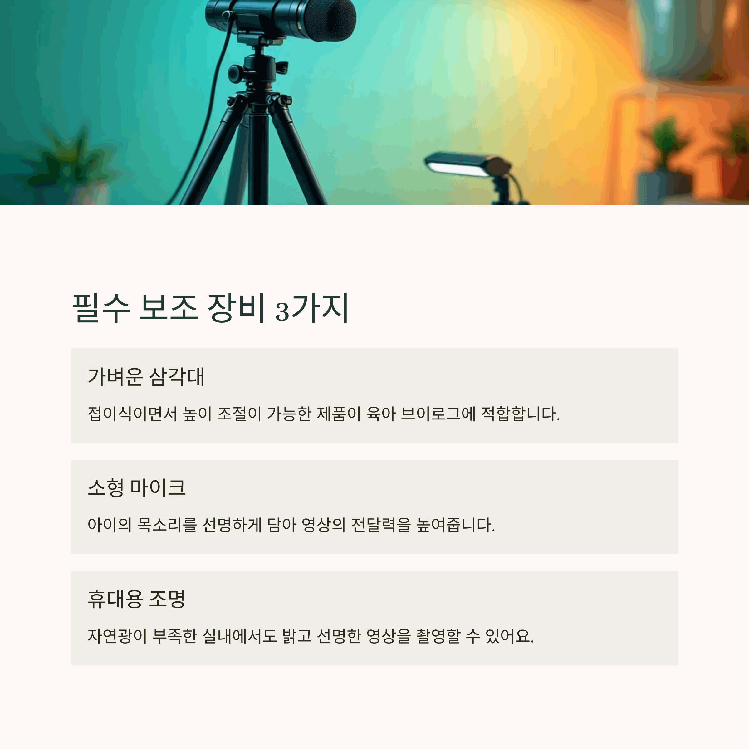 | 최신 스마트폰은 충분한 화질과 촬영 기능 제공 | 높낮이 조절 가능, 접이식, 가벼운 삼각대 추천 | 핀마이크 + LED 라이트 조합으로 퀄리티 상승 |