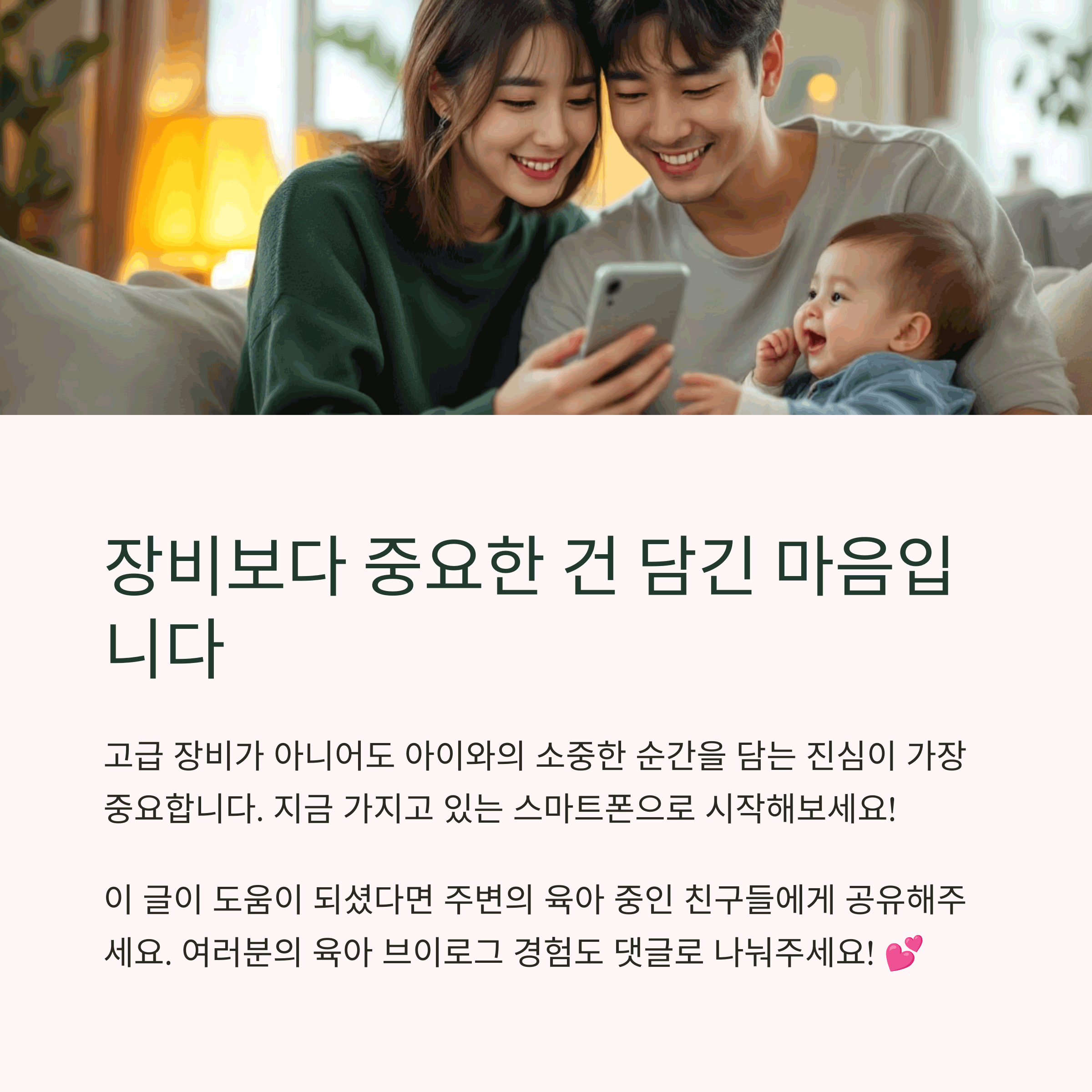 육아 브이로그를 시작하는 데 있어서 가장 중요한 건 거창한 장비가 아닙니다. 일상을 기록하고 공유하는 마음이 우선입니다. 하지만 그 마음을 잘 전달하기 위해선 촬영 장비가 큰 도움이 되기도 하죠. 오늘 소개해드린 장비들을 참고하셔서 여러분만의 이야기를 세상에 전해보세요. 매일이 특별한 순간으로 남게 될 것입니다.