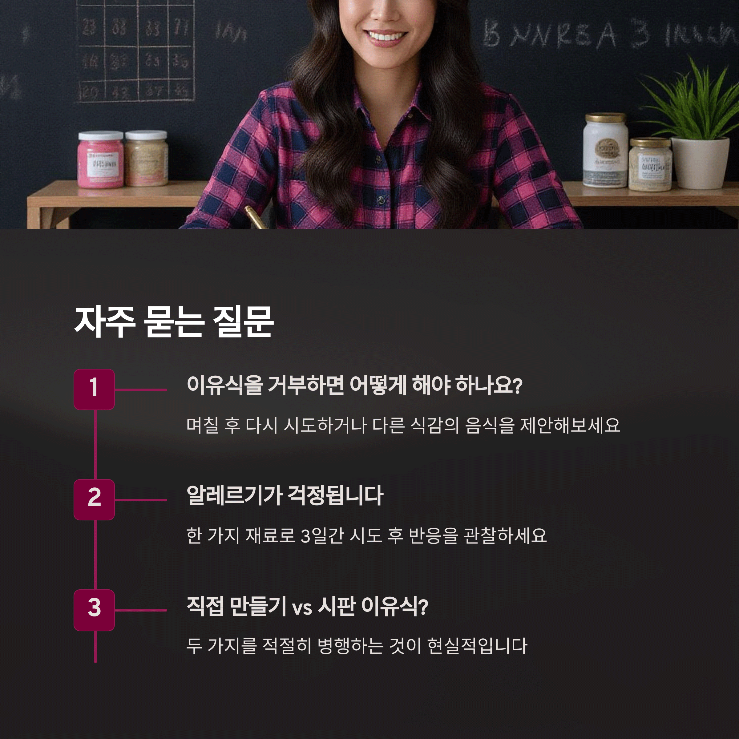 | 전문가와 상의 후 결정하면 더욱 안심돼요. | 알레르기 반응은 피부와 배변을 통해 확인할 수 있어요. | 부모의 태도도 아이의 식습관에 큰 영향을 줍니다. |