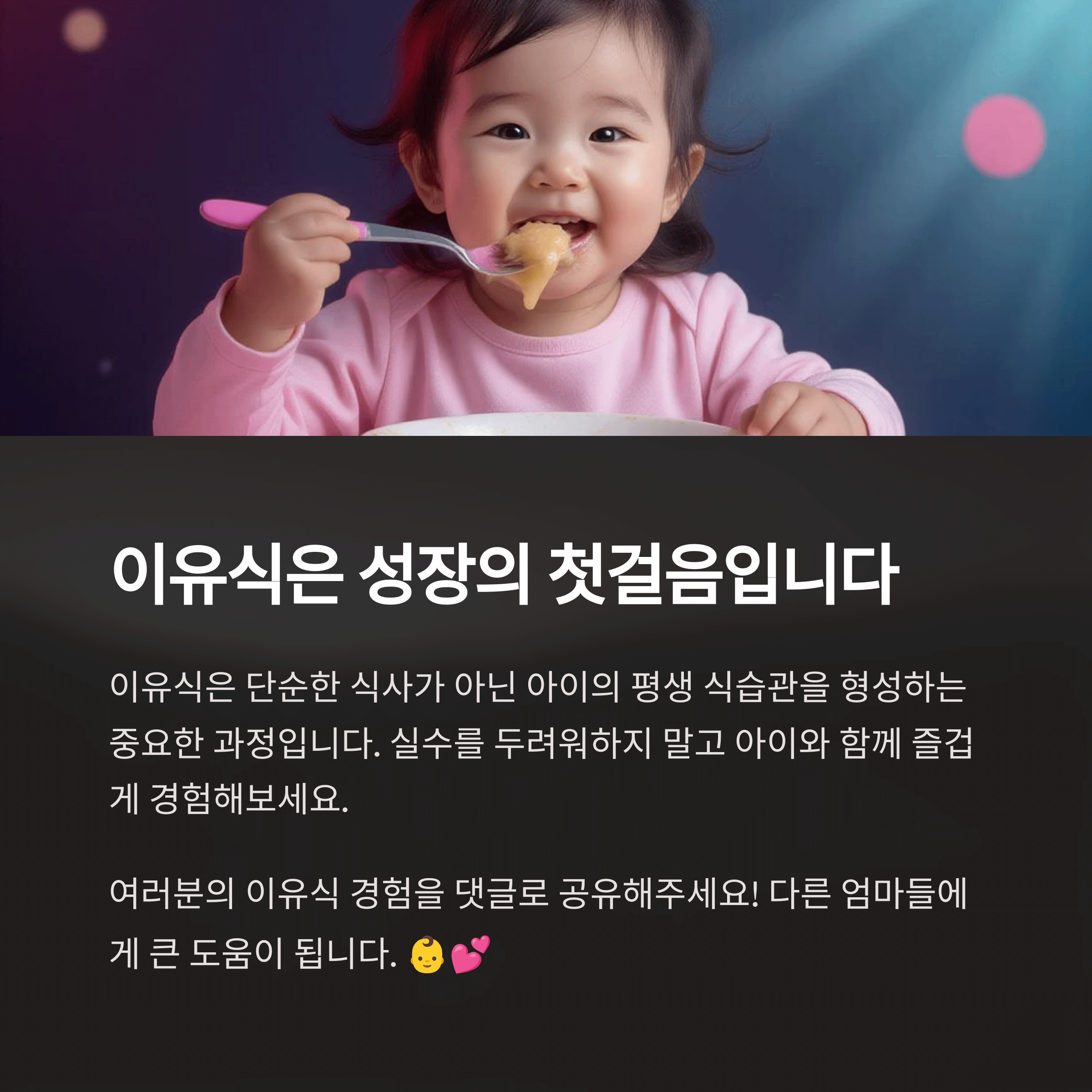 여러분은 이유식에서 어떤 부분이 가장 어려우셨나요? 또는 나만의 꿀팁이 있다면 댓글로 꼭 공유해주세요. 함께 나누면 더 큰 도움이 됩니다!