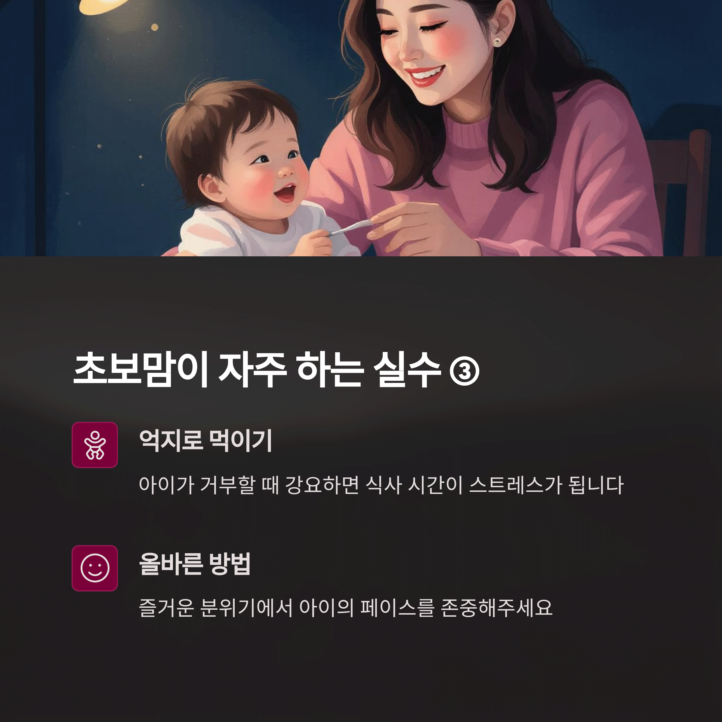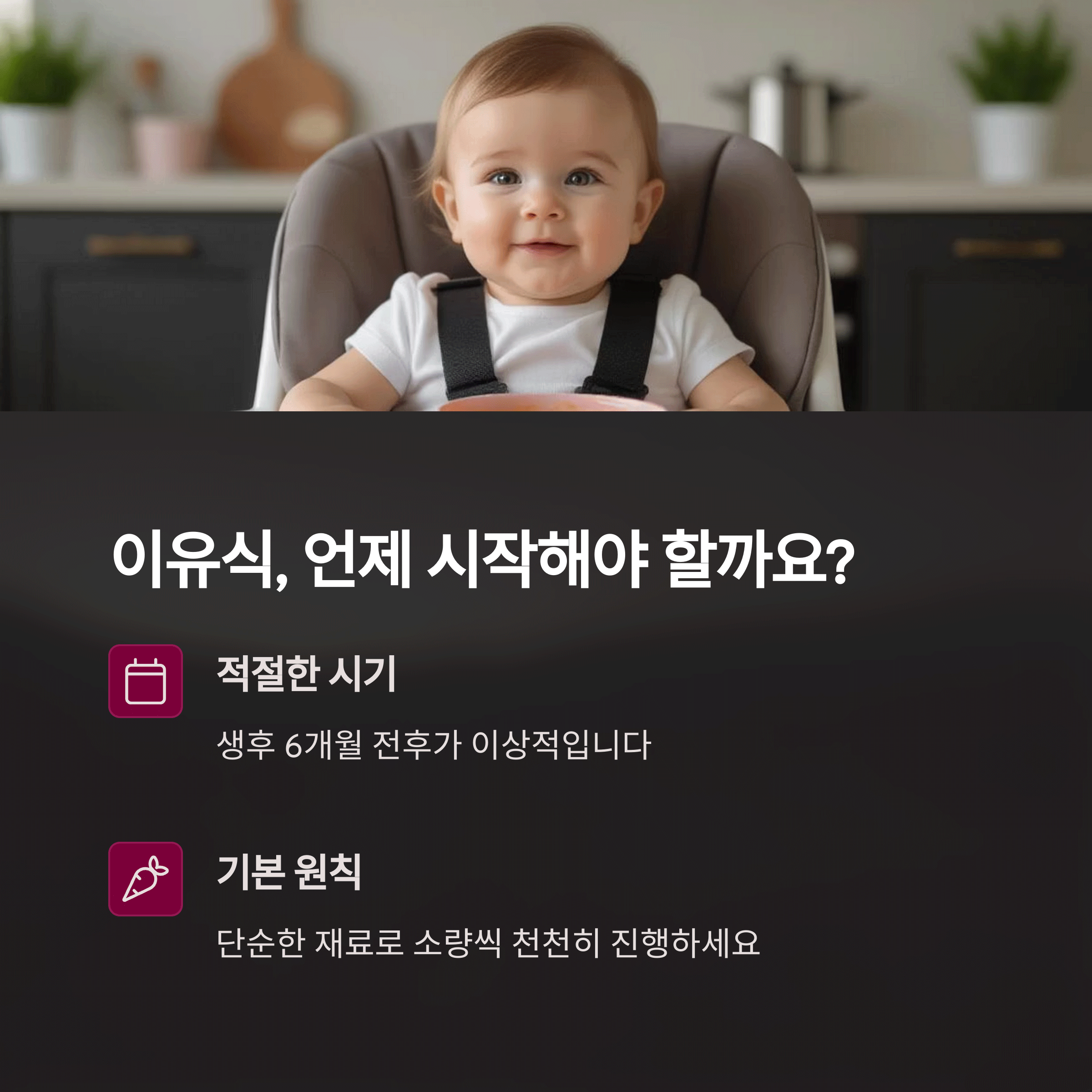 | 생후 6개월 전후가 가장 안전한 시기입니다. | 재료는 한 가지씩 천천히 추가하는 게 좋아요. | 긍정적인 경험이 평생 식습관에 영향을 줍니다. |