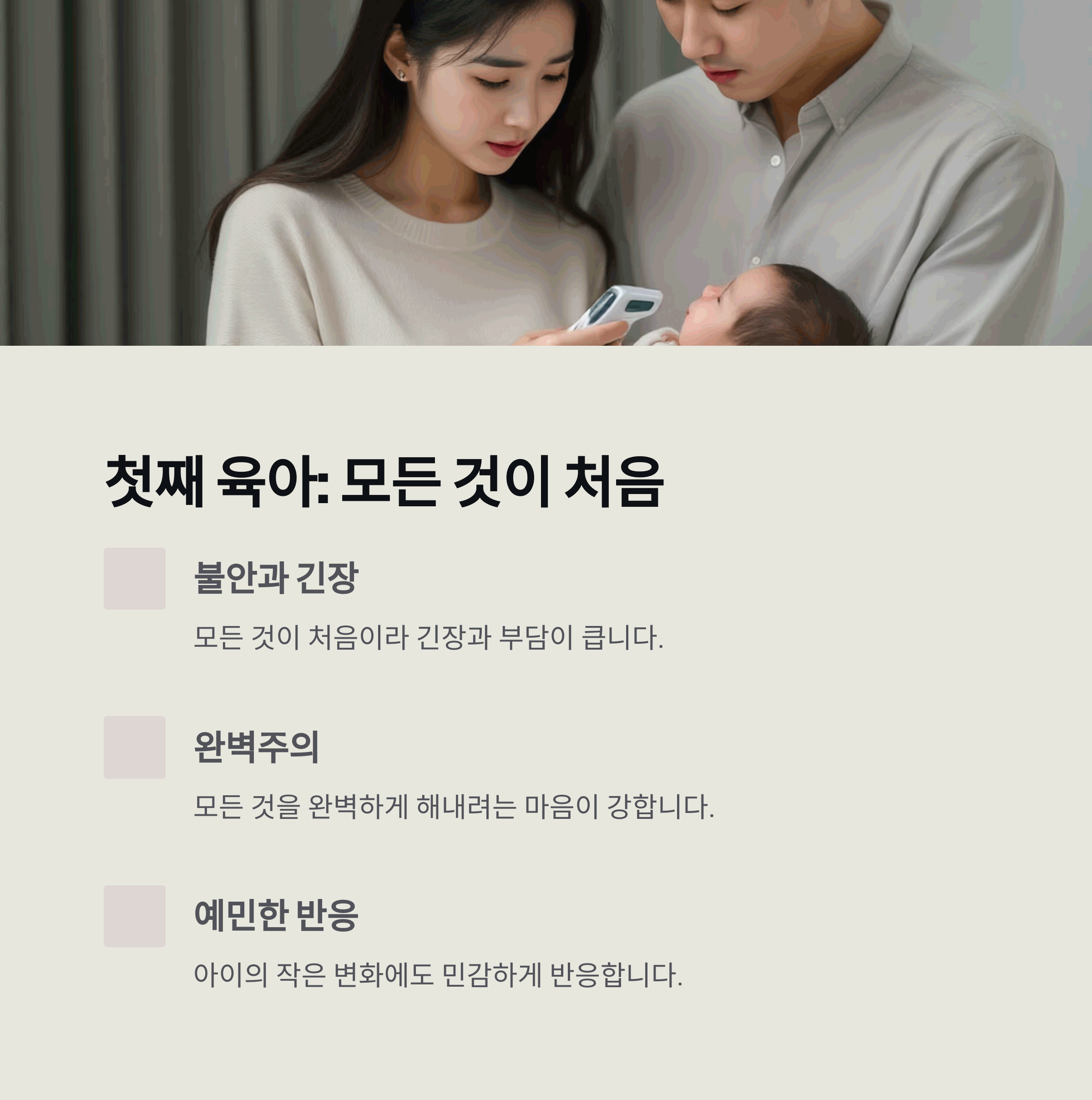 | 첫째 육아의 특징 | 모든 순간이 처음이라 긴장과 걱정이 큽니다. |