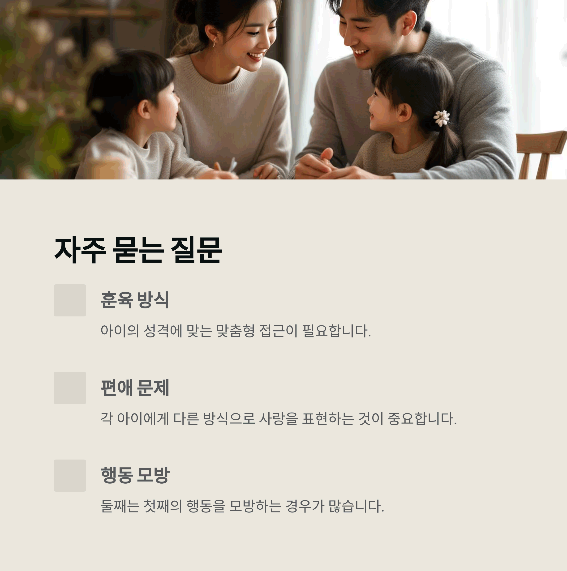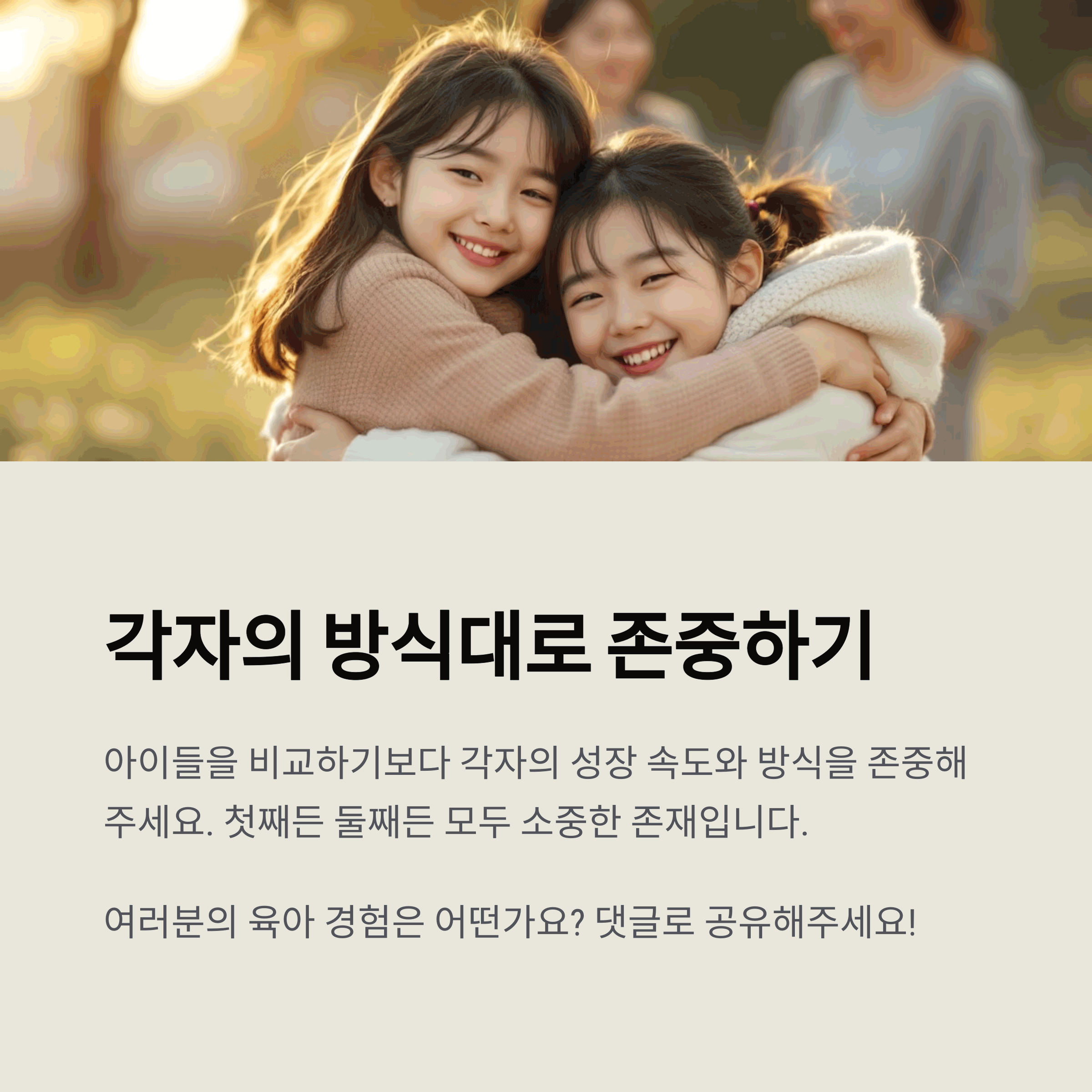 여러분은 첫째와 둘째 육아에서 어떤 차이를 느끼셨나요? 각자의 경험을 댓글로 나누어주시면, 더 많은 부모님들에게 큰 도움이 됩니다. 공감되셨다면 공감 버튼과 공유도 잊지 마세요!