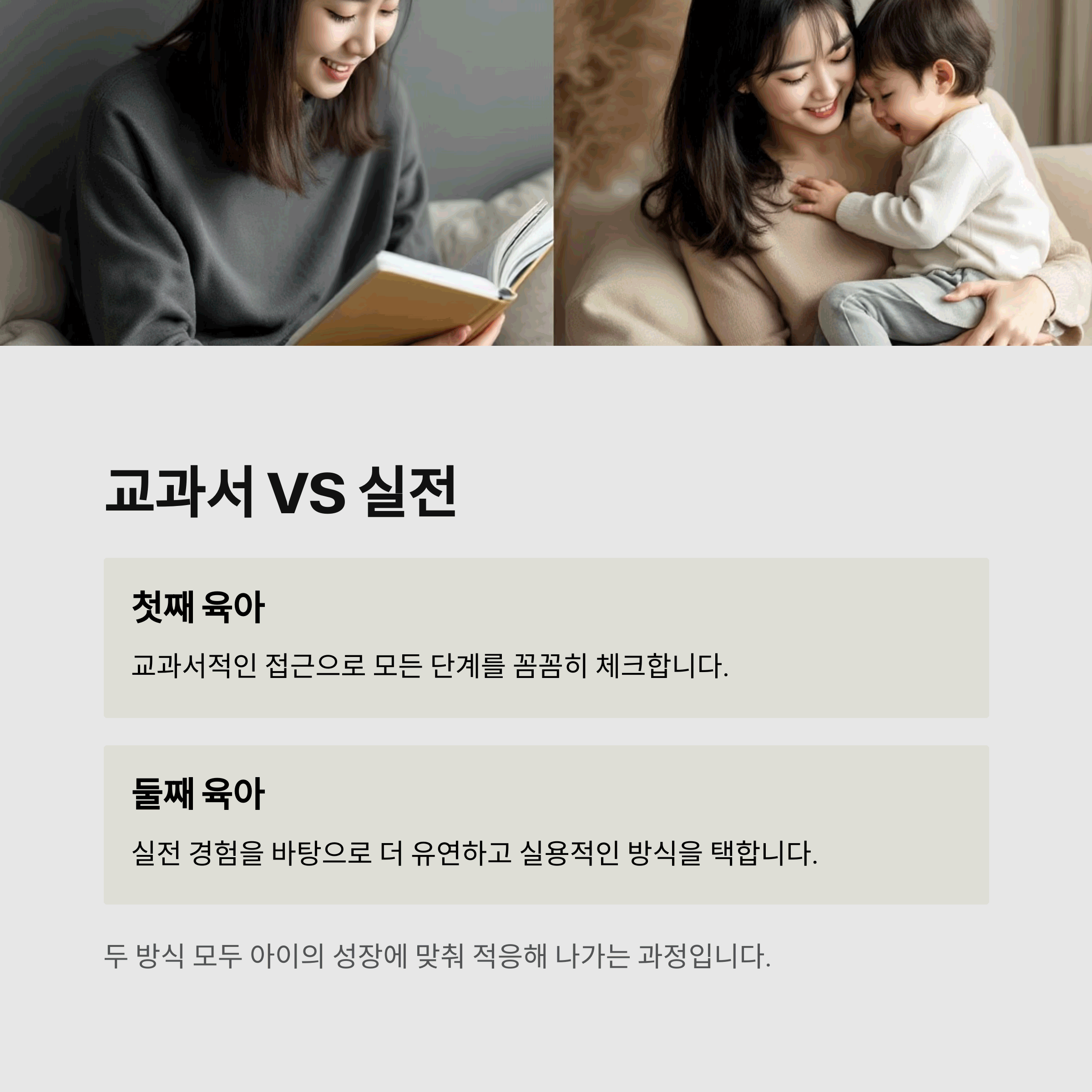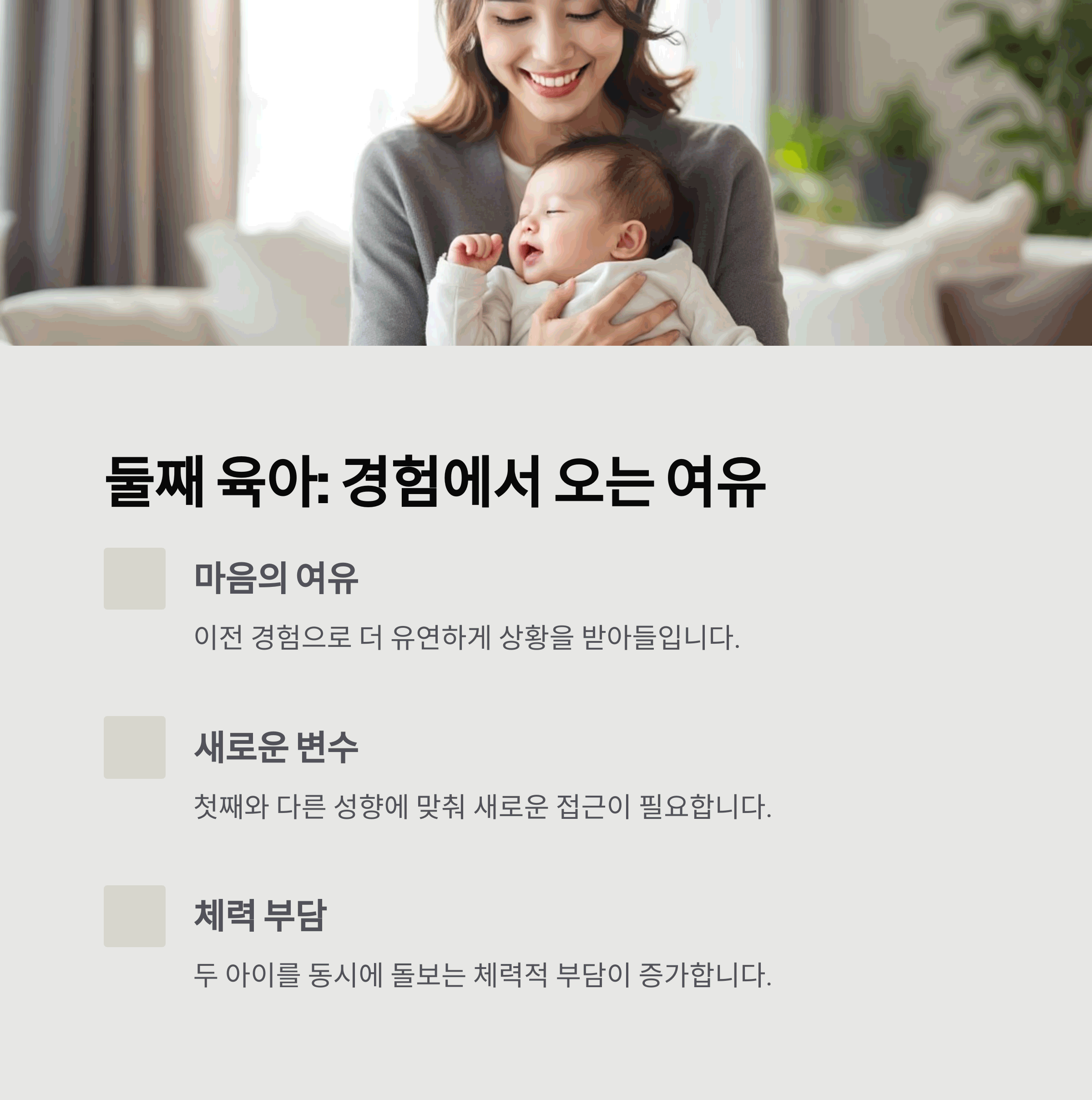 | 둘째 육아의 특징 | 경험에서 오는 여유와 예측불가한 변수들이 혼재합니다. |