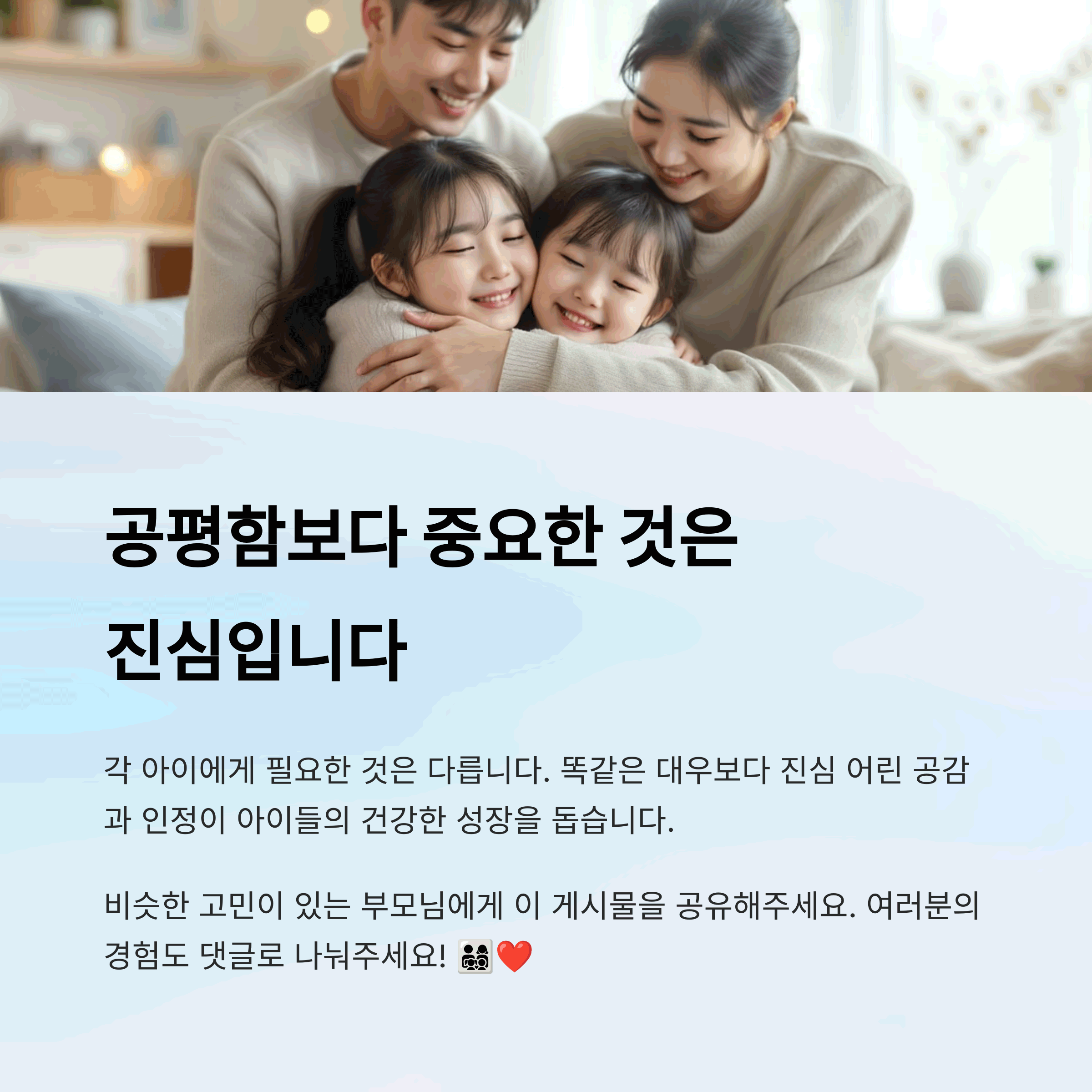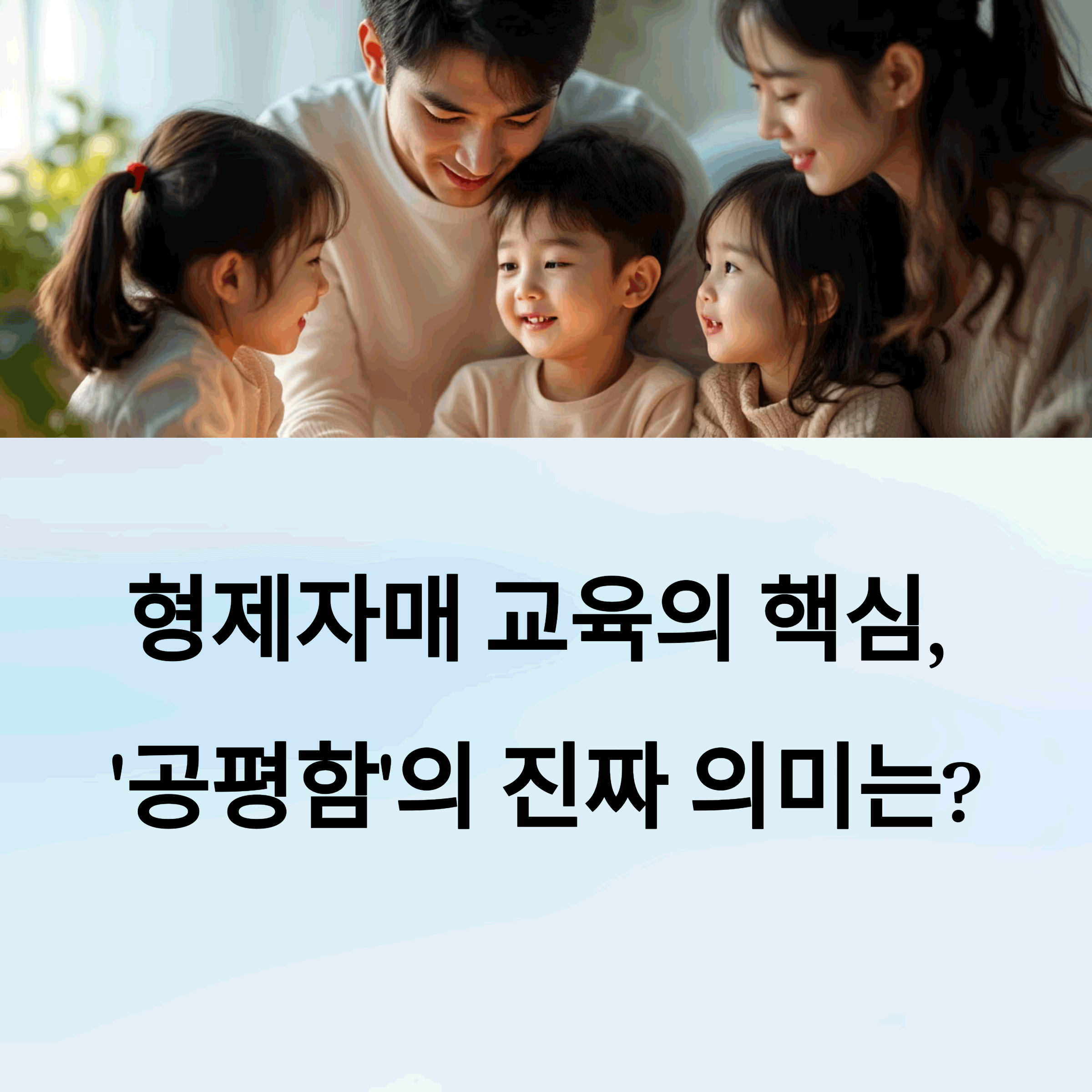 형제자매를 키우며 고민해본 적 있으신가요? 공평함에 대한 여러분만의 기준이나 경험이 있다면 댓글로 나눠주세요. 또 궁금한 주제가 있다면 알려주세요! 함께 나누는 이야기가 더욱 큰 배움이 됩니다.