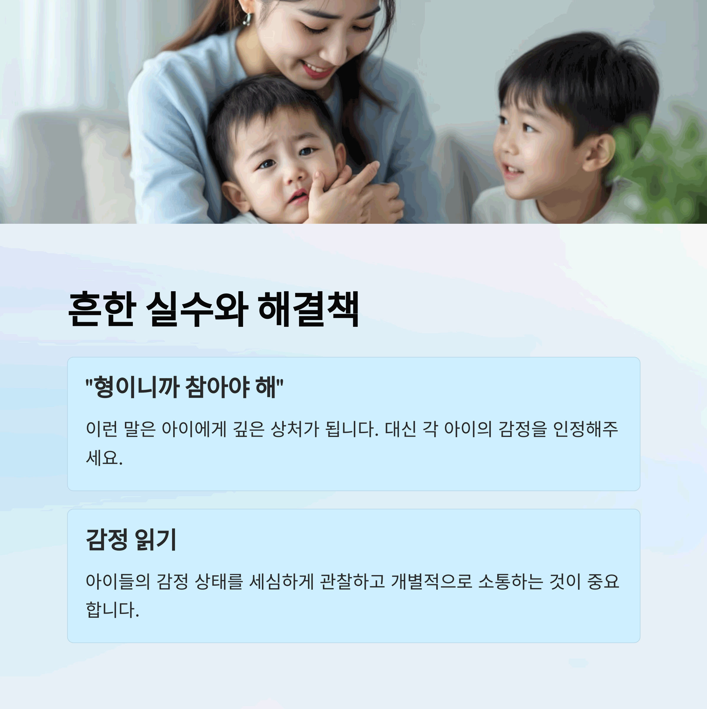 | 비교보다 개별적인 인정이 핵심 | 감정 언어로 교감하기 | 각 아이의 필요를 파악하는 관찰력 |