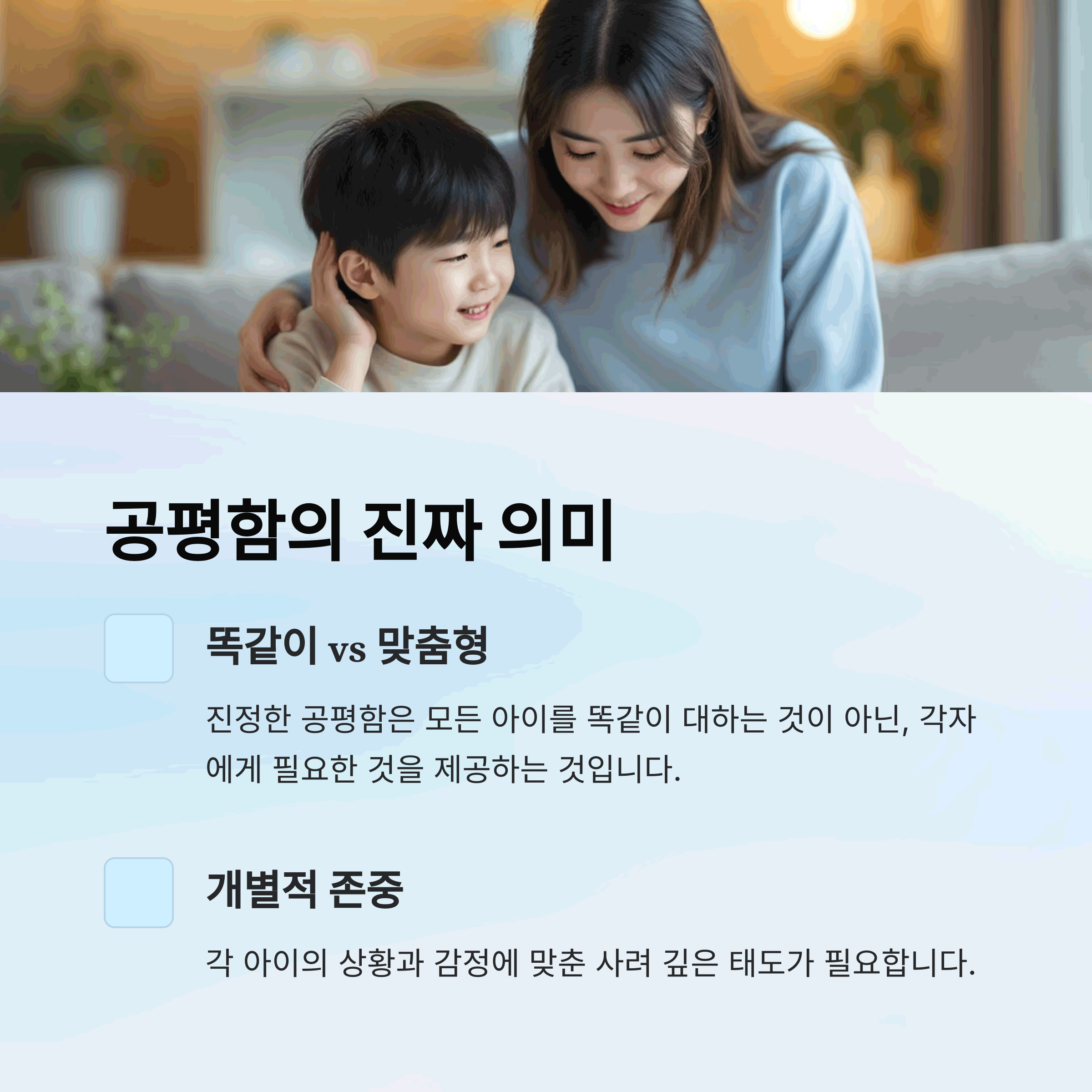 | 똑같이 주는 것보다, 다르게 공감하는 것 | 아이의 감정 상태에 맞는 소통 | 상황에 맞춰 차별이 아닌 맞춤 대응 |