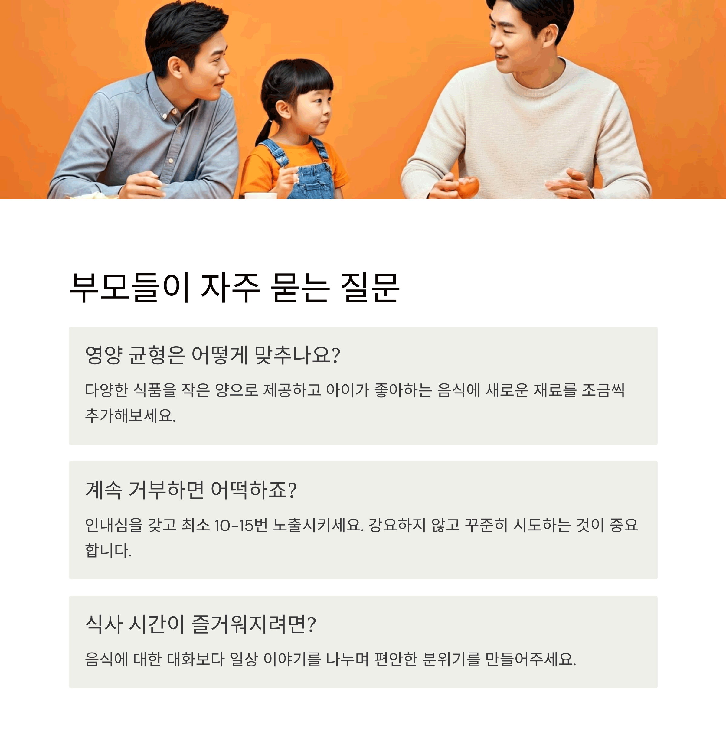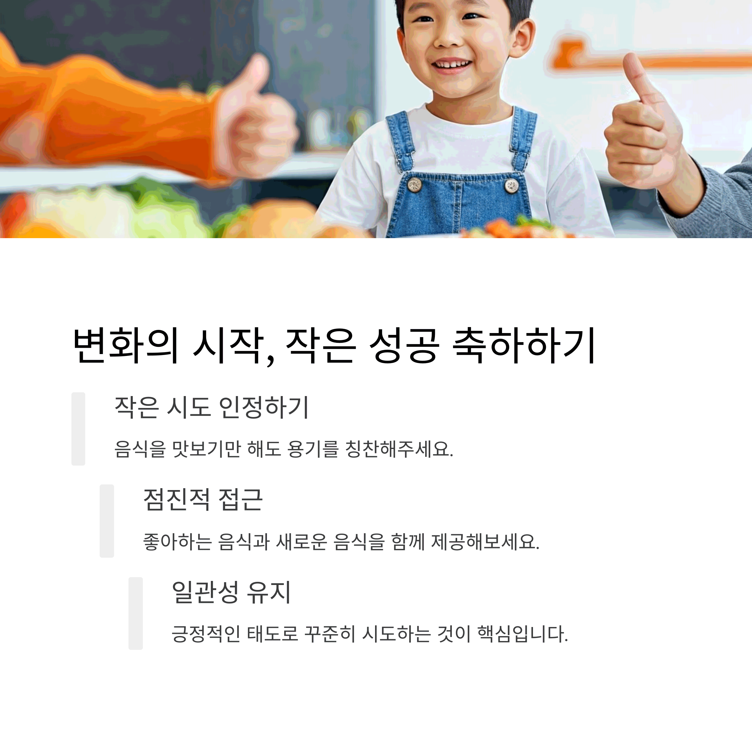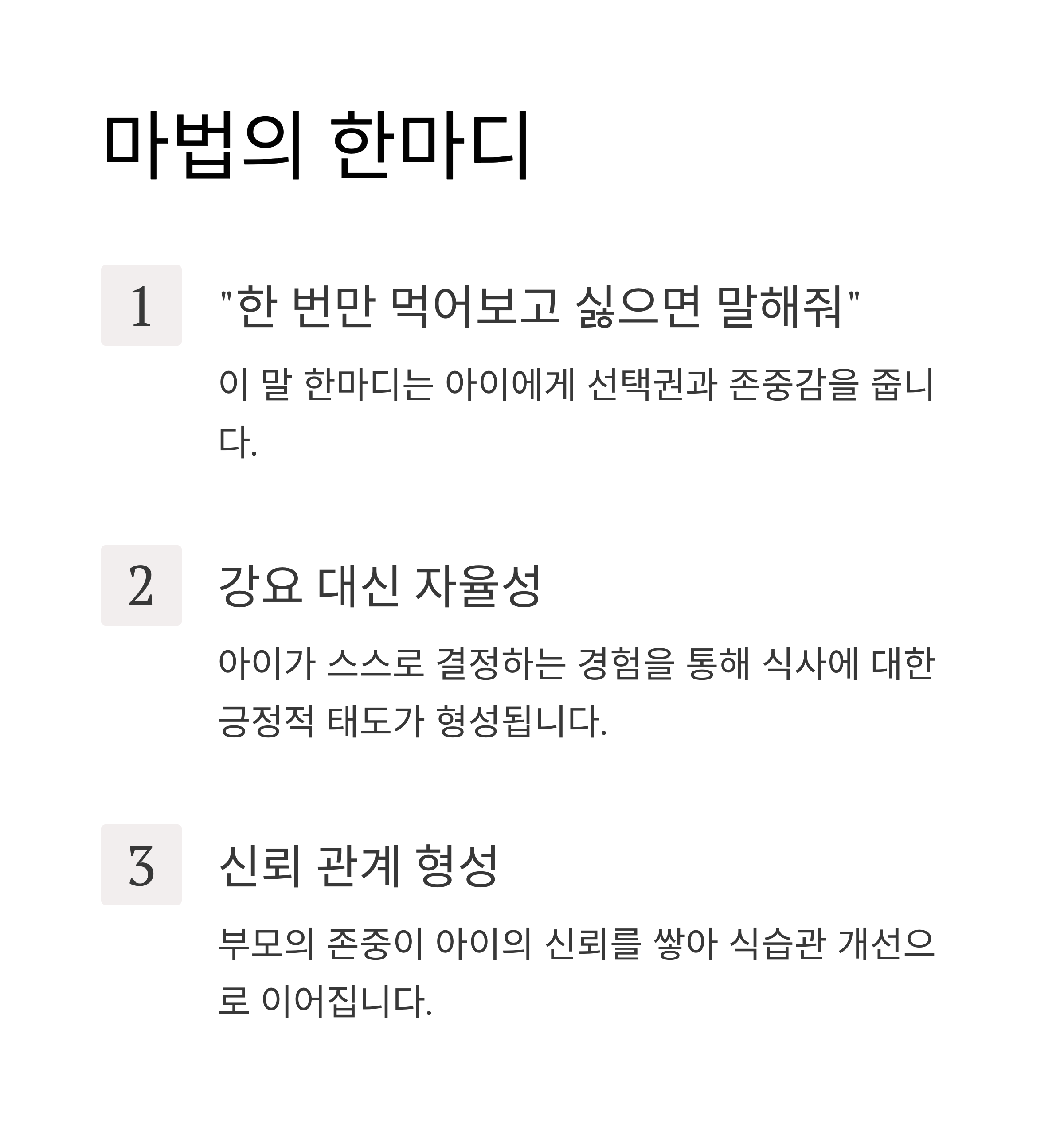 | 향, 식감, 시각적 거부감 등 다양한 심리적 요인 | “한 번만 먹어보고 싫으면 말해줘”로 유도 | 긍정적 식사 경험과 칭찬으로 습관 개선 |